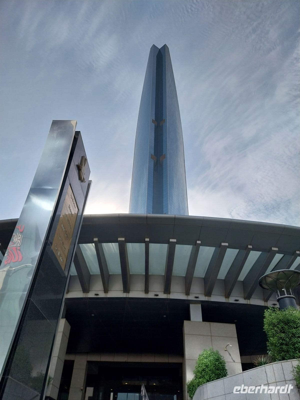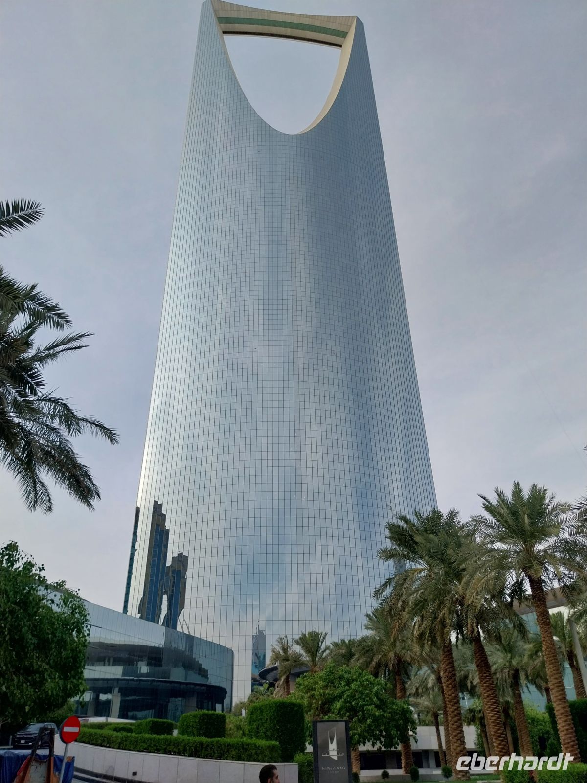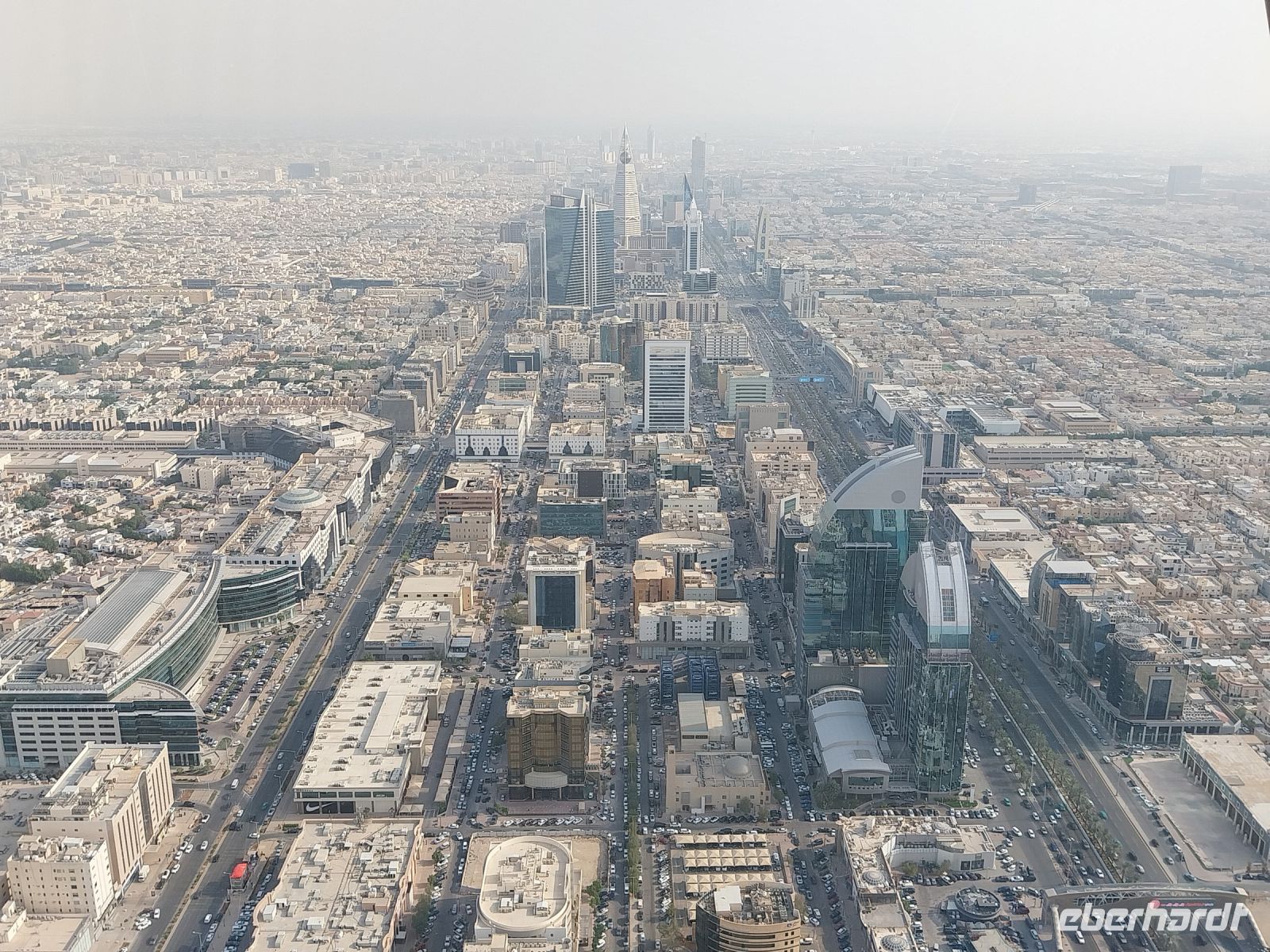 Anschließend besuchen wir die Skybridge des 302 Meter hohen Kingdom Tower, Wahrzeichen Riads. Die Aussicht auf die 9 Millionen Metropole ist, wie meistens, etwas diesig, aber bis zu den Wolkenkratzern des Finanzdistriktes im Norden und der Skyline im Süden mit dem markanten Faisaliyah Tower (der Turm mit der großen goldenen Kugel, Architekt Norman Foster) kann man schauen.