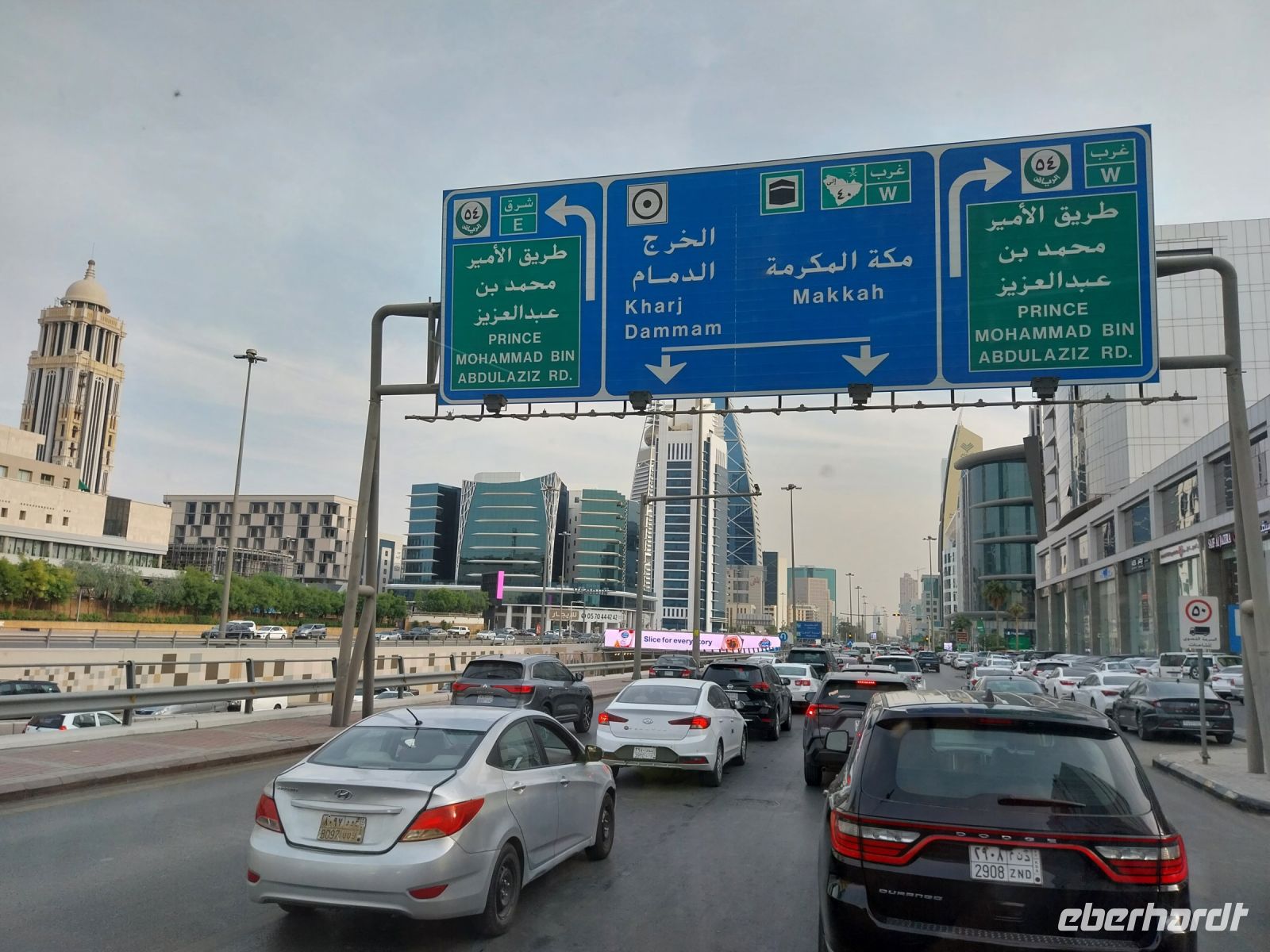 In Riad zeigen wir unser 150 EUR Visum vor, geben unsere Fingerabdrücke ab und werden fotografiert. Dann ist es auch schon geschafft. Salam aleikum Saudi Arabien! Fawaz, deutsch sprechender Reiseleiter aus dem Sudan stammend, erwartet uns mit Eberhardt-Schild. Nachdem wir Geld getauscht haben, geht es in die saudische Hauptstadt ins Hotel. Für Hungrige steht hier noch das Abendbuffet zur Verfügung.