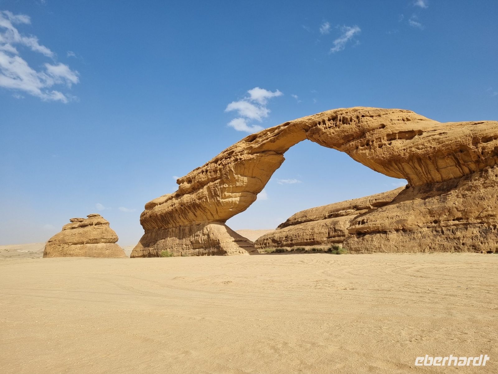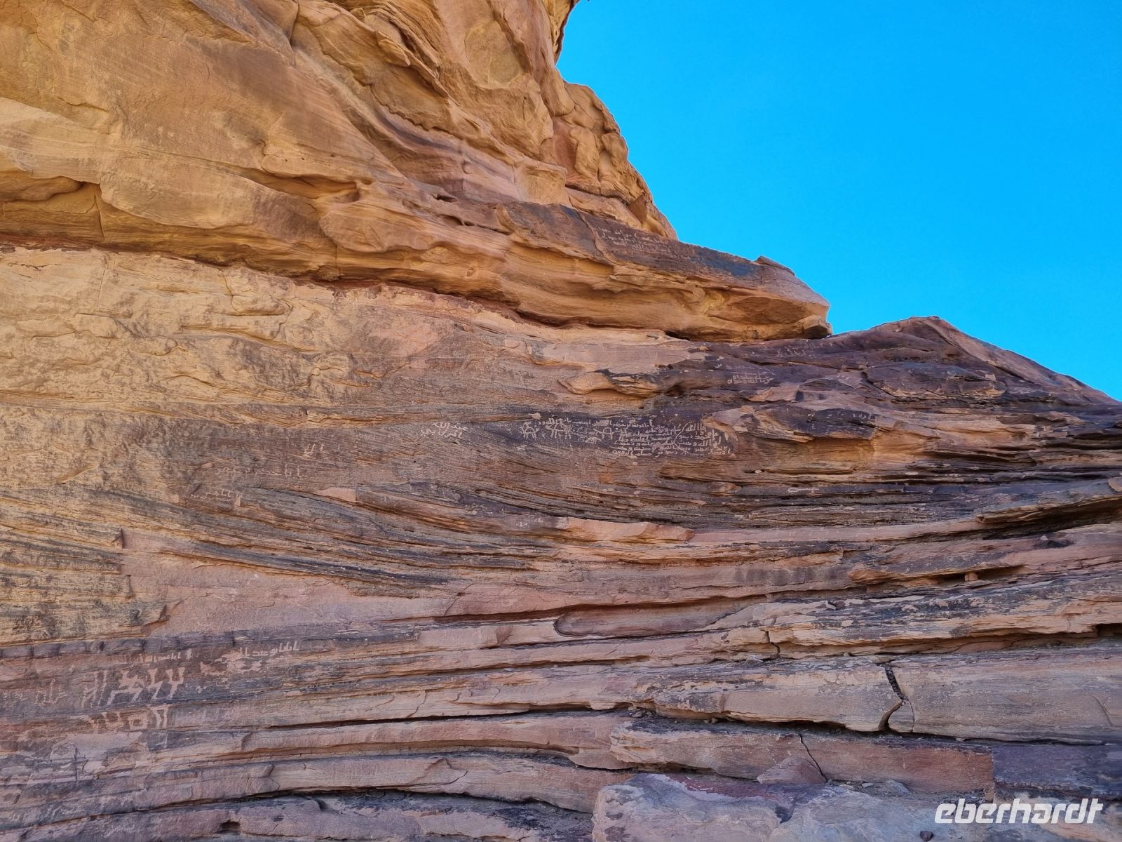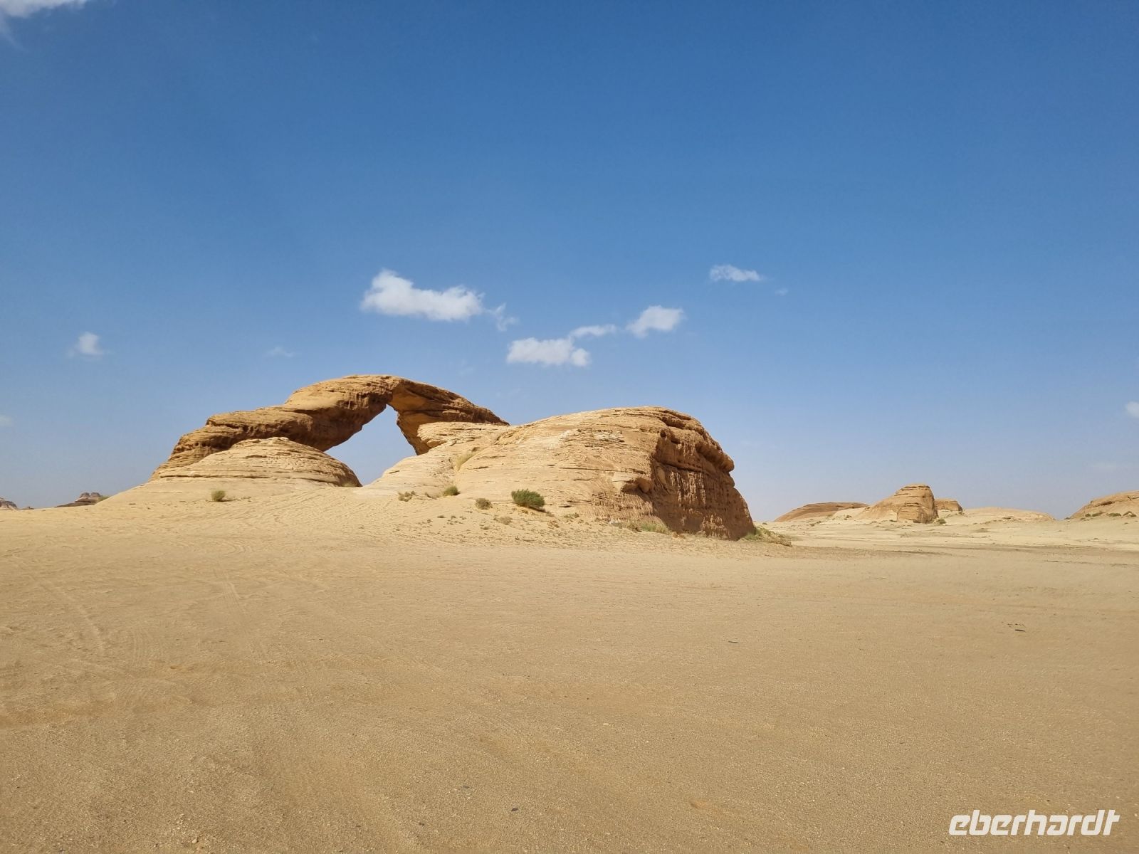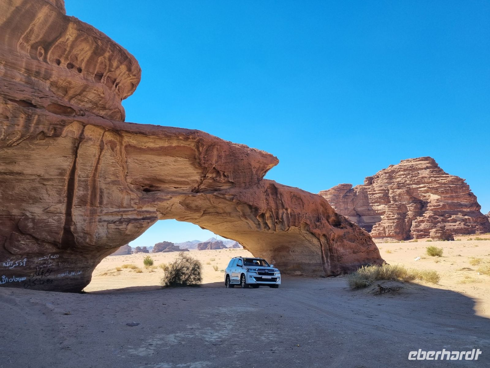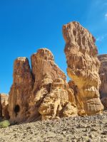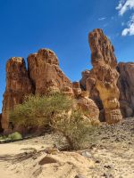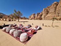 Für unseren heutigen Ausflug stiegen wir komplett auf Geländewagen um. Um 9 Uhr wurden wir abgeholt, um zunächst auf eine kleine Entdeckungstour durch die Militärstadt Tabuk zu gehen. Zuerst stoppten wir am alten Bahnhof der Hedschas-Bahn. Geplant wurde sie vom Osmanischen Reich, um Pilgern die Fahrt von Damaskus nach Mekka zu erleichtern. In nur acht Jahren Bauzeit wurde die Strecke quer durch die Wüste bis Medina 1908 vollendet. Im hiesigen Museum erfuhren wir zahlreiche Details zur interessanten Geschichte der sich heute leider nicht mehr in Betrieb befindlichen Bahnlinie. Wenig später erreichten wir die osmanische Burg von Tabuk aus dem 16. Jahrhundert. Diese Festung wurde gebaut, um die Wasserstation zu schützen und Sicherheit zu bieten, da sie eine der Stationen auf der syrischen Hadsch-Straße war, die die Pilger willkommen hieß. Weiter gelangten wir mit unseren Gelände-Jeeps in das westlich von Tabuk gelegene Wadi Al Lawz. Schon auf der Fahrt dorthin konnten wir gigantische Gesteinsformationen inmitten der Wüste ausmachen. Wadi Al Lawz ist übrigens eine 30 Millionen Jahre alte geologische Verwerfung, eine bizarre und legendäre Wüstenlandschaft mit den erstaunlichsten Granit- und Sandstein-Formationen. Nicht zu Unrecht ein UNESCO-Weltnaturerbe der Menschheit, wo man wunderbar wandern und klettern kann. Wir hatten ausreichend Zeit, das Wadi mittels unserer Jeeps zu erkunden und die unnachahmliche Landschaft bzw. auch die in ihr wohnende Stille zu genießen. Unterwegs begegneten uns zahlreiche Kamele und Höhepunkt war mit Sicherheit der Aufenthalt in einer der zahlreichen Schluchten, wo wir auch unser Mittags-Picknick einnahmen und das schmeckte hier inmitten der überwältigenden Kulisse besonders gut. Zum Abschluss des Tages besichtigten wir dann noch die vermeintliche Stelle, an der Moses seinen Stab am Felsen geschlagen haben soll, um Wasser aus 12 Quellen des Felses fließen zu lassen, sodass die zwölf Stämme und ihr Vieh genügend Wasser fänden. Auch der Platz, an dem das Ereignis mit dem Goldenen Kalb stattgefunden haben soll, gehörte zum heutigen Programm. Tief beeindruckt kehrten wir am Abend nach Tabuk zurück, wo wir uns zum Abendessen im Restaurant „Loban" mit arabischen Köstlichkeiten verwöhnen ließen. Ein langer und erlebnisreicher Tag ging hier zu Ende.