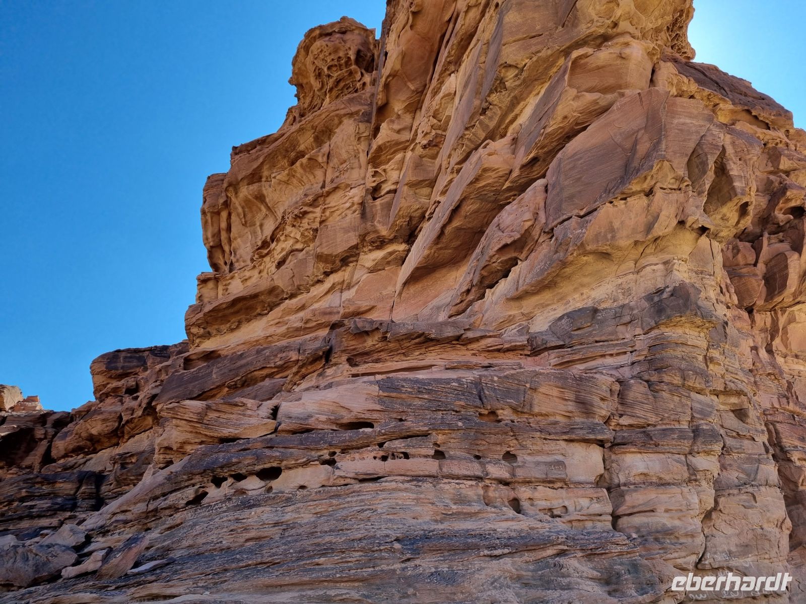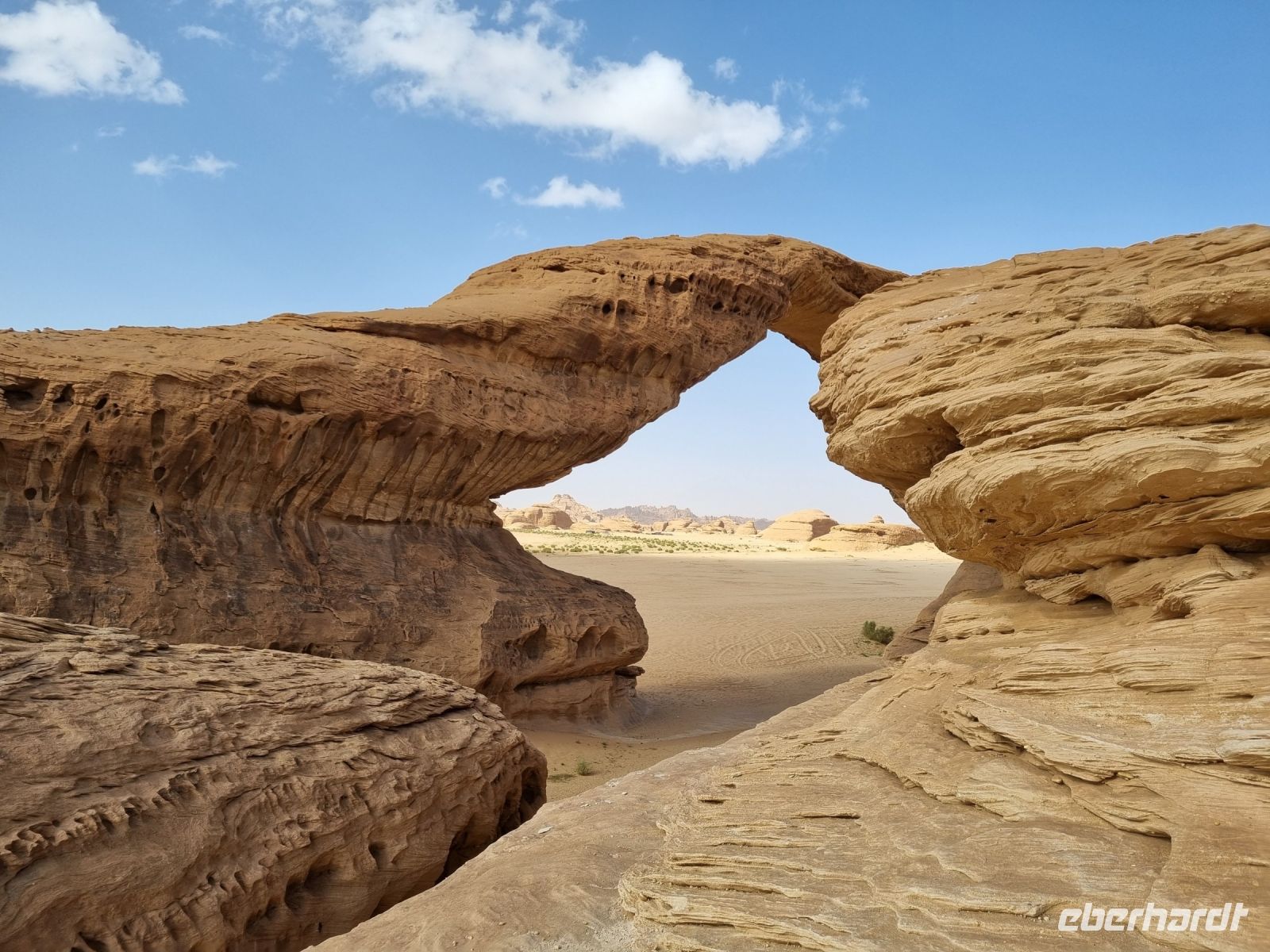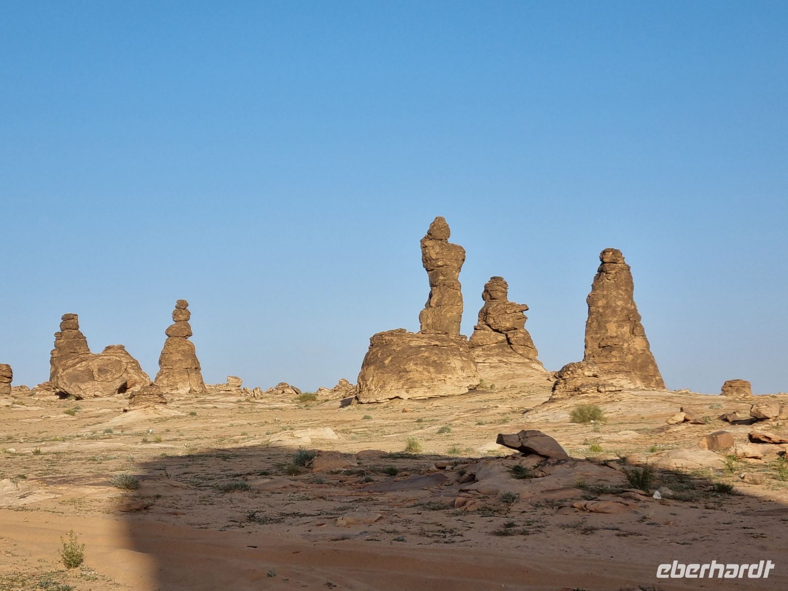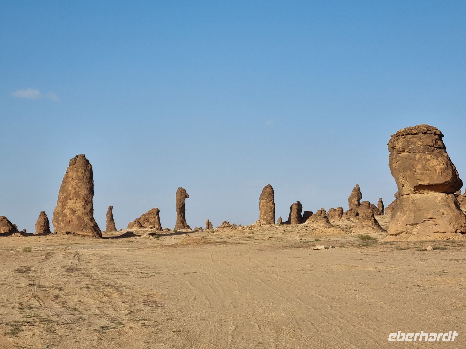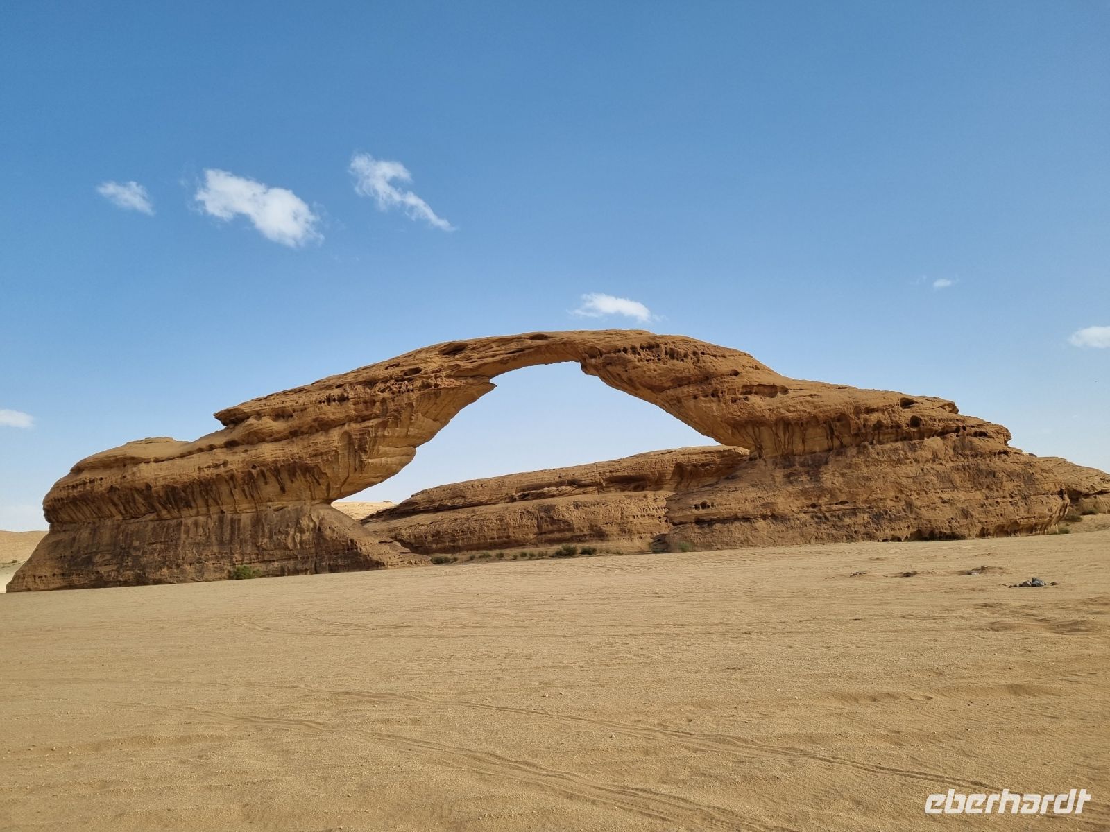 Für unseren heutigen Ausflug stiegen wir komplett auf Geländewagen um. Um 9 Uhr wurden wir abgeholt, um zunächst auf eine kleine Entdeckungstour durch die Militärstadt Tabuk zu gehen. Zuerst stoppten wir am alten Bahnhof der Hedschas-Bahn. Geplant wurde sie vom Osmanischen Reich, um Pilgern die Fahrt von Damaskus nach Mekka zu erleichtern. In nur acht Jahren Bauzeit wurde die Strecke quer durch die Wüste bis Medina 1908 vollendet. Im hiesigen Museum erfuhren wir zahlreiche Details zur interessanten Geschichte der sich heute leider nicht mehr in Betrieb befindlichen Bahnlinie. Wenig später erreichten wir die osmanische Burg von Tabuk aus dem 16. Jahrhundert. Diese Festung wurde gebaut, um die Wasserstation zu schützen und Sicherheit zu bieten, da sie eine der Stationen auf der syrischen Hadsch-Straße war, die die Pilger willkommen hieß. Weiter gelangten wir mit unseren Gelände-Jeeps in das westlich von Tabuk gelegene Wadi Al Lawz. Schon auf der Fahrt dorthin konnten wir gigantische Gesteinsformationen inmitten der Wüste ausmachen. Wadi Al Lawz ist übrigens eine 30 Millionen Jahre alte geologische Verwerfung, eine bizarre und legendäre Wüstenlandschaft mit den erstaunlichsten Granit- und Sandstein-Formationen. Nicht zu Unrecht ein UNESCO-Weltnaturerbe der Menschheit, wo man wunderbar wandern und klettern kann. Wir hatten ausreichend Zeit, das Wadi mittels unserer Jeeps zu erkunden und die unnachahmliche Landschaft bzw. auch die in ihr wohnende Stille zu genießen. Unterwegs begegneten uns zahlreiche Kamele und Höhepunkt war mit Sicherheit der Aufenthalt in einer der zahlreichen Schluchten, wo wir auch unser Mittags-Picknick einnahmen und das schmeckte hier inmitten der überwältigenden Kulisse besonders gut. Zum Abschluss des Tages besichtigten wir dann noch die vermeintliche Stelle, an der Moses seinen Stab am Felsen geschlagen haben soll, um Wasser aus 12 Quellen des Felses fließen zu lassen, sodass die zwölf Stämme und ihr Vieh genügend Wasser fänden. Auch der Platz, an dem das Ereignis mit dem Goldenen Kalb stattgefunden haben soll, gehörte zum heutigen Programm. Tief beeindruckt kehrten wir am Abend nach Tabuk zurück, wo wir uns zum Abendessen im Restaurant „Loban" mit arabischen Köstlichkeiten verwöhnen ließen. Ein langer und erlebnisreicher Tag ging hier zu Ende.