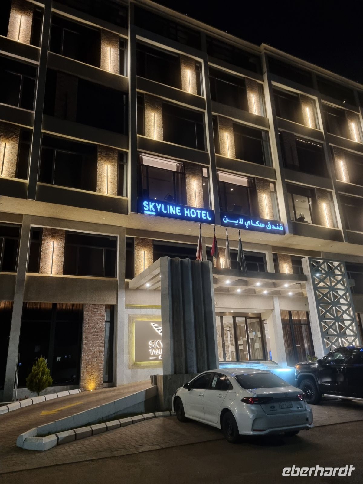 Nach dem Frühstück besuchten wir das moderne Nationalmuseum in Riad, das in Farbe und Form an die Wüstenlandschaft um Riad erinnert und im Jahre 1999 eröffnet wurde. Es zeigt die Geschichte Arabiens von den Anfängen bis heute. Der benachbarte Palast hatte leider heute kurzfristig geschlossen und somit vertagten wir diesen Besuch auf den letzten Tag. Nun führte uns unsere Stadtrundfahrt weiter bis zum neuen King Abdullah Financial District, einem der größten und bedeutendsten Projekte Saudi-Arabiens. Auf einer Fläche von etwa 160 Hektar wurden zahlreiche Wohn-, Finanz- und Handelstürme errichtet. Des Weiteren gibt es hier auch die entsprechenden Wohn- und Lebensstrukturen wie Schulen, Erholungsbereiche und Krankenhäuser. Wir flanierten durch dieses interessante Viertel und bestaunten die moderne Architektur. Weiter ging es anschließend zum im Zentrum gelegenen, modernen Einkaufsviertel von Riad, dem Kingdom Center. Der erste Wolkenkratzer Saudi-Arabiens, der im Jahre 2002 fertig gestellt wurde, beherbergt mit seinen 99 Stockwerken in seinem 302 Meter hohen Turm zahlreiche Kaufhäuser, Büros, Luxus-Appartements und ein 5-Sterne-Hotel. Das Highlight des Turms ist seine 65 Meter hohe Sky Bridge, die sich auf dem Wolkenkratzer befindet. Es hat die Form eines geschlossenen Korridors mit Fenstern auf beiden Seiten. Natürlich durfte der Besuch des Turmes auch für uns nicht fehlen und so nahmen wir zwei Aufzüge, um die Brücke zu erreichen und genossen einen bemerkenswerten Blick auf die Skyline von Riad, der von keinem anderen Ort aus zu sehen ist. Mit diesen ersten tollen Eindrücken im Gepäck ging es nun zum nördlich von Riad gelegenen Flughafen, um am Abend nach Tabuk im Nordwesten des Landes weiter zu fliegen. Interessant für uns war übrigens auch die Tatsache, dass bei den saudischen Fluggesellschaften vor Abflug gebetet wird... Nach einem knapp 2-stündigen Flug erreichten wir unser Ziel und kurz nach 22 Uhr auch unser Hotel „Skyline" in Tabuk.