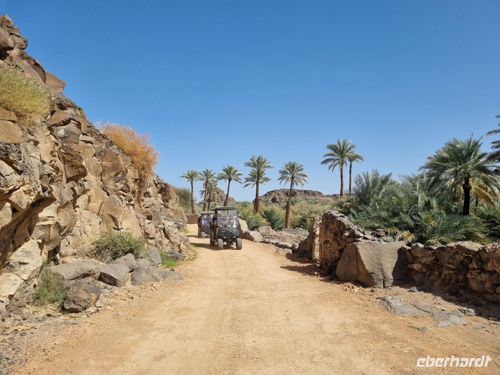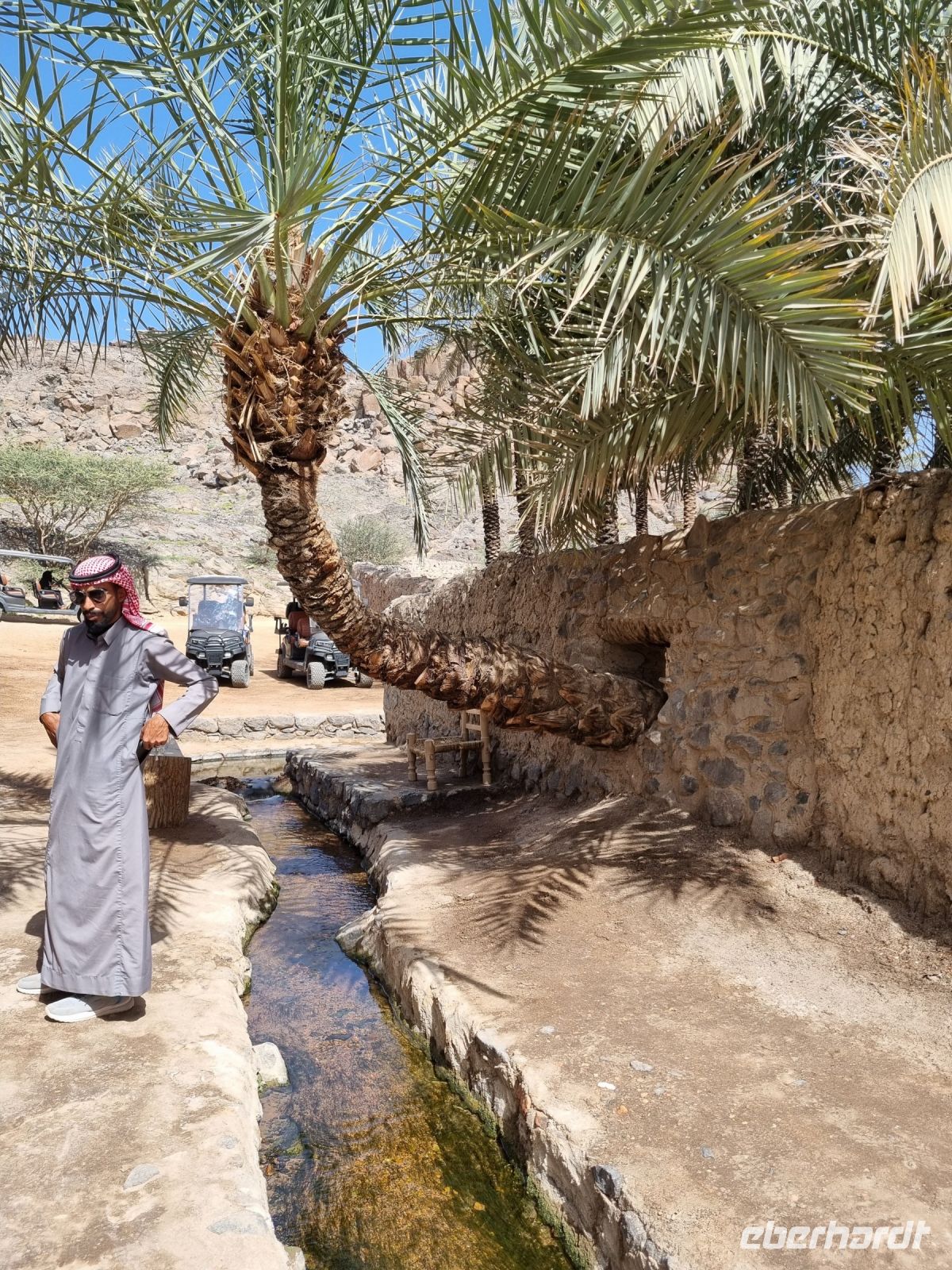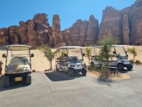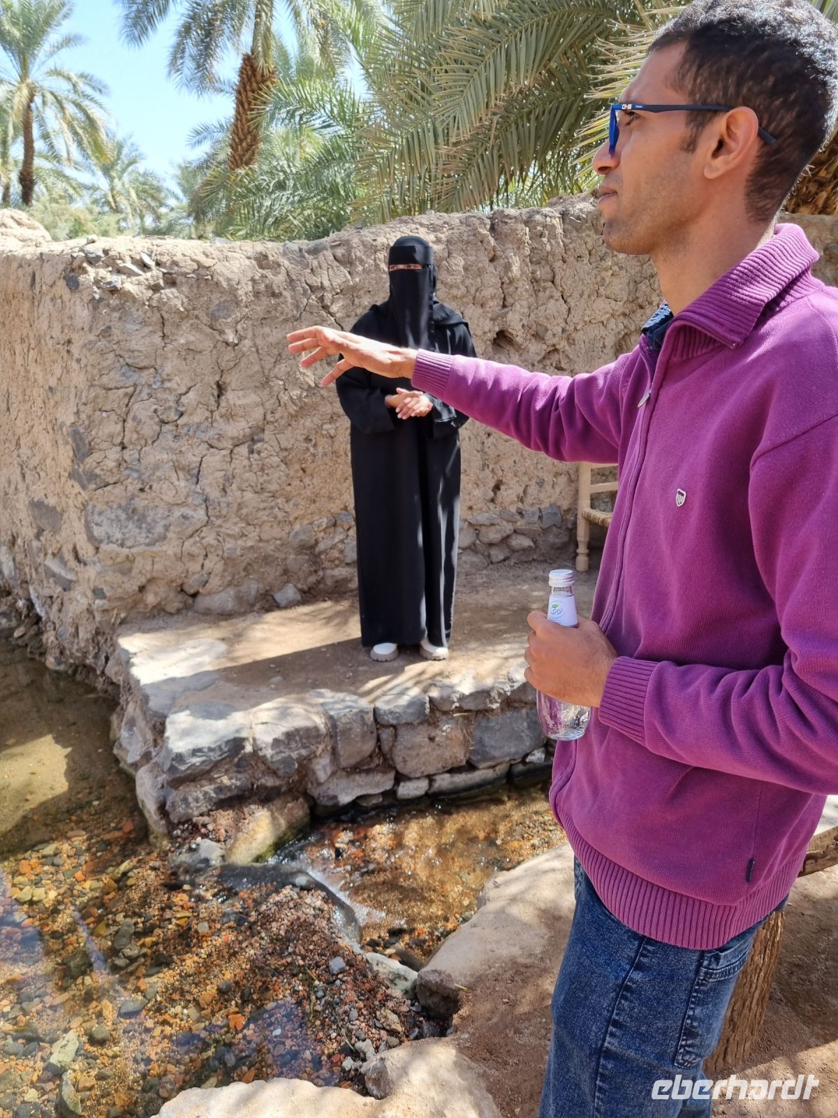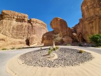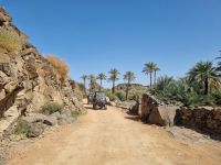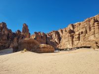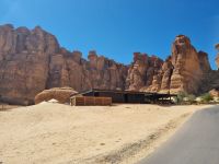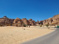 Heute hieß es erneut Koffer packen, denn unsere Reiseroute führte uns weiter südwärts. Nach einer etwa 3-stündigen Busfahrt, unterbrochen von kleinen Fotostopps, kamen wir im Wadi Al Disah an. Hier stiegen wir in „nostalgische" Toyota-Geländewagen um, manche hätten diese Autos sicherlich auch als „Schrottwagen" betitelt. Aber nichtsdestotrotz erfüllten diese Fortbewegungsmittel heute alle Voraussetzungen, um das malerische lange Tal aus sandigen Flussbetten mit kühlen, schattigen Palmen, umgeben von hoch aufragenden Steilhängen aus rotem Sandstein, atemberaubenden Canyon-Gipfeln und gesäumt von sprudelnden Süßwasserbächen und einer Oase zu entdecken. Die dramatischen Klippen beherbergen alte Höhlen, versteckte Gräber und entzückende jahrhundertealte Schriften und Kunstwerke von Menschen bzw. Tierfiguren. Inmitten dieser Umgebung nahmen wir erneut ein Mittags-Picknick auf einer der hier ansässigen Farmen ein. Am Nachmittag stand uns dann nochmals eine etwa knapp 3-stündige Busfahrt bevor, um unser Quartier für die nächsten drei Nächte, dass „Sahary AlUla Resort" inmitten der schier endlosen Wüstenlandschaft zu erreichen.