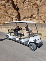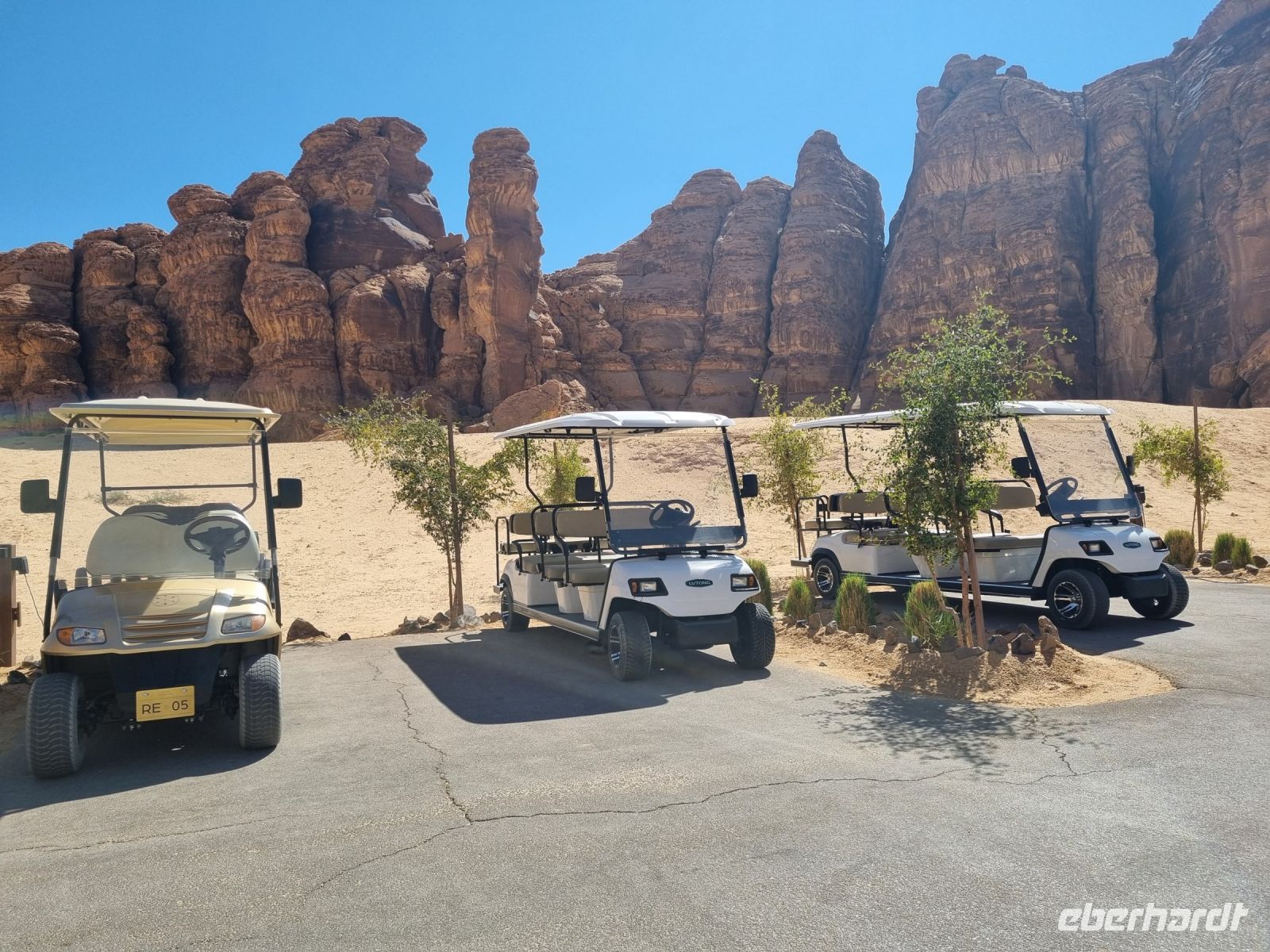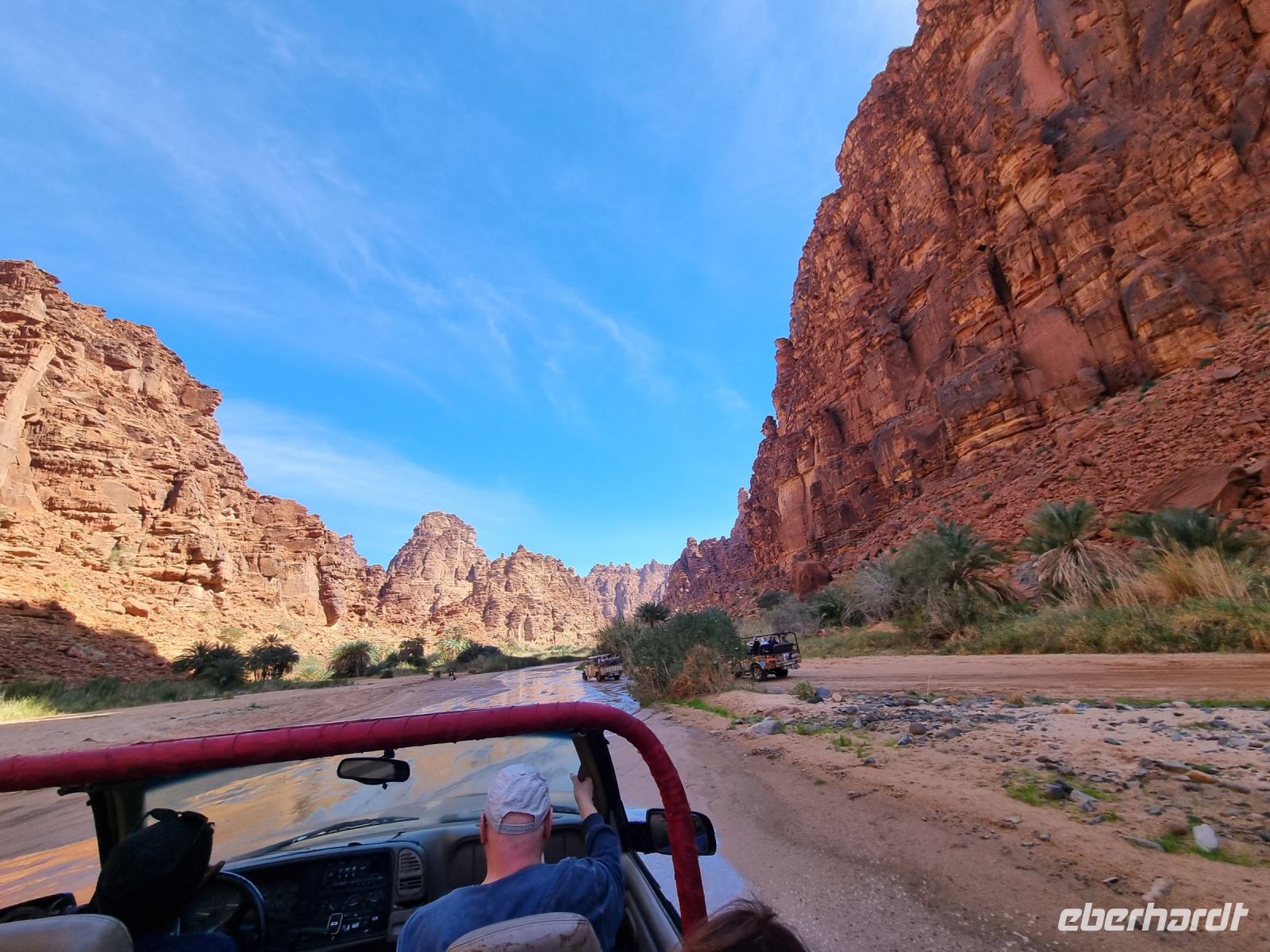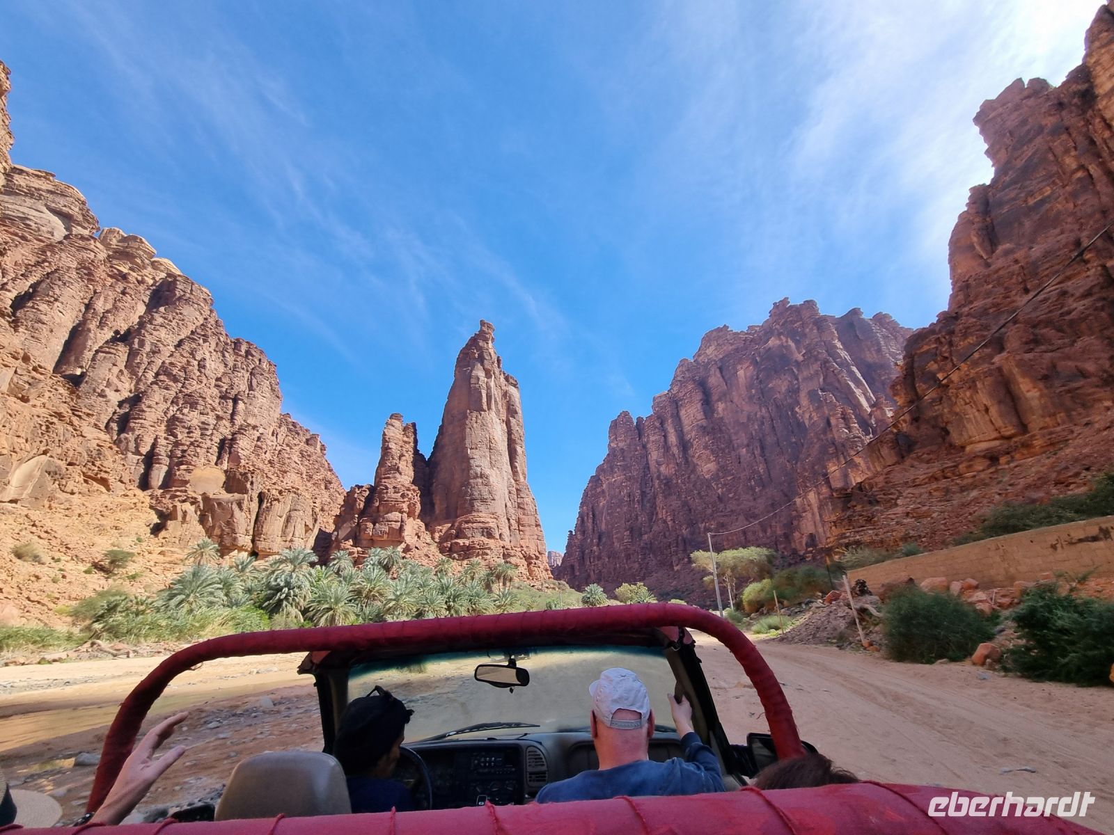 Heute hieß es erneut Koffer packen, denn unsere Reiseroute führte uns weiter südwärts. Nach einer etwa 3-stündigen Busfahrt, unterbrochen von kleinen Fotostopps, kamen wir im Wadi Al Disah an. Hier stiegen wir in „nostalgische" Toyota-Geländewagen um, manche hätten diese Autos sicherlich auch als „Schrottwagen" betitelt. Aber nichtsdestotrotz erfüllten diese Fortbewegungsmittel heute alle Voraussetzungen, um das malerische lange Tal aus sandigen Flussbetten mit kühlen, schattigen Palmen, umgeben von hoch aufragenden Steilhängen aus rotem Sandstein, atemberaubenden Canyon-Gipfeln und gesäumt von sprudelnden Süßwasserbächen und einer Oase zu entdecken. Die dramatischen Klippen beherbergen alte Höhlen, versteckte Gräber und entzückende jahrhundertealte Schriften und Kunstwerke von Menschen bzw. Tierfiguren. Inmitten dieser Umgebung nahmen wir erneut ein Mittags-Picknick auf einer der hier ansässigen Farmen ein. Am Nachmittag stand uns dann nochmals eine etwa knapp 3-stündige Busfahrt bevor, um unser Quartier für die nächsten drei Nächte, dass „Sahary AlUla Resort" inmitten der schier endlosen Wüstenlandschaft zu erreichen.