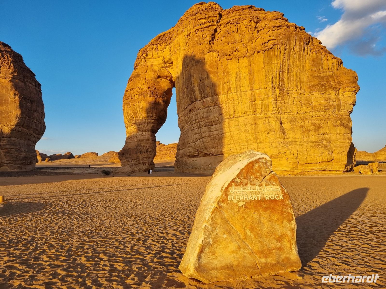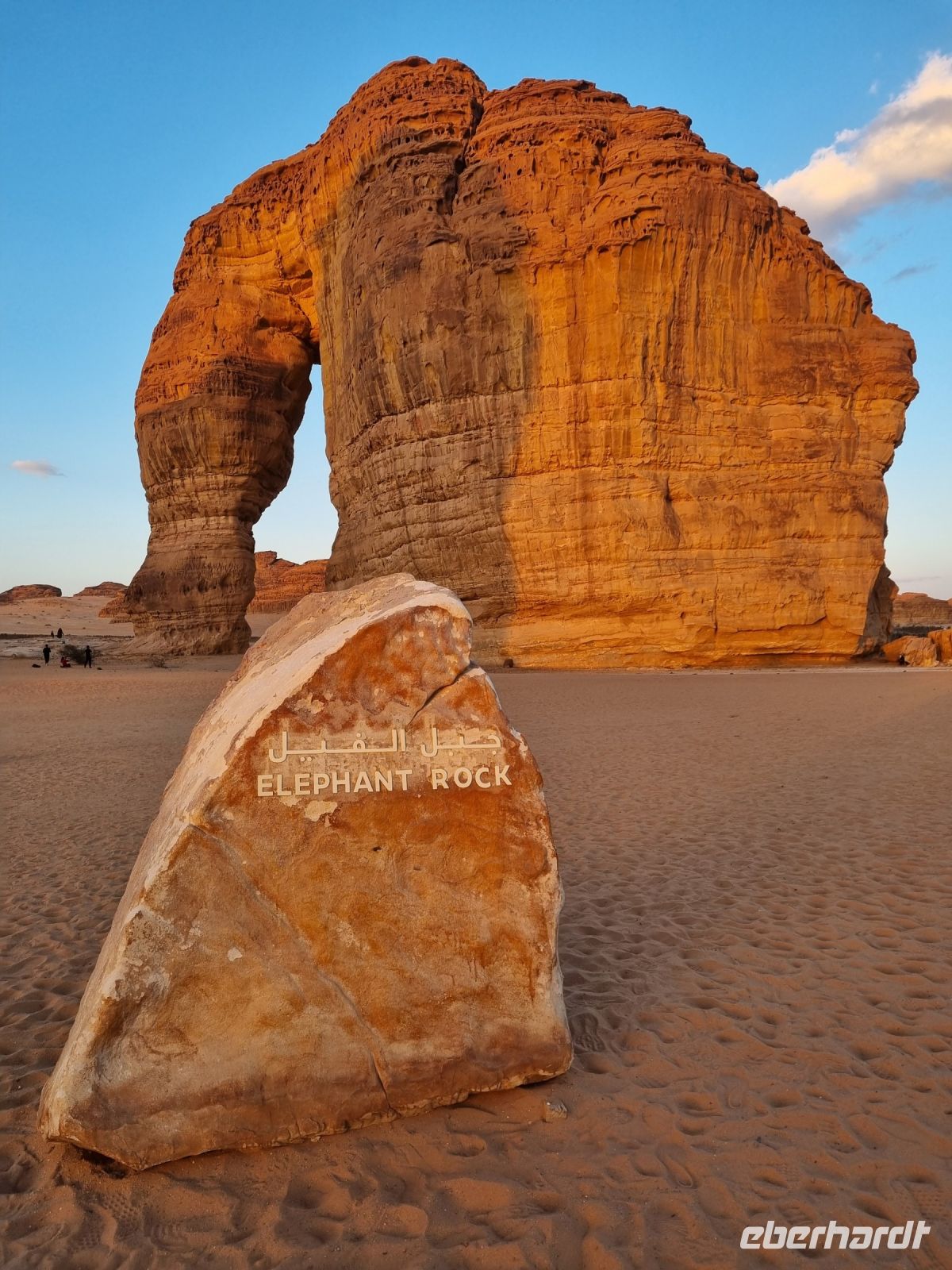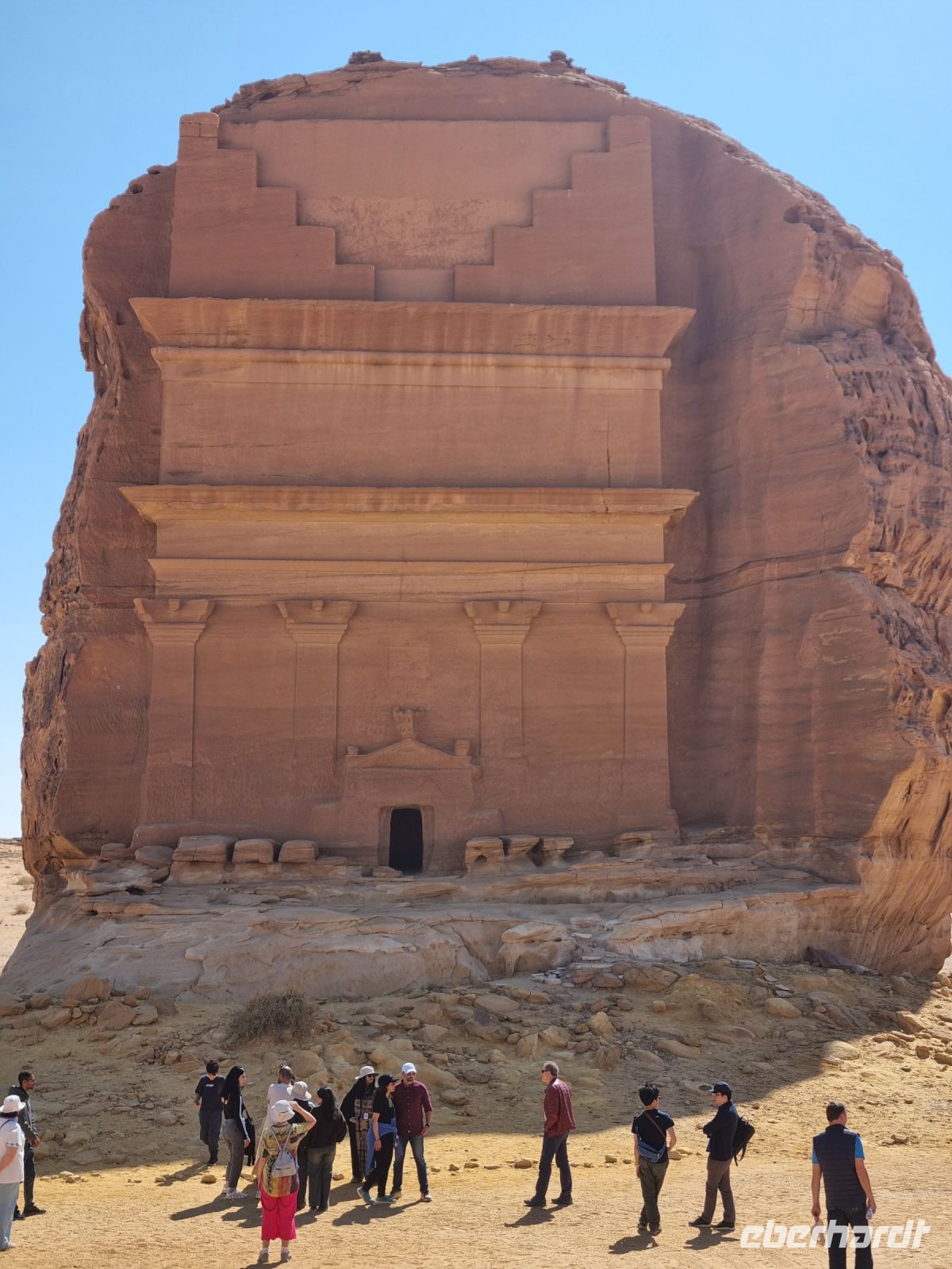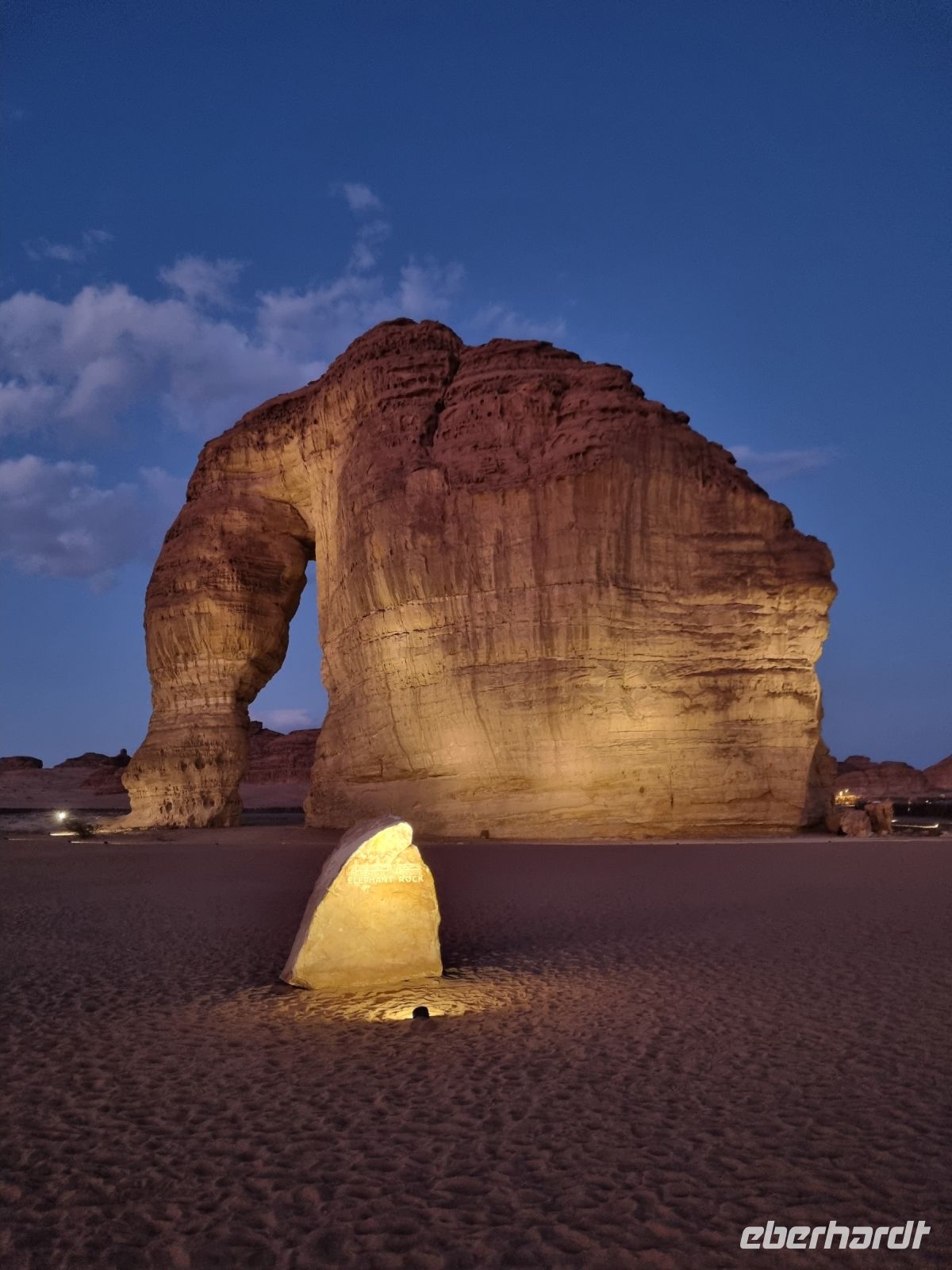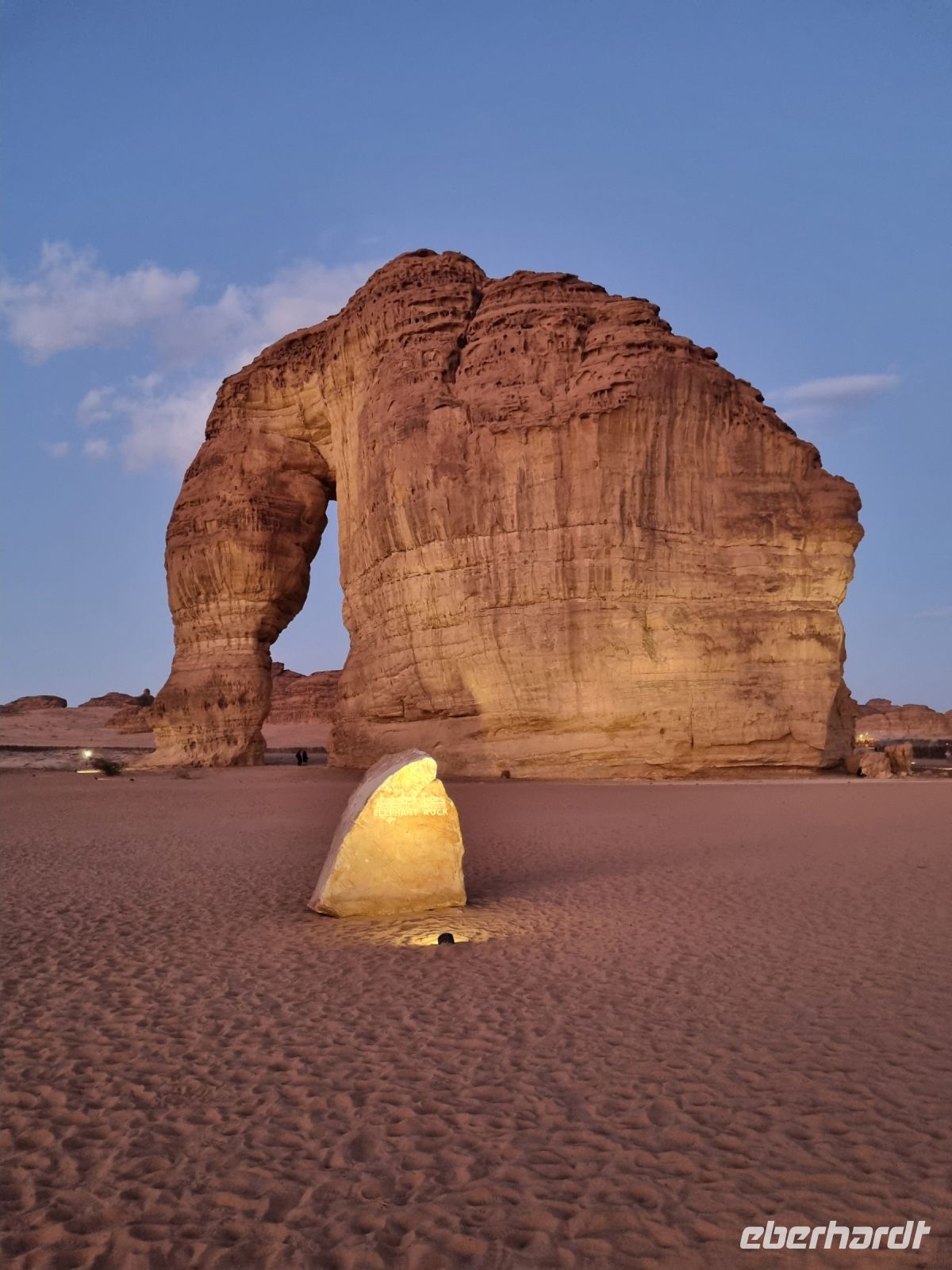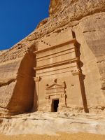 Der heutige Vormittag stand ganz im Zeichen der UNSESCO-Weltkulturerbestätte Mada´in Salih, einem großen Gebiet mit Nabatäischen Ruinen. Sie sind die beeindruckendsten vorislamischen Kulturdenkmäler Saudi-Arabiens und das Pendant zu den Felsengräbern im jordanischen Petra. Das antike Hegra war immerhin die südliche Hauptstadt des Nabatäischen Königreichs, während das heute in Jordanien liegende Petra die nördliche Hauptstadt war. Von den Strukturen der Stadt Hegra selbst gibt es heute kaum Überreste, lediglich einige künstlich angelegte Wasserquellen haben die Zeit überdauert. Entgegen gängiger Annahmen sind die eindrucksvollen, in den Fels gehauenen Bauten nämlich keine Wohngebäude, sondern Gräber. In der Regel haben sich hier bereits zu Lebzeiten Einzelpersonen und Familien Grabmäler errichten lassen und einige dieser gigantischen Nabatäer-Gräber konnten wir uns hier genauer anschauen. So langsam wurde es auch schon wieder Zeit für eine Stärkung und somit fuhren wir in eine luxuriöse Hotelanlage, dem „Habitas Resort AlUla" weiter, um dort ein exklusives Mittagessen einzunehmen. Dieses geschmackvolle Essen und das hervorragende Ambiente war sicherlich einer der Höhepunkte in Bezug auf die Kulinarik unserer Reise. Ein weiteres unvergessliches Erlebnis ließ anschließend nicht lange auf sich warten, denn wir sahen am Nachmittag das größte verspiegelte Gebäude der Welt, die Maraya-Konzerthalle. Maraya bedeutet auf Arabisch Spiegel und bildet eine Erweiterung der Umgebung, wobei alle Seiten vollständig von reflektierenden Paneelen bedeckt sind, die die abstrakten Ansichten des goldenen Sandes und der majestätischen Berge, die sie umgeben, brechen. Einfach gigantisch und mit Worten kaum zu beschreiben! Den Abend verbrachten wir dann am monumentalen Elefantenfelsen, unweit unseres Hotel-Resorts. Er ist einer der weltweit beliebtesten Felsformationen, denn aus der Ferne betrachtet wirkt dieser Felsen wie ein Elefant mit bodengebundenem Rüssel. Rumpf und Körper aus rotem Sandstein wurden durch Wasser- und Winderosion geformt, die über Millionen von Jahren verursacht wurde. Der riesige Elefant steht in einer Landschaft aus goldenem Sand, umgeben von anderen Felsformationen, die ebenso beeindruckend groß sind. Die Schönheit dieses mächtigen Elefanten nimmt nur bei Einbruch der Dunkelheit zu, wo er in den warmen Lichtern, die vor Ort installiert wurden, lebensechter wird.