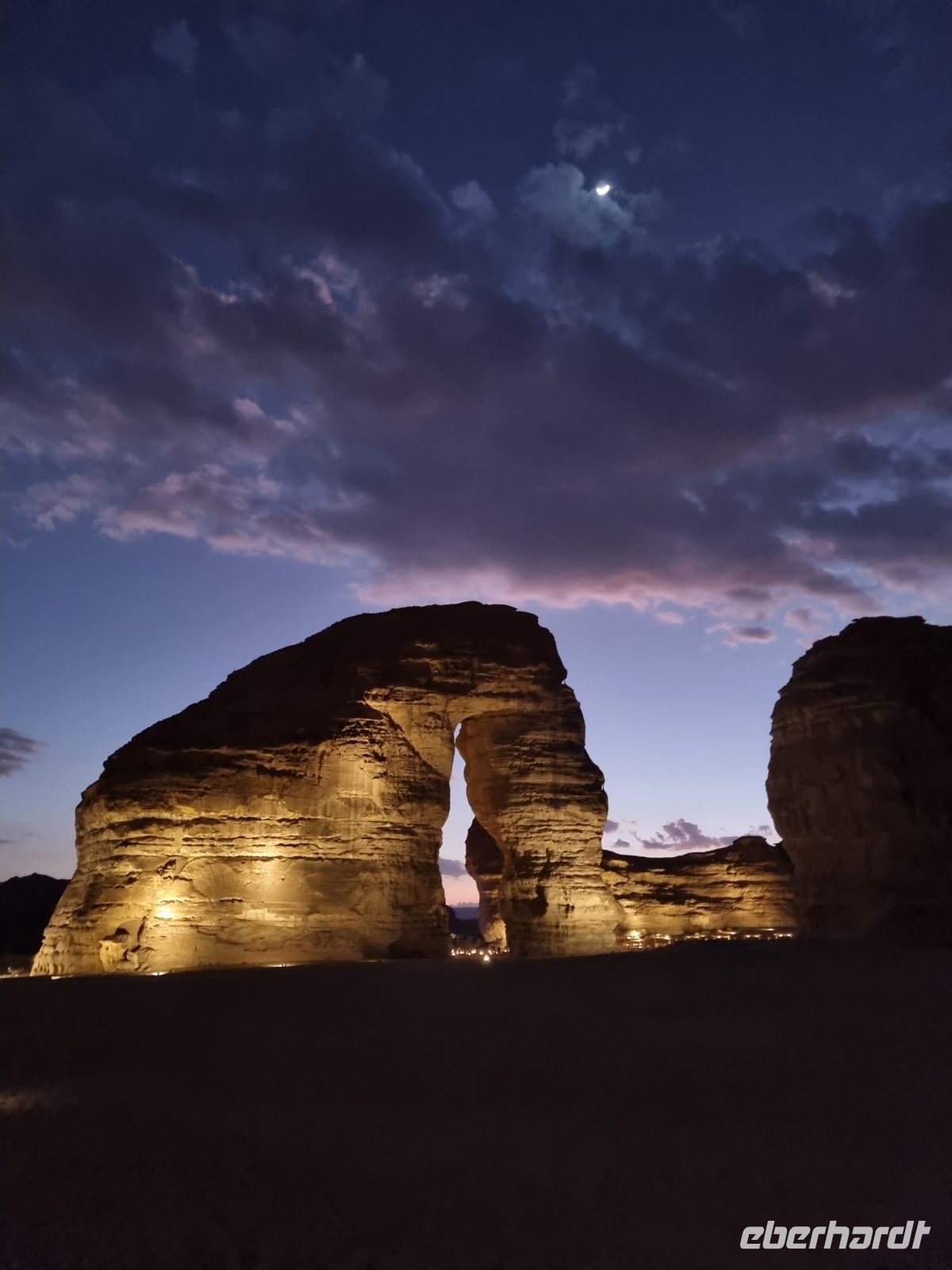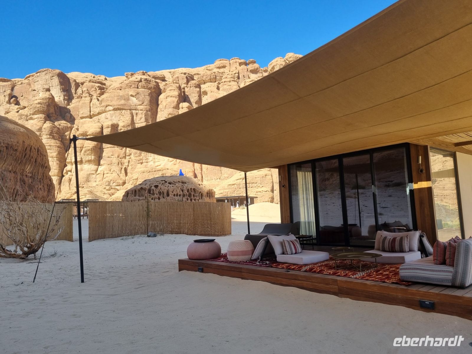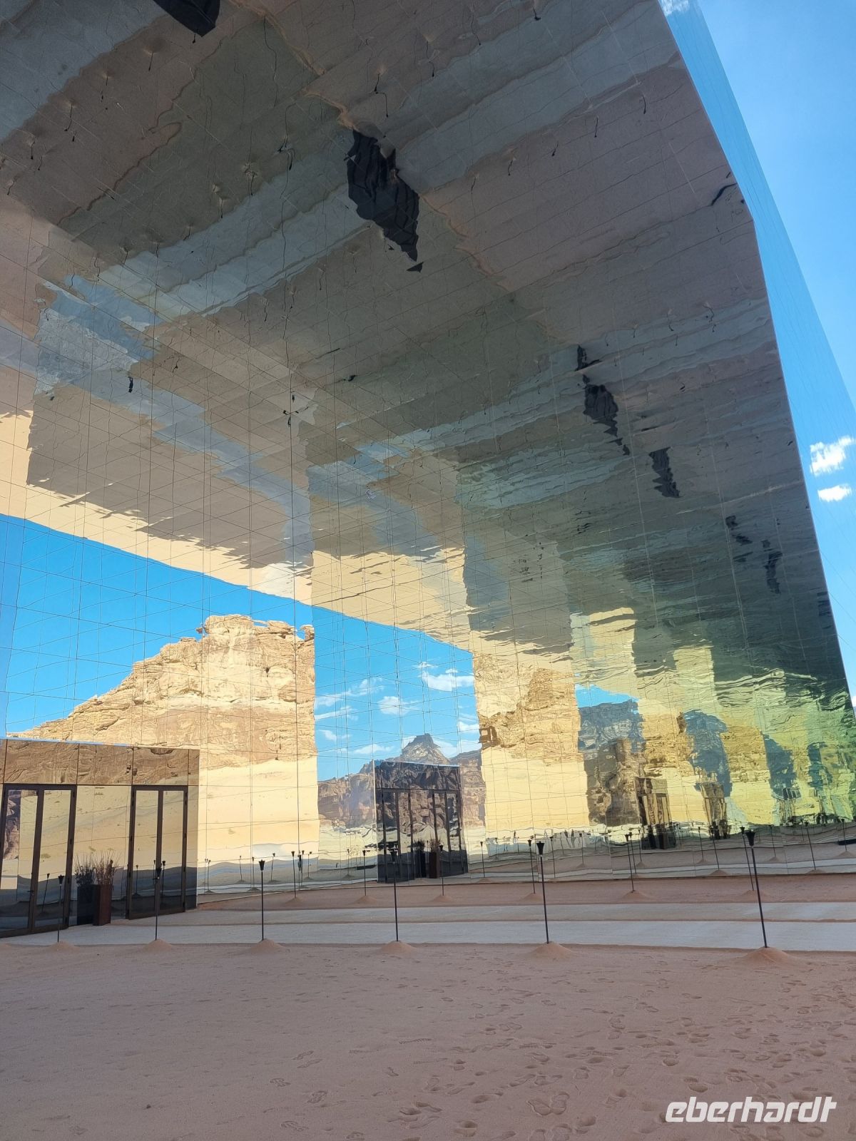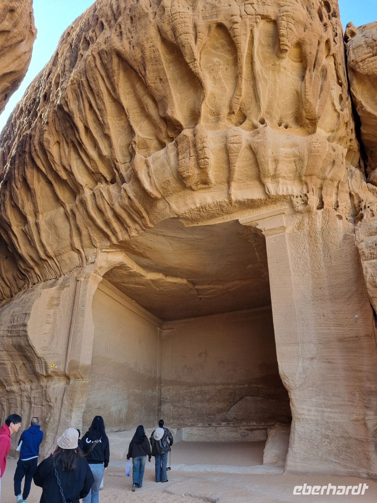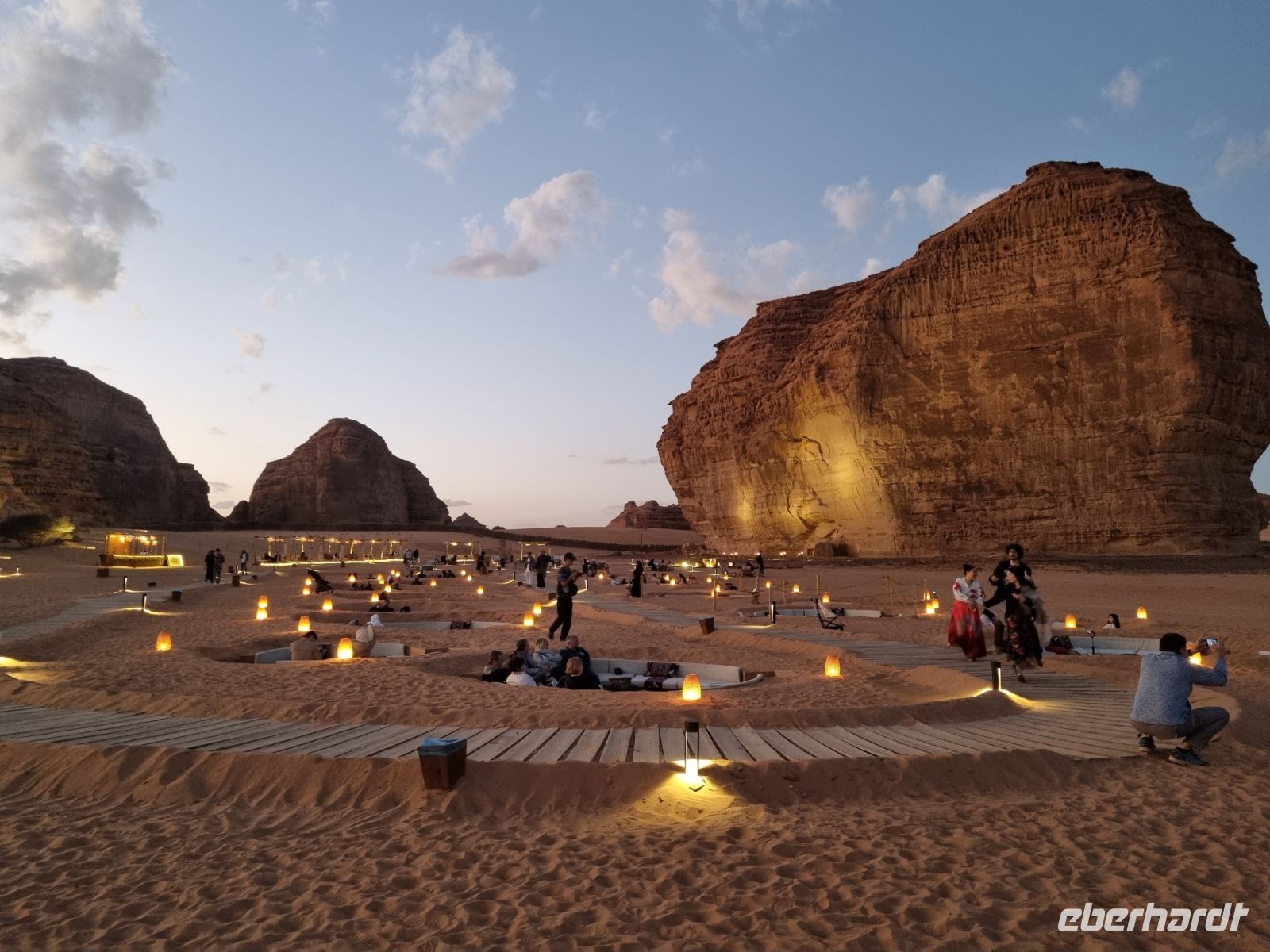 Der heutige Vormittag stand ganz im Zeichen der UNSESCO-Weltkulturerbestätte Mada´in Salih, einem großen Gebiet mit Nabatäischen Ruinen. Sie sind die beeindruckendsten vorislamischen Kulturdenkmäler Saudi-Arabiens und das Pendant zu den Felsengräbern im jordanischen Petra. Das antike Hegra war immerhin die südliche Hauptstadt des Nabatäischen Königreichs, während das heute in Jordanien liegende Petra die nördliche Hauptstadt war. Von den Strukturen der Stadt Hegra selbst gibt es heute kaum Überreste, lediglich einige künstlich angelegte Wasserquellen haben die Zeit überdauert. Entgegen gängiger Annahmen sind die eindrucksvollen, in den Fels gehauenen Bauten nämlich keine Wohngebäude, sondern Gräber. In der Regel haben sich hier bereits zu Lebzeiten Einzelpersonen und Familien Grabmäler errichten lassen und einige dieser gigantischen Nabatäer-Gräber konnten wir uns hier genauer anschauen. So langsam wurde es auch schon wieder Zeit für eine Stärkung und somit fuhren wir in eine luxuriöse Hotelanlage, dem „Habitas Resort AlUla" weiter, um dort ein exklusives Mittagessen einzunehmen. Dieses geschmackvolle Essen und das hervorragende Ambiente war sicherlich einer der Höhepunkte in Bezug auf die Kulinarik unserer Reise. Ein weiteres unvergessliches Erlebnis ließ anschließend nicht lange auf sich warten, denn wir sahen am Nachmittag das größte verspiegelte Gebäude der Welt, die Maraya-Konzerthalle. Maraya bedeutet auf Arabisch Spiegel und bildet eine Erweiterung der Umgebung, wobei alle Seiten vollständig von reflektierenden Paneelen bedeckt sind, die die abstrakten Ansichten des goldenen Sandes und der majestätischen Berge, die sie umgeben, brechen. Einfach gigantisch und mit Worten kaum zu beschreiben! Den Abend verbrachten wir dann am monumentalen Elefantenfelsen, unweit unseres Hotel-Resorts. Er ist einer der weltweit beliebtesten Felsformationen, denn aus der Ferne betrachtet wirkt dieser Felsen wie ein Elefant mit bodengebundenem Rüssel. Rumpf und Körper aus rotem Sandstein wurden durch Wasser- und Winderosion geformt, die über Millionen von Jahren verursacht wurde. Der riesige Elefant steht in einer Landschaft aus goldenem Sand, umgeben von anderen Felsformationen, die ebenso beeindruckend groß sind. Die Schönheit dieses mächtigen Elefanten nimmt nur bei Einbruch der Dunkelheit zu, wo er in den warmen Lichtern, die vor Ort installiert wurden, lebensechter wird.