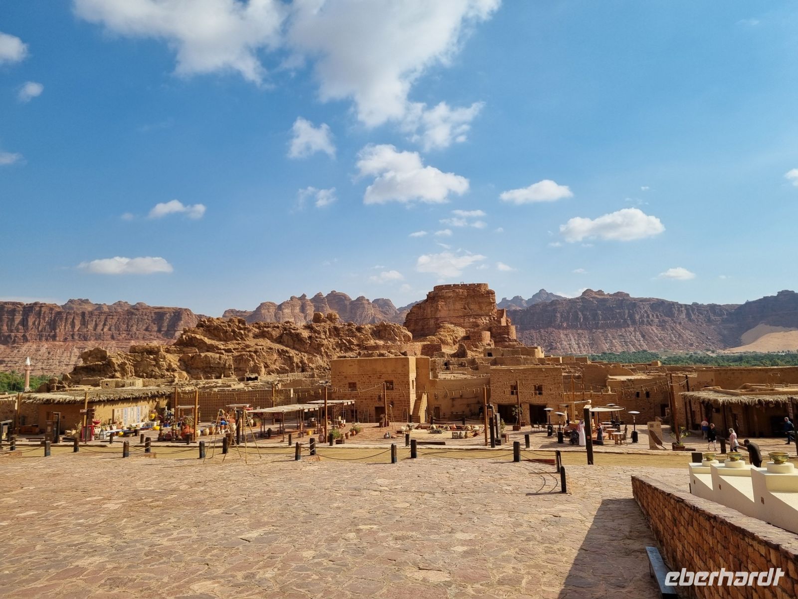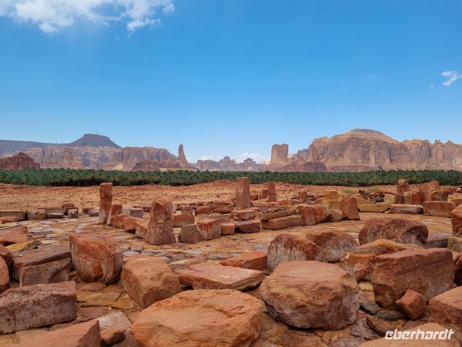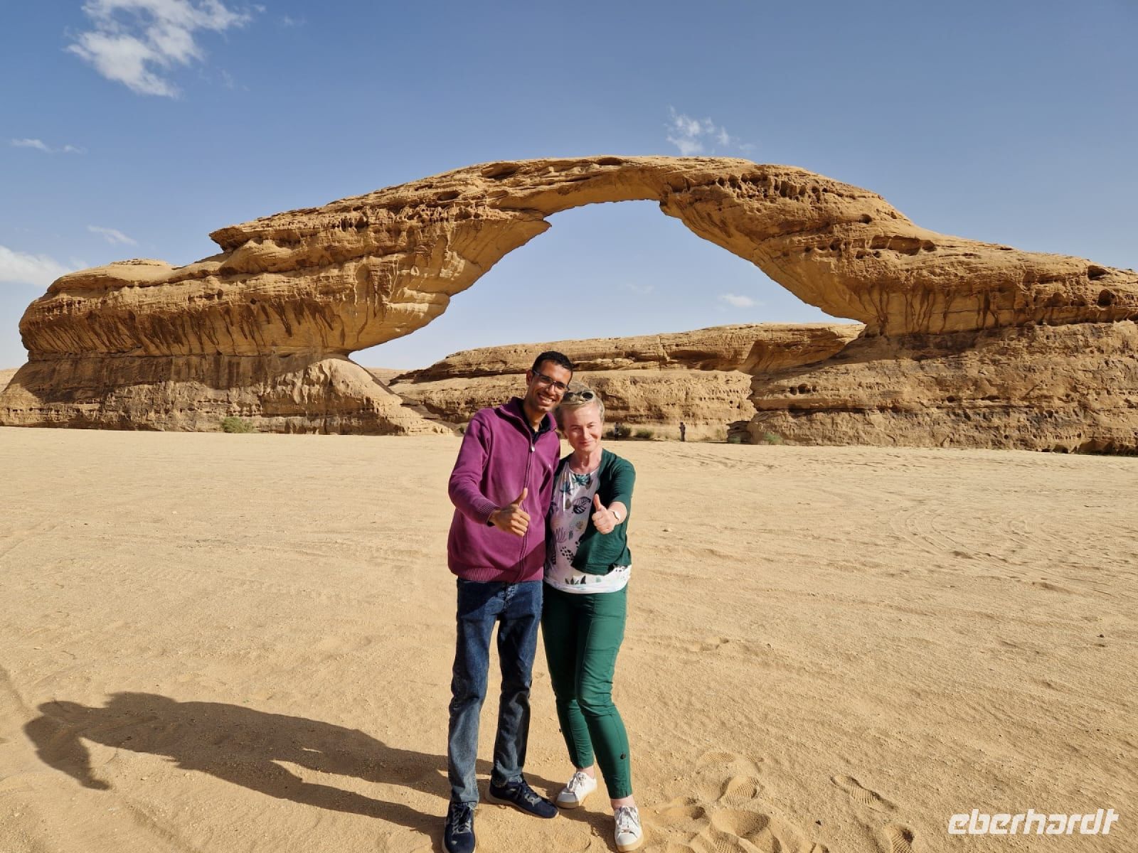 Nach einer kurzen Busfahrt erreichten wir die Altstadt von Al-Ula, welche sich vor allem durch ihre Lehmziegel-Häuser auszeichnet. Diese rund 900 Häuser sind, um Schutz zu bieten, miteinander verbunden gebaut und weisen darauf hin, dass die Verteidigung für die früheren Bewohner der Stadt oberste Priorität hatte. Die Stadt wurde schätzungsweise im 12. Jahrhundert gegründet und war bis in die 1980er Jahre bewohnt, als die letzten Einwohner in moderne Quartiere umzogen. Entlang der Weihrauchstraße im historischen Kern luden uns Open-Air-Restaurants und kleine Geschäfte mit Kunsthandwerk zum Verweilen und Stöbern ein. Gern wären wir hier noch länger geblieben...! Wenig später erreichten wir die benachbarte Oase Daimumah. Ausgehend vom arabischen Wort für „Nachhaltigkeit“ verbindet Daimumah Kunst, Natur und Erbe im malerischen und ruhigen Herzen der Oase – hier entstand in den letzten Jahren ein tolles Naherholungsgebiet mit Zitrusfrüchten und Palmen bzw. allen möglichen Annehmlichkeiten. Eine weitere kurze Busfahrt führte uns zum Besucherzentrum von Dadan, der ehemaligen Hauptstadt der Königreiche von Dedan und Lihyan. Aufgrund der Nähe zu den Weihrauch-Handelsrouten war Dadan noch vor der Ankunft der Nabatäer eine der am weitesten entwickelten Städte Nordarabiens. Wir begaben uns zunächst zu den Gräbern der alten Stadt, das Imposanteste wird immerhin von „Löwen" bewacht. Es handelt sich dabei um nebeneinander liegende, gemeißelte Gräber, jeweils von Löwenreliefs flankiert, die möglicherweise den Verstorbenen göttlichen Schutz bieten sollten. Anschließend besuchten wir Jabal Ikmah, eine wahrhaft atemberaubende Wüstenschlucht. An den Wänden begeisterte uns eine Jahrtausende alte sogenannte „Freiluftbibliothek" mit zahllosen Petroglyphen und beeindruckender Felskunst. Wir konnten uns hier sogar selbst aktiv betätigen, indem wir unsere Namen in Steine einmeißelten. Den Nachmittag verbrachten wir in zwei wunderschönen Gebieten nördlich von Al-Ula – Madachil und Gharamil. Das weite Madachil-Tal zeigte uns eine Märchenlandschaft, in der wir die wahre Poesie der Wüste erleben konnten. Ein besonderes Fotomotiv war für uns ein durch die Natur geformter Bogen, der durch Winderosion entstanden ist. Ein weiterer Höhepunkt war zweifelsohne das Wüstengebiet „Gharamil", eine unendlich weite Landschaft, die uns in eine Mondlandschaft der besonderen Art verführte. Unzählige, phantasievolle und pyramidenförmige Gesteinsfiguren aus Basalt begegneten uns und mit ein wenig Phantasie wurde in jedem einzelnen Stein eine besondere Figur wach. Den krönenden Abschluss des heutigen Tages bildete eine wundervoller Sonnenuntergang in der Wüste.