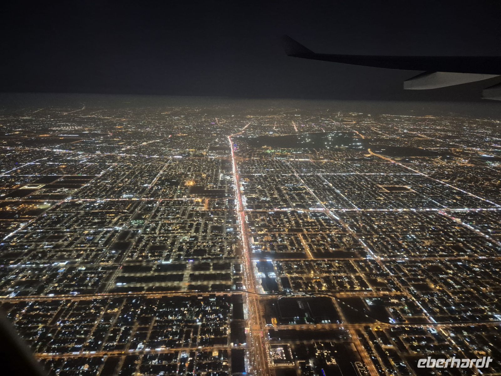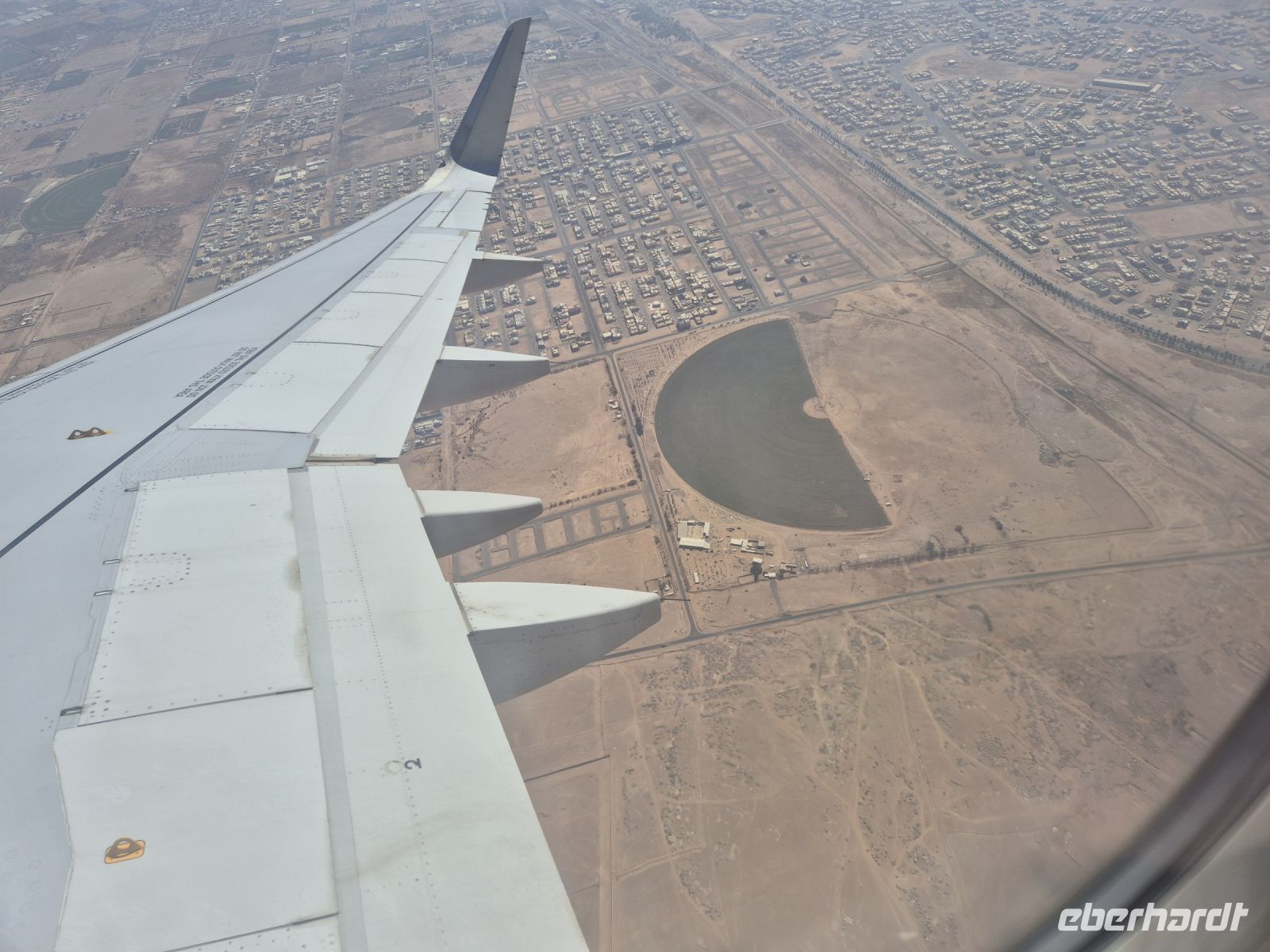 Den israelischen Luftraum umfliegen wir weitläufig, der Flug verläuft über den Sinai und Golf von Aqaba. In Riad haben wir mit unserem 150 EUR Visum eine unkomplizierte Einreise. Fingerabdrücke und ein Foto, dann ist es auch schon in wenigen Minuten geschafft. Salam aleikum Saudi Arabien!