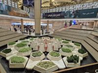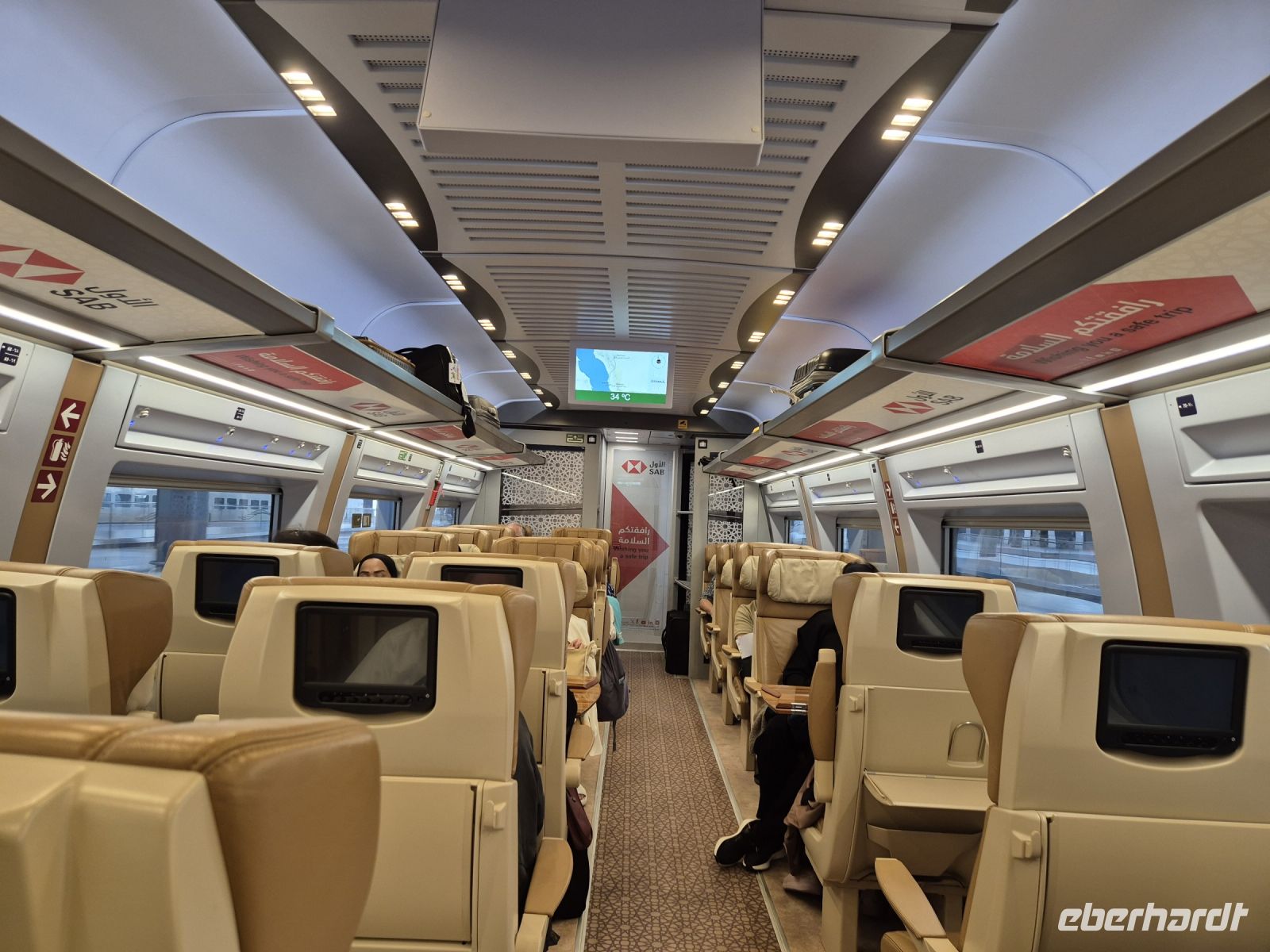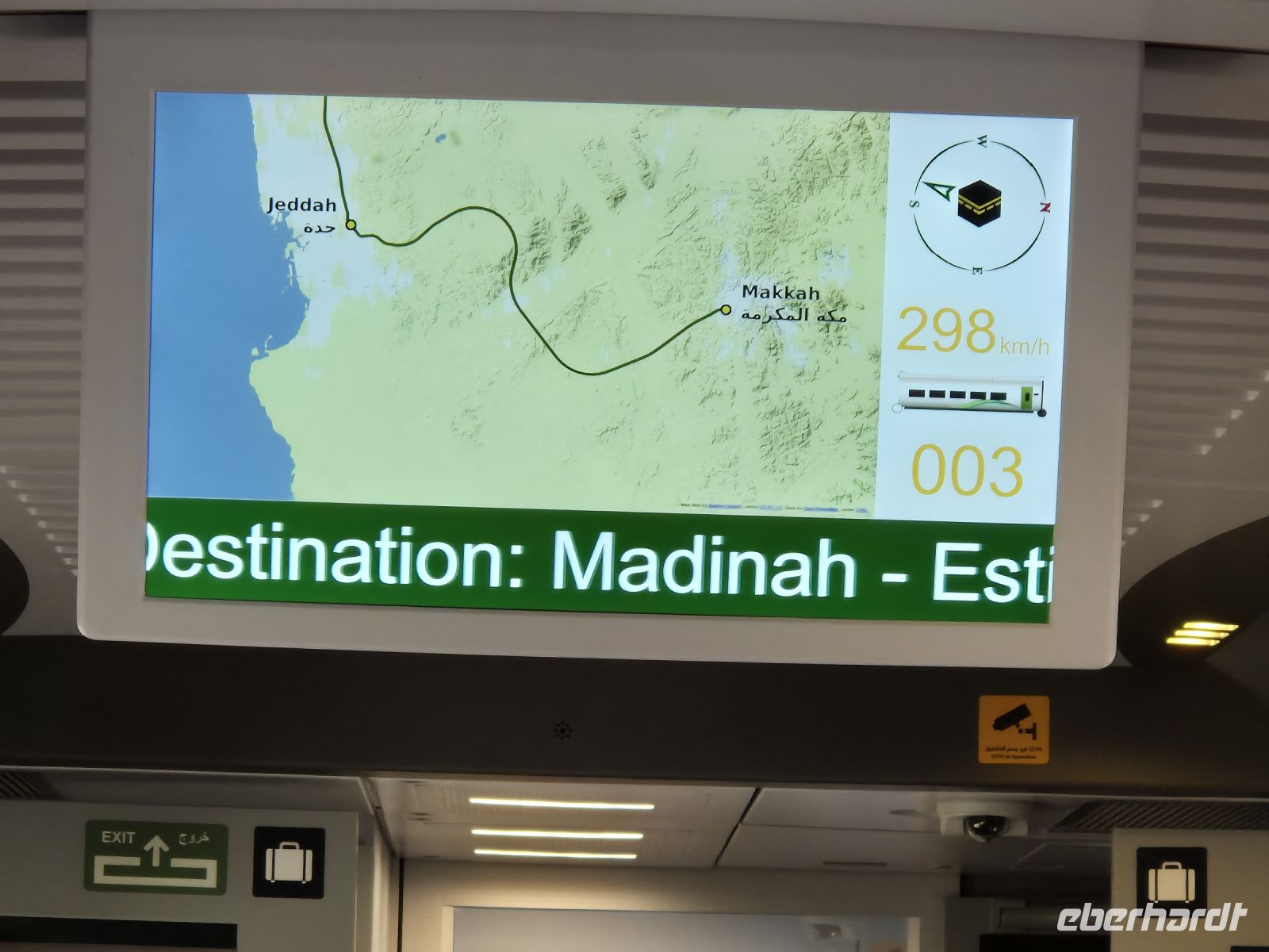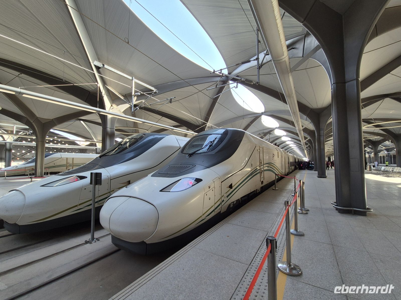 Für unsere Bahnfahrt nach Medina haben wir von der Agentur ein Upgrade für die Businessclass erhalten. Im riesigen und architektonisch interessanten Bahnhofgebäude haben wir noch etwas Zeit um z. B. die Business-Lounge zu nutzen. Die Zugverbindung heißt "Haramain High Speed Railway“ und wurde als Schnellzug für die muslimischen Pilger gebaut. Sie verbindet die heiligen Städte Mekka und Medina via Jeddah. Die Reisegeschwindigkeit liegt bei bis zu 300 km/h. Für die rund 400 km lange Fahrt nach Medina benötigen wir lediglich 1,5 Stunden. Am Bahnhof in Medina erwartet uns schon Khalil. Er war heute Morgen mit dem Bus und unseren Koffern nach Medina gefahren. In Medina geht es vom Bahnhof direkt zur Korandruckerei. Die weltgrößte Druckerei für Korane produziert mit Hilfe deutscher Druckmaschinen jährlich 20 Millionen Exemplare, welche in der islamischen Welt kostenfrei verteilt werden. Wie wir sehen, ist diese Druckerei auch ein beliebtes Ziel der Pilger, welche hier ein Exemplar erhalten. Uns steht als Nichtmuslims nicht dieses Geschenk zu, aber ein saudischer Angestellter ist nett zu uns und übergibt uns deutschsprachige Koranexemplare.