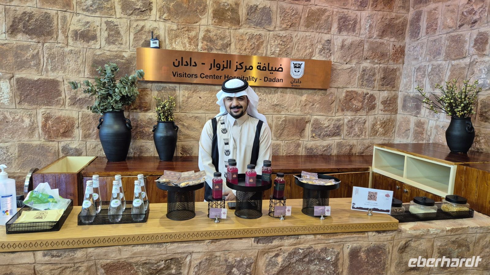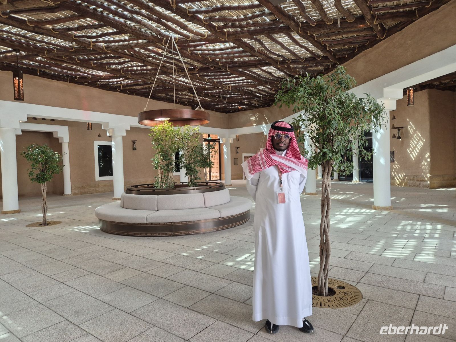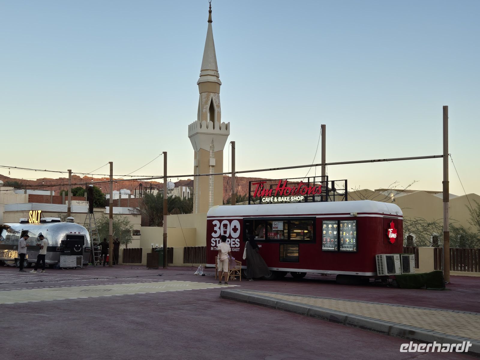 Am frühen Abend erkunden wir die Altstadt von Al Ula. Wir laufen einmal die Fußgängerzone ab. Nach etwas Überzeugungsarbeit mit dem saudischen Personal, dürfen wir einen sanierten Abschnitt der Altstadt mit überdachten Gassen betreten. Hier befindet sich das Hotel „Dar Tantora“. Der Hotelmanager wundert sich zwar anfangs über unser unangemeldetes Erscheinen, aber dann fährt er zu Hochform auf und zeigt uns das Hotel inkl. Zimmer.