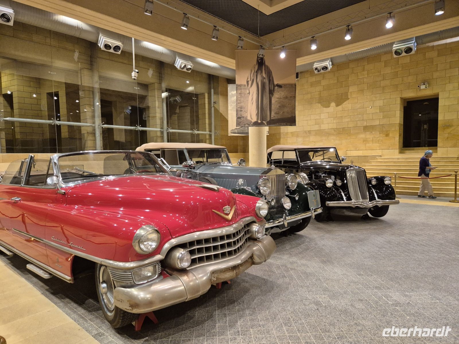Schließlich kehren wir mit etwas Geduld aufgrund des dichten Nachmittagsverkehrs noch einmal zum Nationalmuseum zurück, denn jetzt öffnet der Muraba´a Palast. Heute als Museum für jeden zugänglich, war es einst der Sitz des Staatsgründers Abdulaziz. Der Palast wurde in den 1930er Jahren errichtet und bietet einen guten Einblick in die damaligen Verhältnisse, bevor mit den Öleinnahmen der große Luxus kam. Zum Palast gehört auch eine kleine Ausstellung mit vier Fahrzeugen des Königs. Heutzutage sind es schöne Oldtimer.