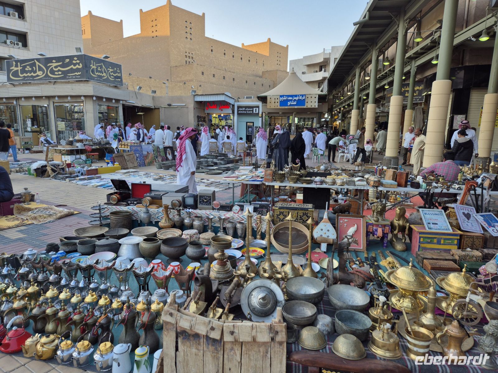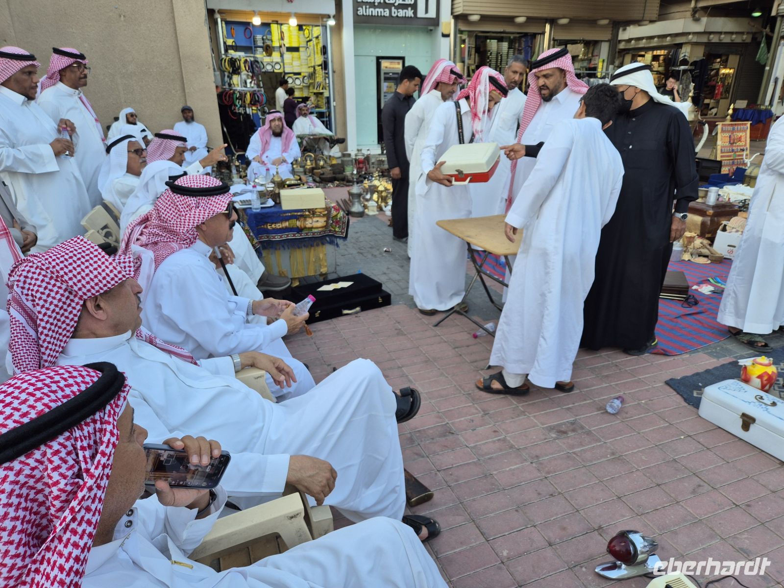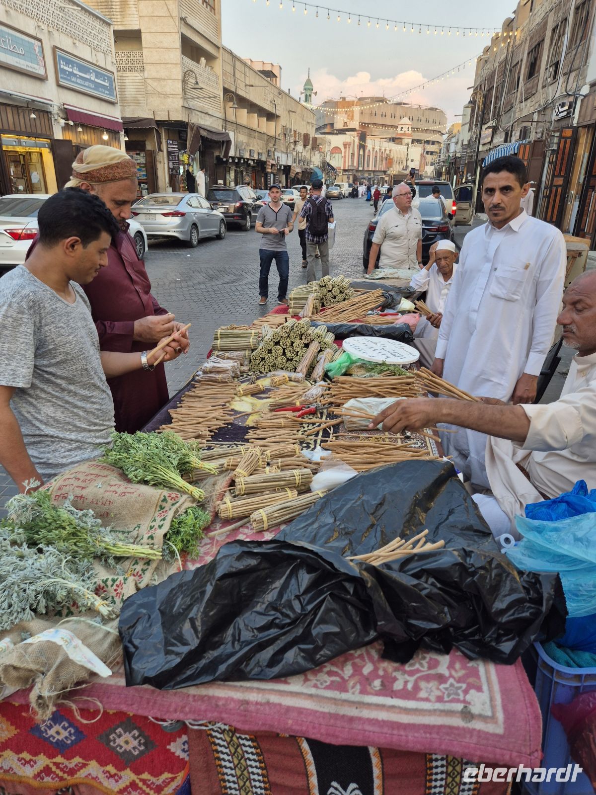 Nebenan zeigt uns Muhammad außerdem den Sitz der inzwischen von MBS entmachteten, einst so gefürchteten Religionspolizei. Gestärkt mit einem frischen Zuckerrohrsaft biegen wir in den Souk ab und verbringen hier etwas Freizeit. In einem Bereich des Souks findet ein Flohmarkt statt und man kann die Versteigerungen gebrauchter Artikel beobachten.
