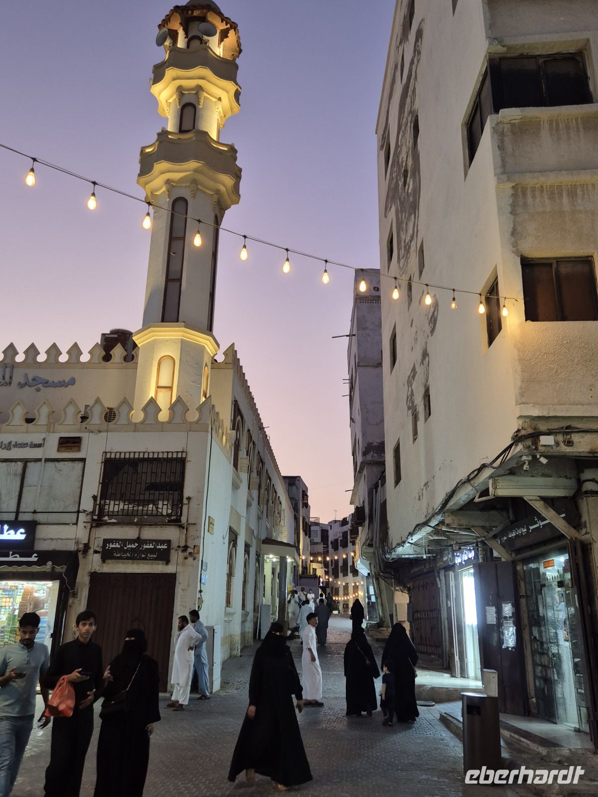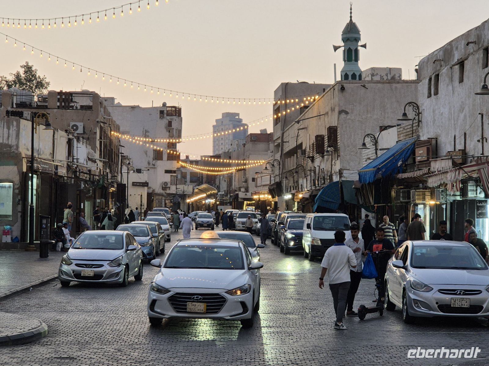 Jeddah ist bekannt für seine schöne Altstadt. Charakteristisch für Al Balad, so heisst die Altstadt sind die sogenannten Roshan (pers. Licht). Roshan sind an den Gebäuden vorspringende Erkerfenster mit geschnitzten Holzgittern. Roshan ist ein Synonym für Mashrabiya. Der Begriff Mashrabiya wird für Erkerfenster vorzugsweise im nordafrikanischen Raum verwendet. Traditionell wurden die Erkerfenster zum Einfangen des Windes genutzt. So hat man z. B. Tonkrüge mit Wasser darin platziert, um eine Kühlung durch das verdunstende Wasser zu bewirken. Außerdem erlaubten sie den Frauen, Beobachtungen nach draußen anzustellen, ohne dass man sie selbst von außen sehen konnte. Seit Jahrhunderten hat sich Jeddah als das Tor zum nur 79 km entfernten Mekka etabliert. Die Pilger versorgten sich in Jeddah mit allem, was sie für ihre Wallfahrt benötigten. Das prägte Al Balad mit den vielen Händlern. Wir besuchen den bekanntesten Markt, den Souk Al Alawi vor dem Bab Makka (Mekka-Tor). An einem Dattelgeschäft haben wir Gelegenheit, verschiedene Dattelsorten zu verkosten. Zum Sonnenuntergang ruft der Muezzin zum Gebet. Viele Händler schließen jetzt ihre Geschäfte und gehen zum Gebet. Wir beenden unseren Rundgang mit einem Besuch des vielleicht berühmtesten Hauses von Al Balad, dem Bait Nasif. Es wurdes 1881 fertiggestellt und diente als Gästehaus und königliche Residenz, bis es der Saud-Familie zu klein wurde.