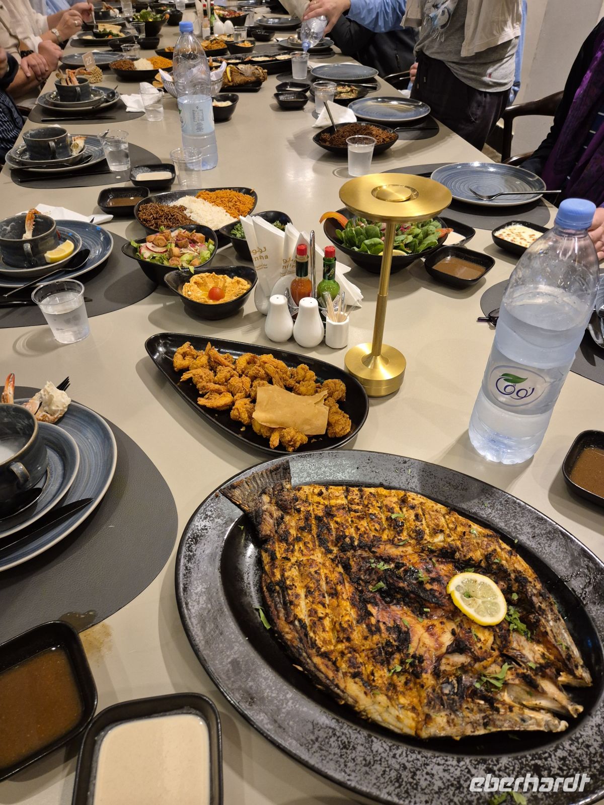 Unser Abendessen haben wir in einem Fischrestaurant. Es wird reichlich aufgetischt, darunter Papagei- und Nagelfisch, Garnelen, Tintenfisch u. a. m.
