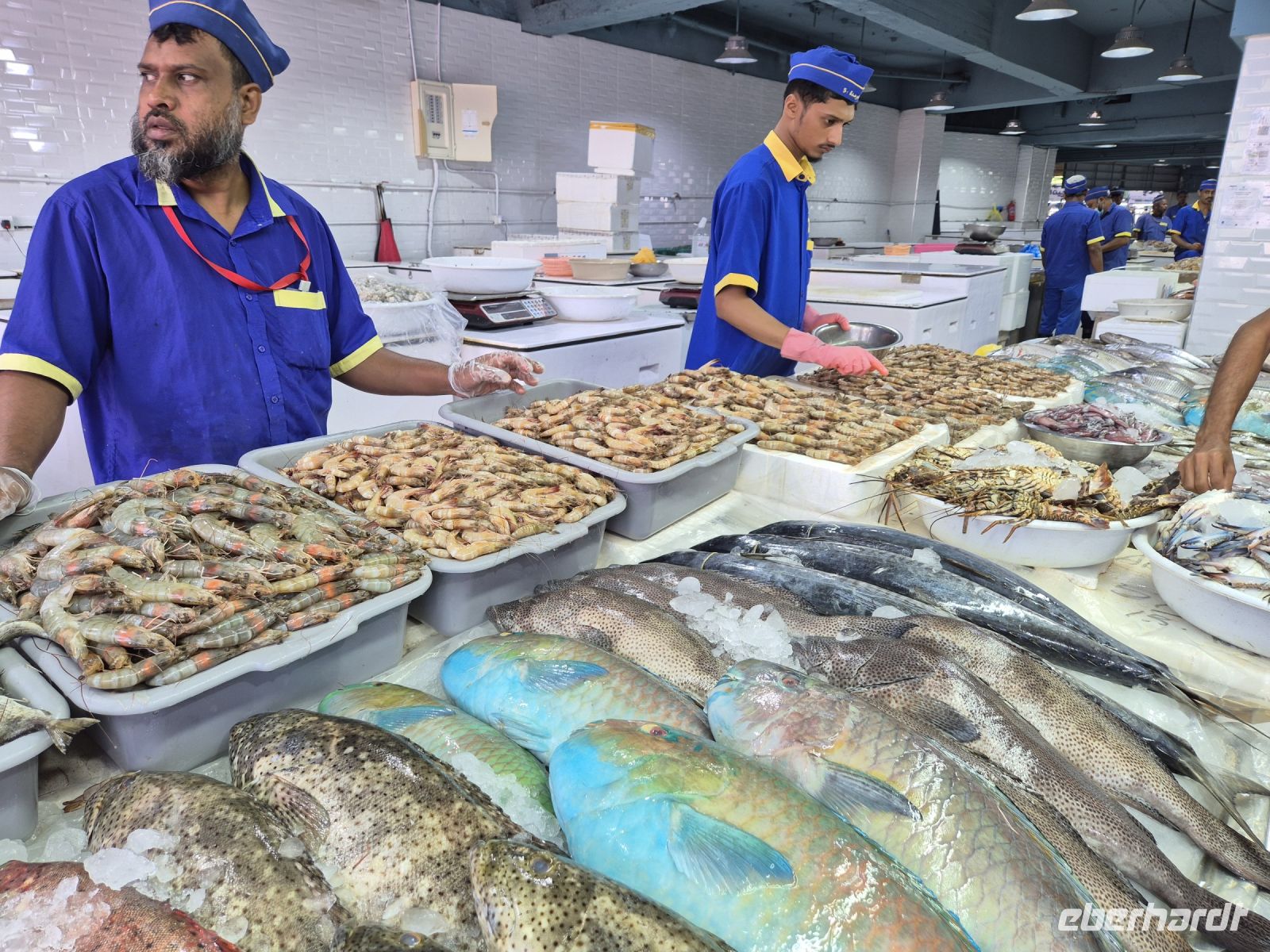 Zum Abschluss unseres Aufenthaltes in Jeddah halten wir am Fischmarkt der Stadt. Die Auswahl ist groß und es wird auch importierter Fisch wie z. B. norwegischer Lachs verkauft. In einem separatem Bereich haben wir die Möglichkeit zu beobachten, wie nach Kundenwunsch Fisch geputzt und ausgenommen wird.