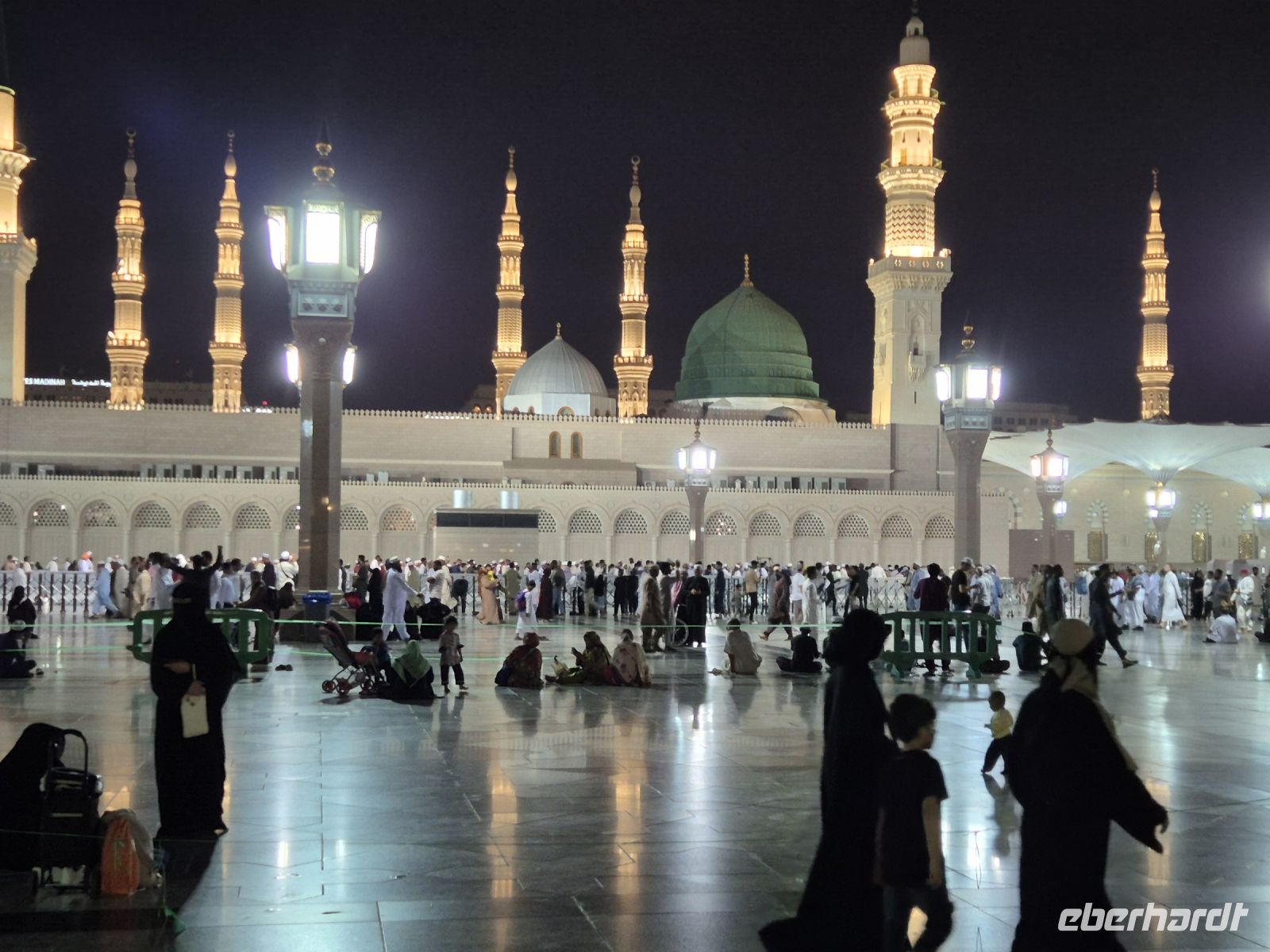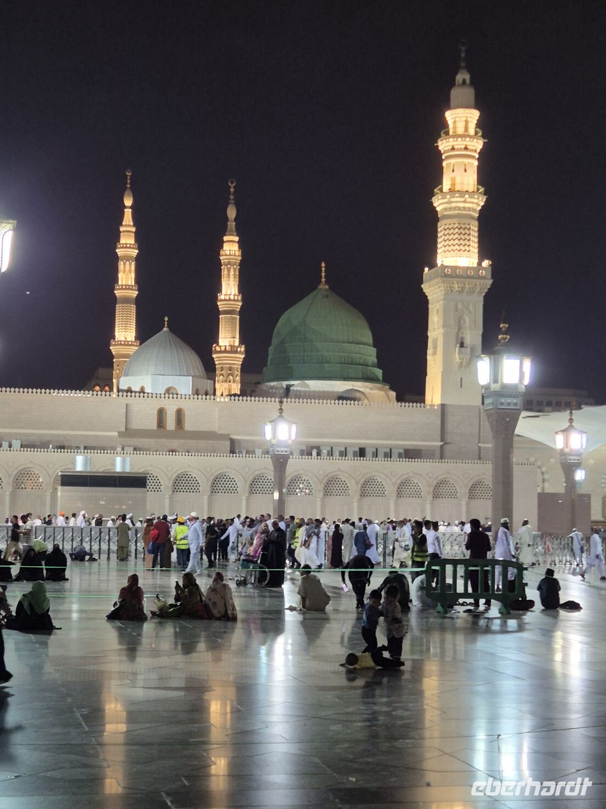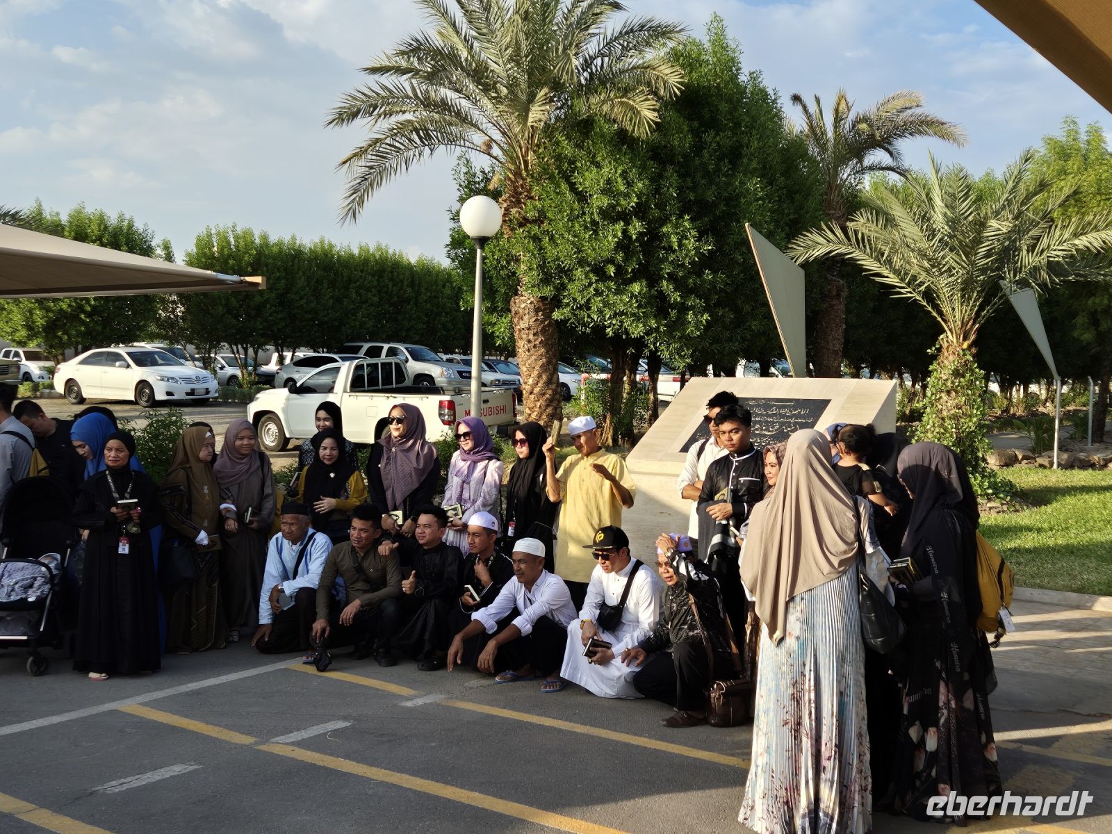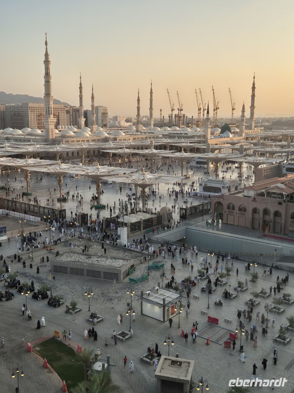 Anschließend fahren wir in die Innenstadt, welche durch die Prophetenmoschee geprägt ist. Erstmals haben wir als Eberhardtgruppe die Möglichkeit, im heiligen Bezirk im Hotel zu übernachten. Wir kommen gerade zu jener Zeit an, als der Muezzin beim Sonnenuntergang zum Gebet ruft. Tausende, darunter viele Pilgergruppen, strömen in die Moschee. Wir laufen am Rande der Moschee entlang und genießen diese besondere Atmosphäre. Unsere Zimmer haben alle Haram-Blick, also Aussicht auf die Moschee ??