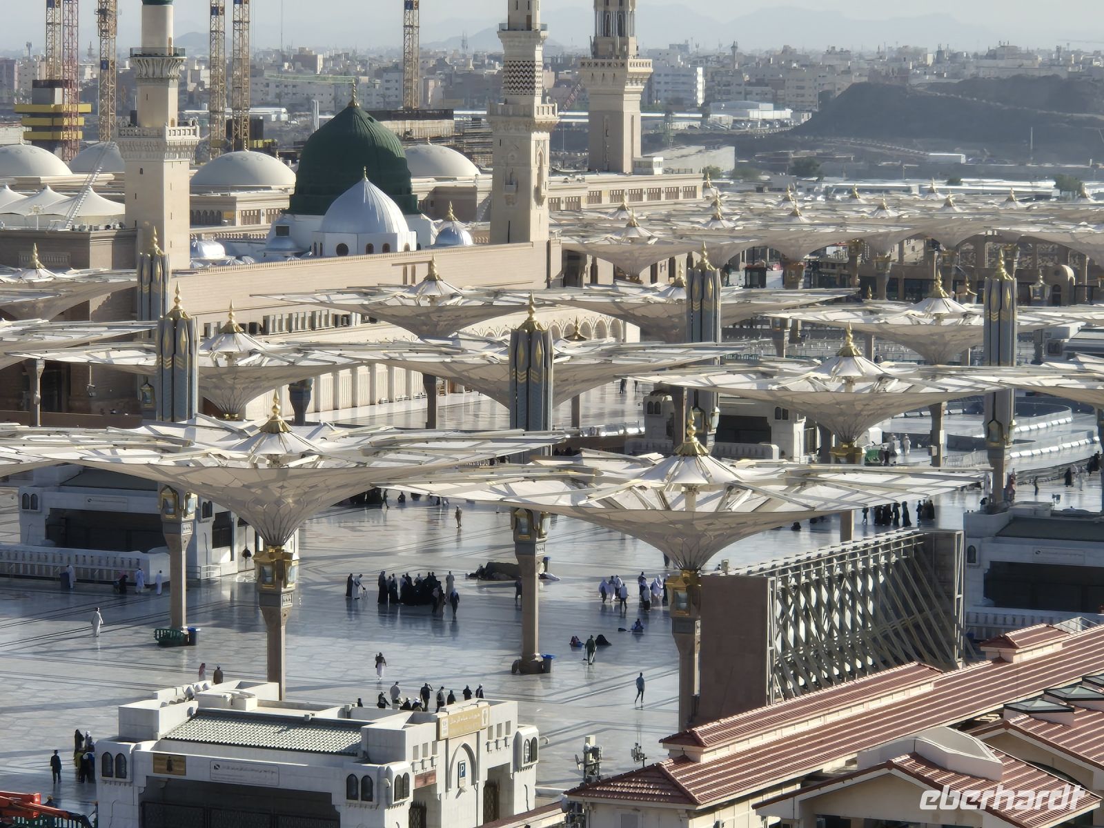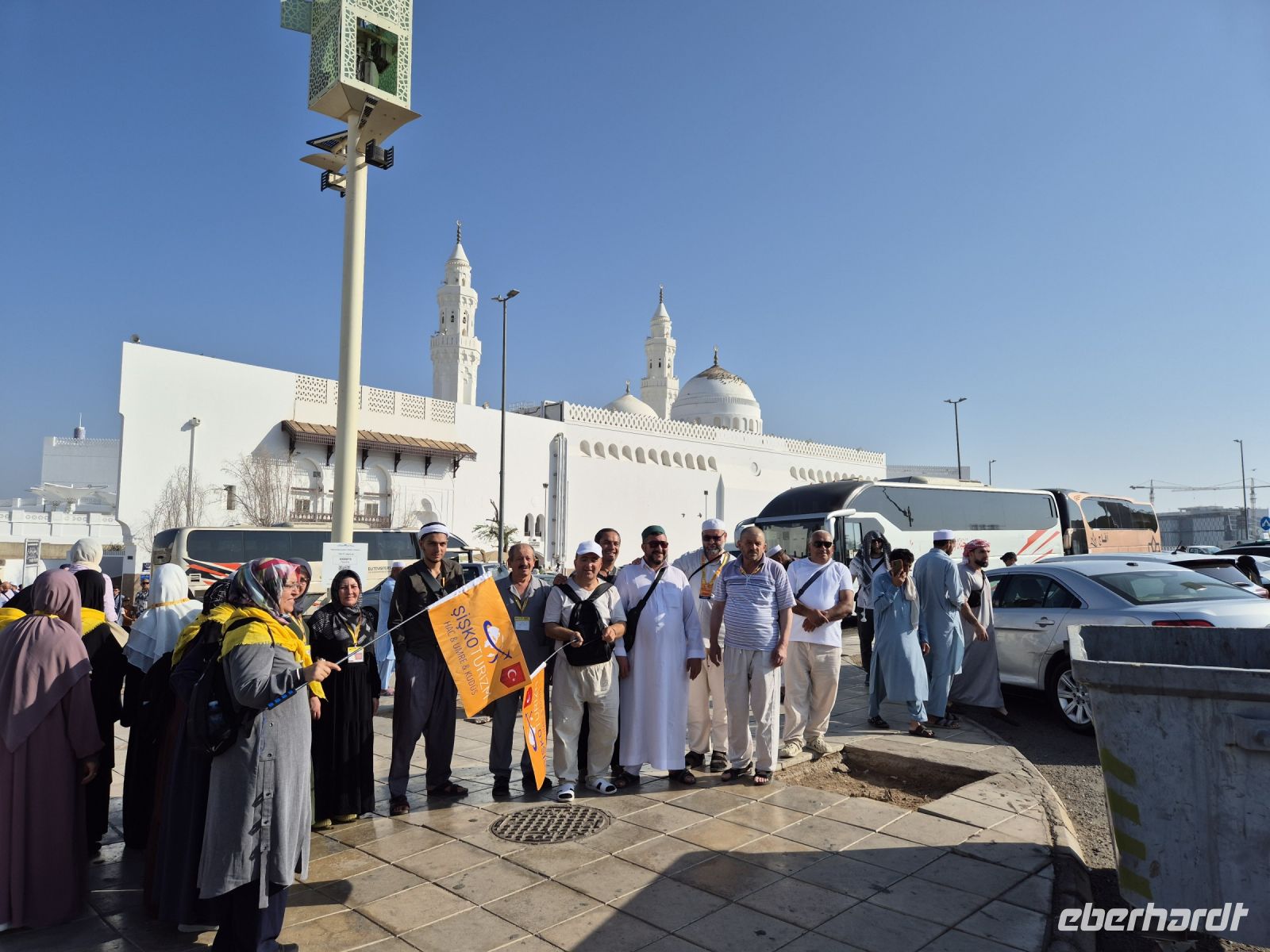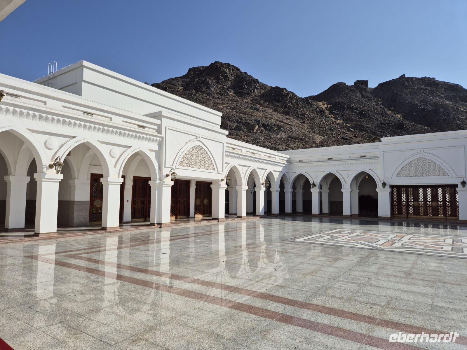 Am Morgen noch ein letzter Blick aus dem Hotelzimmer auf diese faszinierende Moschee, dann starten wir in den Tag. Zunächst bleiben wir noch im heiligen Bezirk und halten an der Masjid Al Quiblatain (Moschee der 2 Gebetsrichtungen). Hier wurde zu Zeiten des Propheten während eines Gebetes die Gebetsrichtung von Al Kuds (Jerusalem) nach Mekka geändert. Deshalb besitzt diese Moschee auch zwei Gebetsnischen. Viele Pilgergruppen besuchen diese Moschee. Einen weiteren Halt legen wir an der Jame Al Khandaq (Khandaq-Moschee) ein. Dieser Ort wird auch Ort der sieben Moscheen genannt, welche den sieben engsten Gefolgsleuten von Muhammad zugeordnet werden.