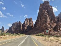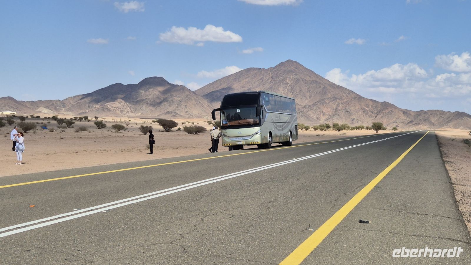 Mit ca. 510 Kilometer haben wir heute unsere längste Fahrtstrecke der Reise. Unsere Route verläuft durch eine abwechslungsreiche, von Bergen geprägte Landschaft. Während der Fahrt beschäftigen wir uns mit Themen von der Arabischen Sprache, Erdöl und Wirtschaft, Heirat, Arbeitsleben bis zu Neom und der Vision 2030.