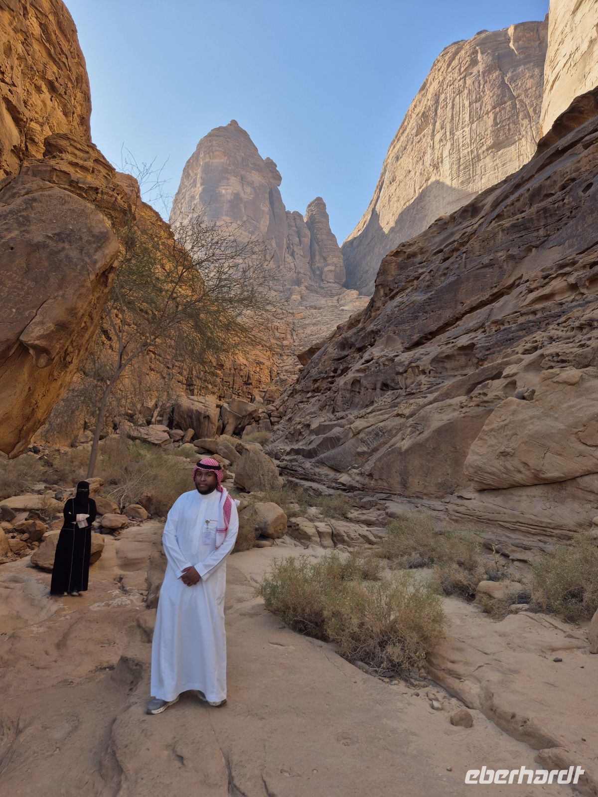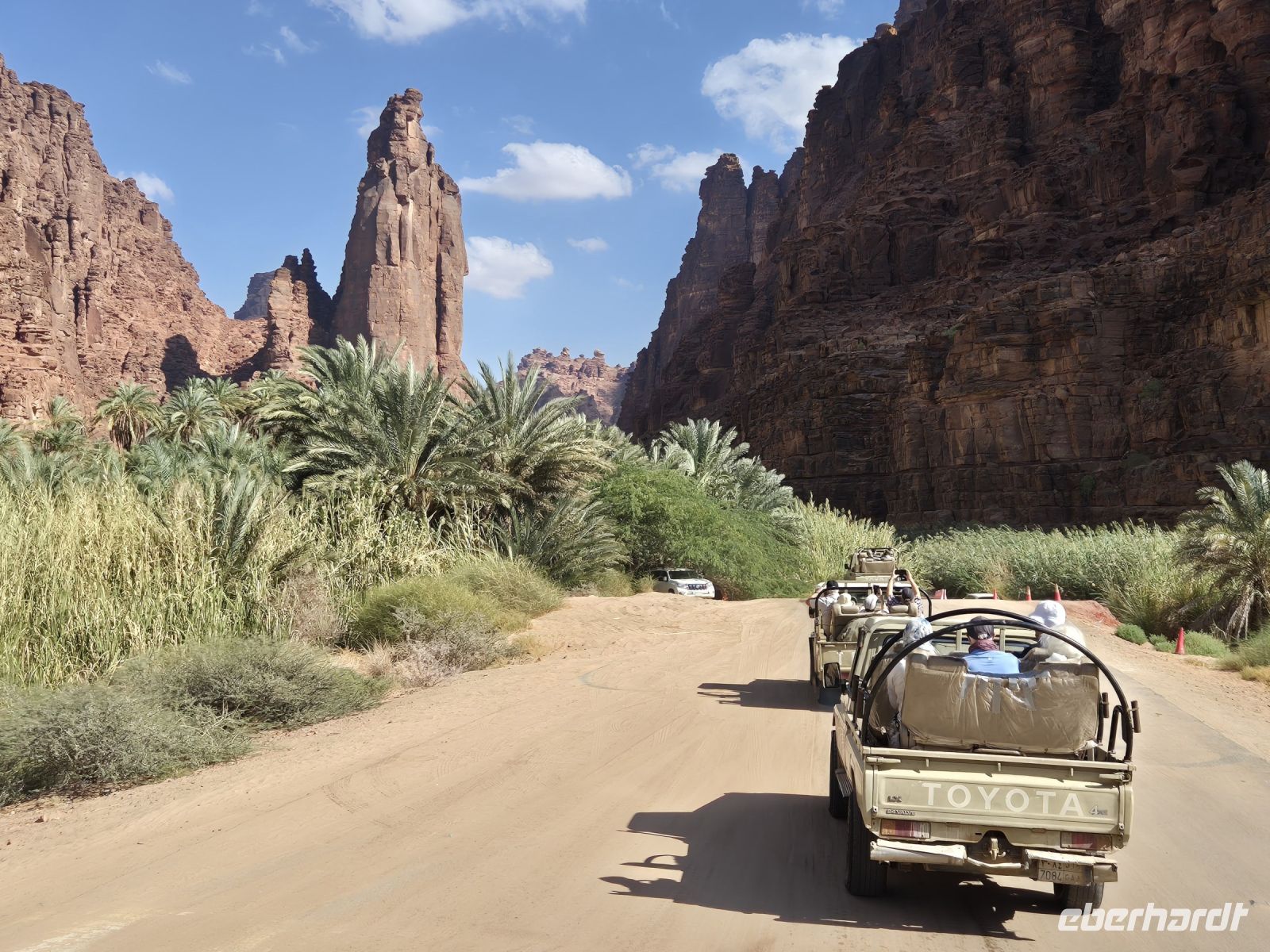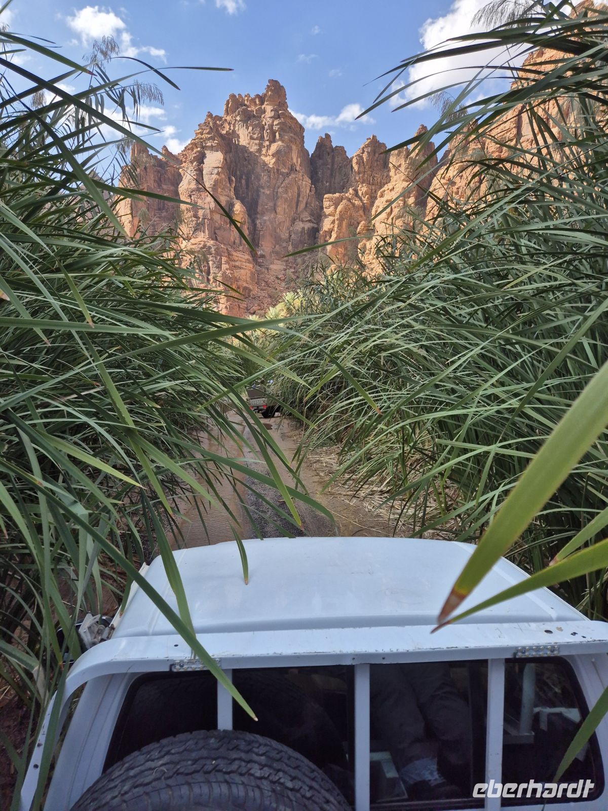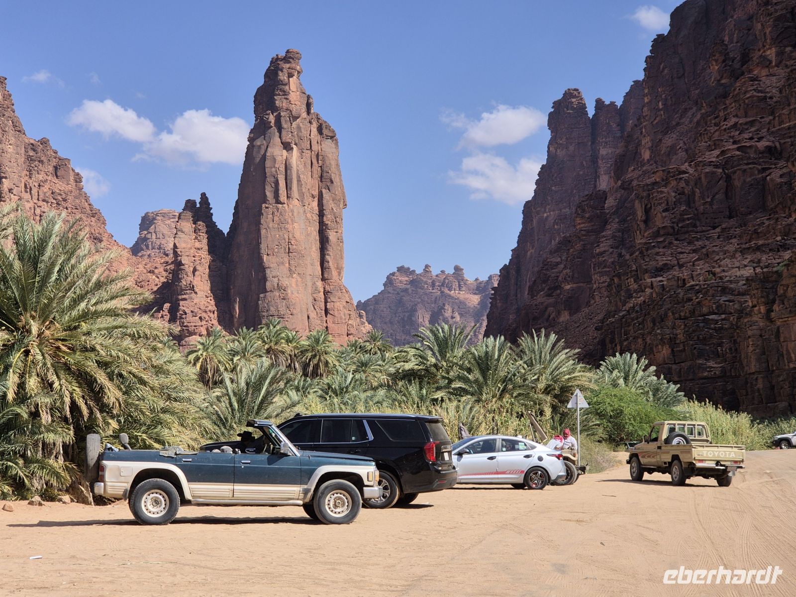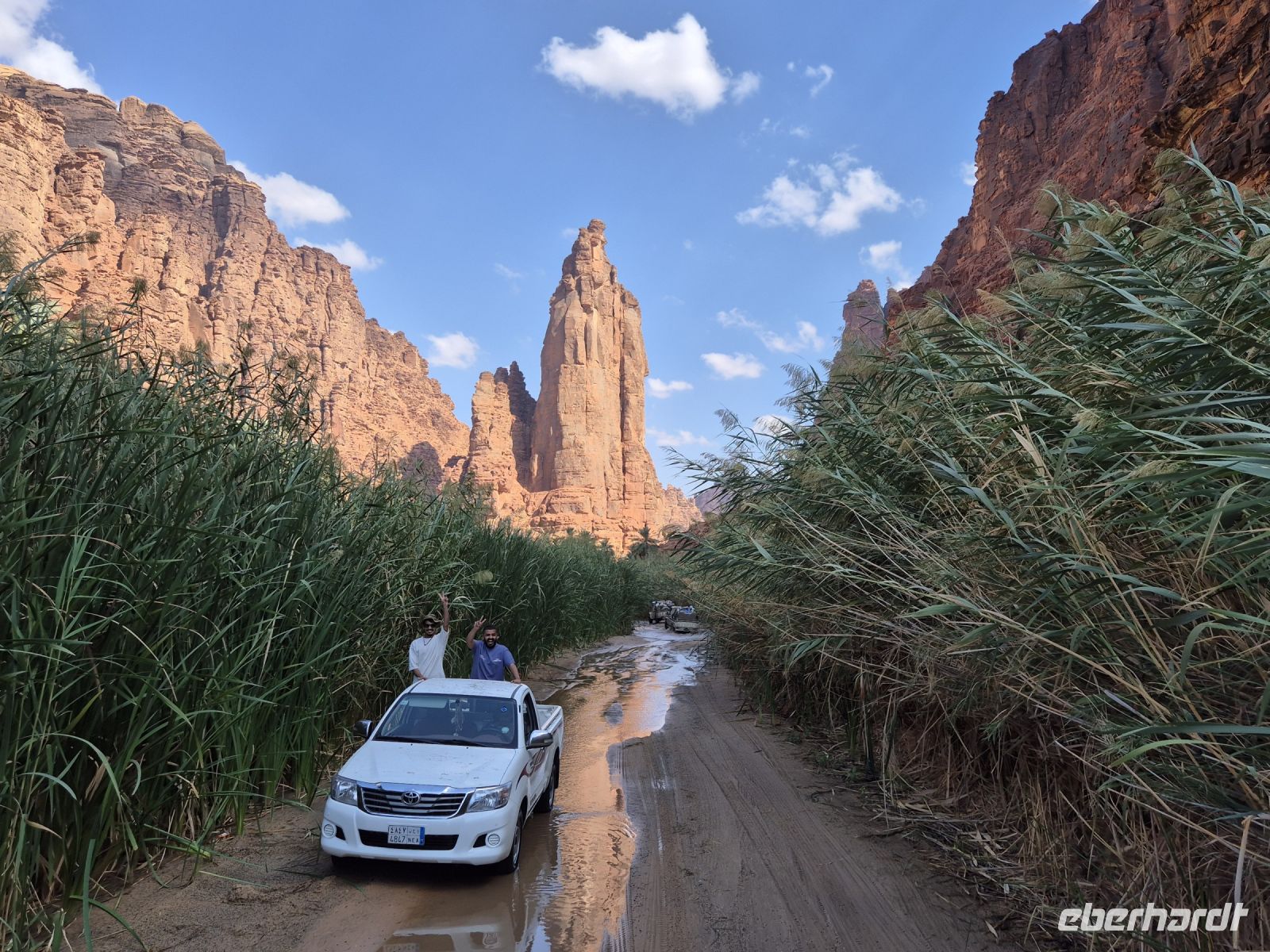 Mittags erreichen wir das Wadi Dissah, welches zu den spektakulärsten Landschaften in Saudi Arabien zählt. Diese tief eingeschnittene Schlucht ist ca. 25 Kilometer lang. Einzelne Felsen ragen bis zu 500 Meter in die Höhe. Das stetig fließende Wasser sorgt für eine üppige Vegetation im Wadi.