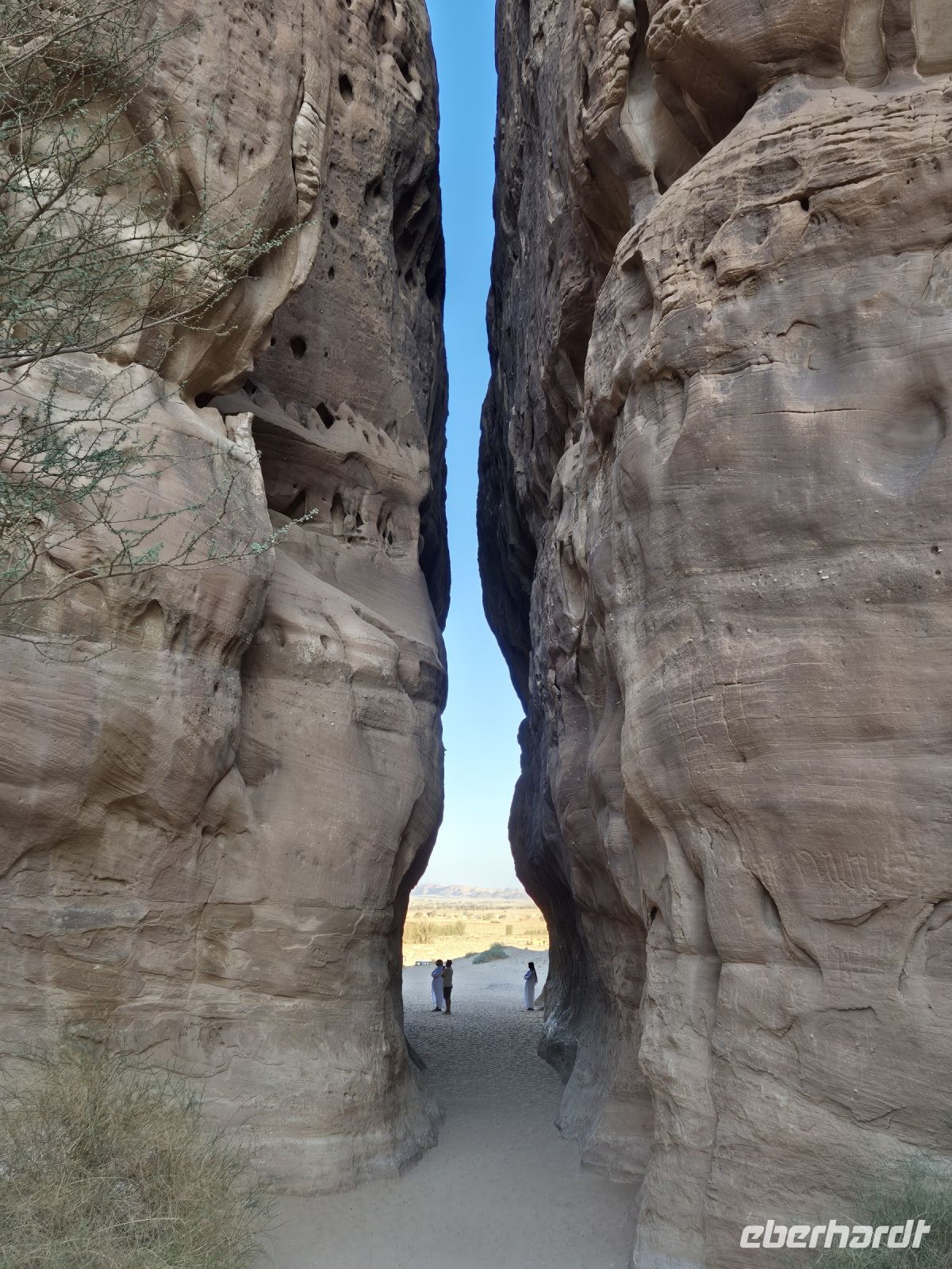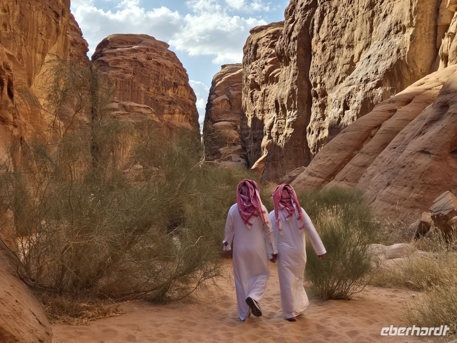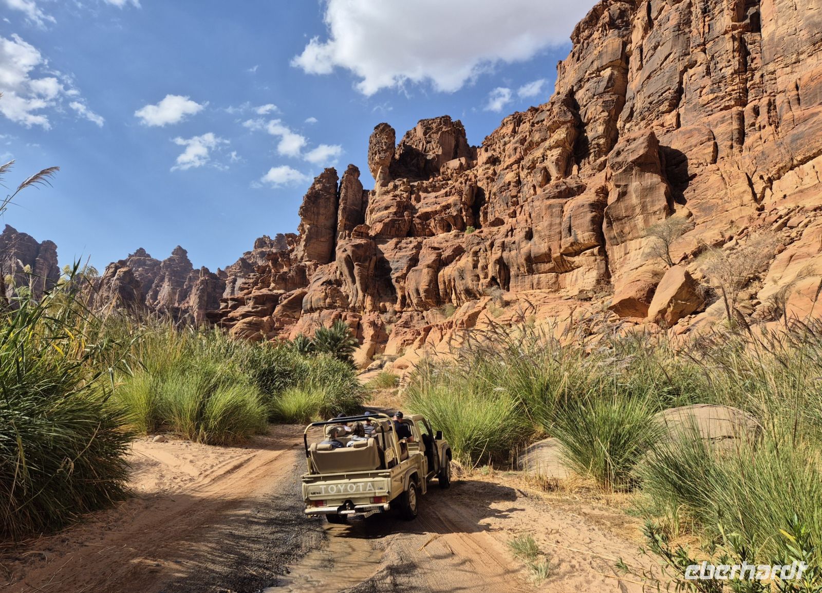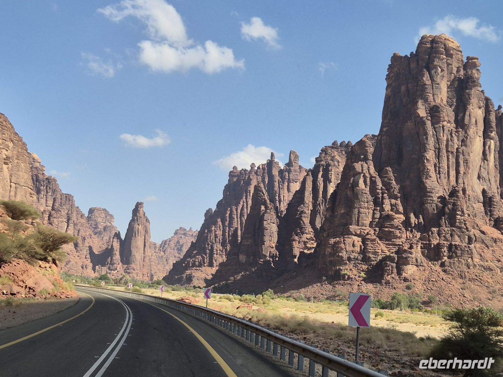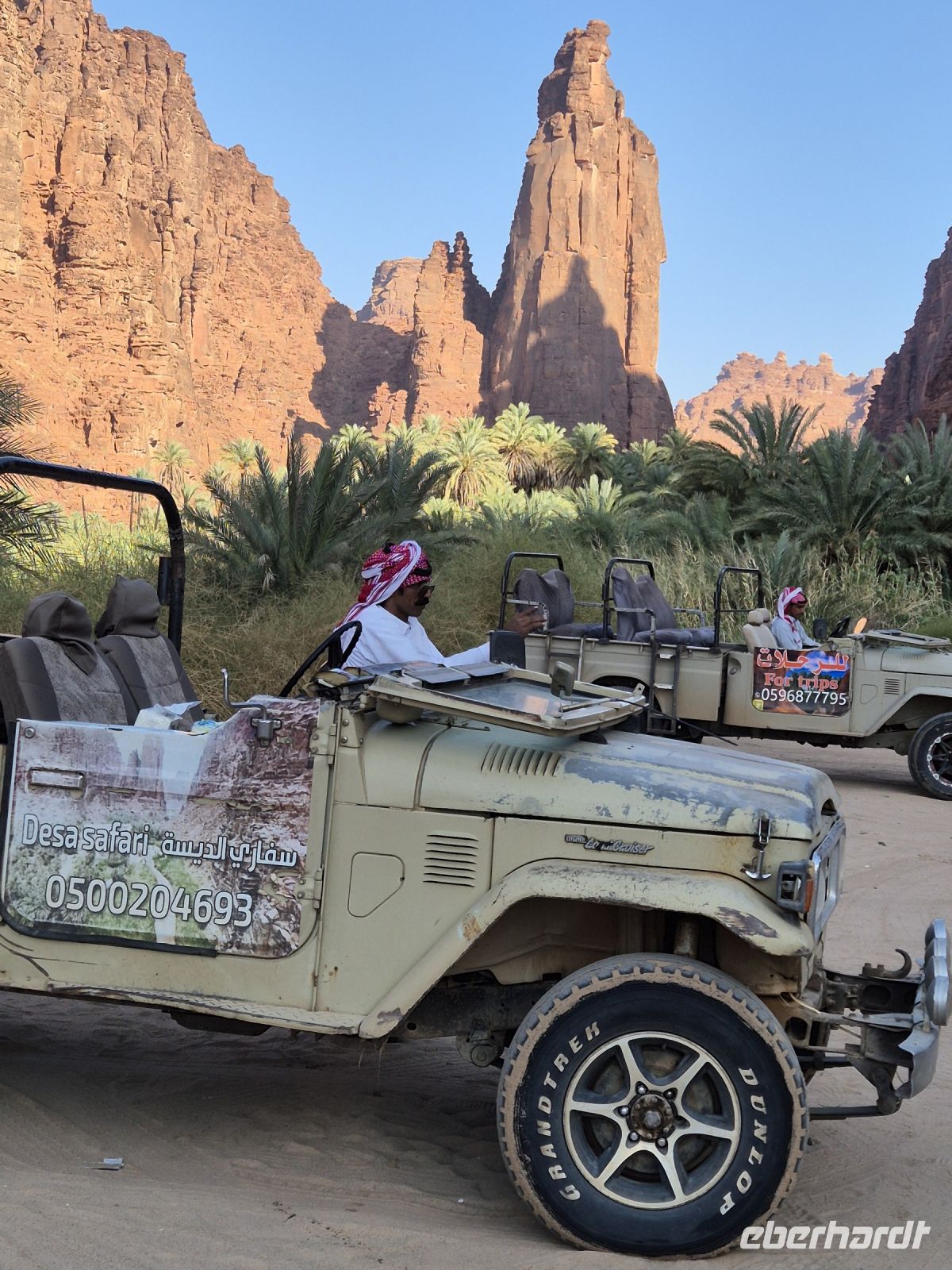 Mittags erreichen wir das Wadi Dissah, welches zu den spektakulärsten Landschaften in Saudi Arabien zählt. Diese tief eingeschnittene Schlucht ist ca. 25 Kilometer lang. Einzelne Felsen ragen bis zu 500 Meter in die Höhe. Das stetig fließende Wasser sorgt für eine üppige Vegetation im Wadi.