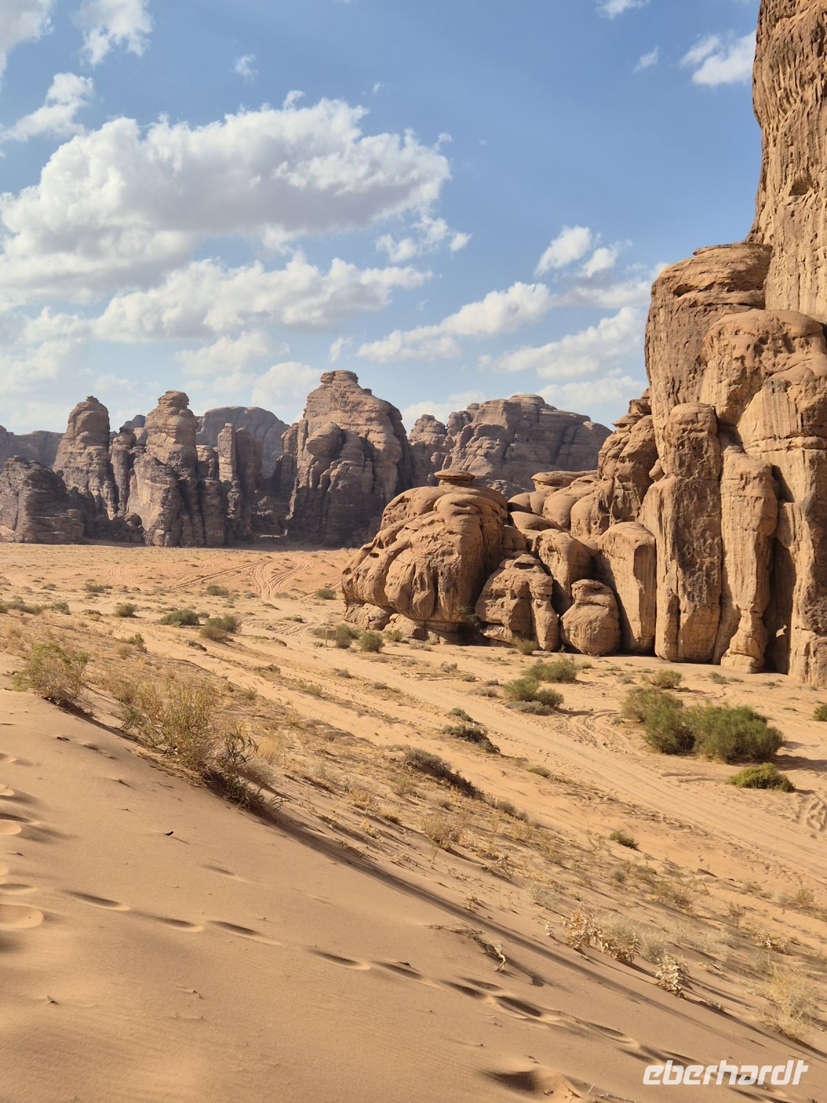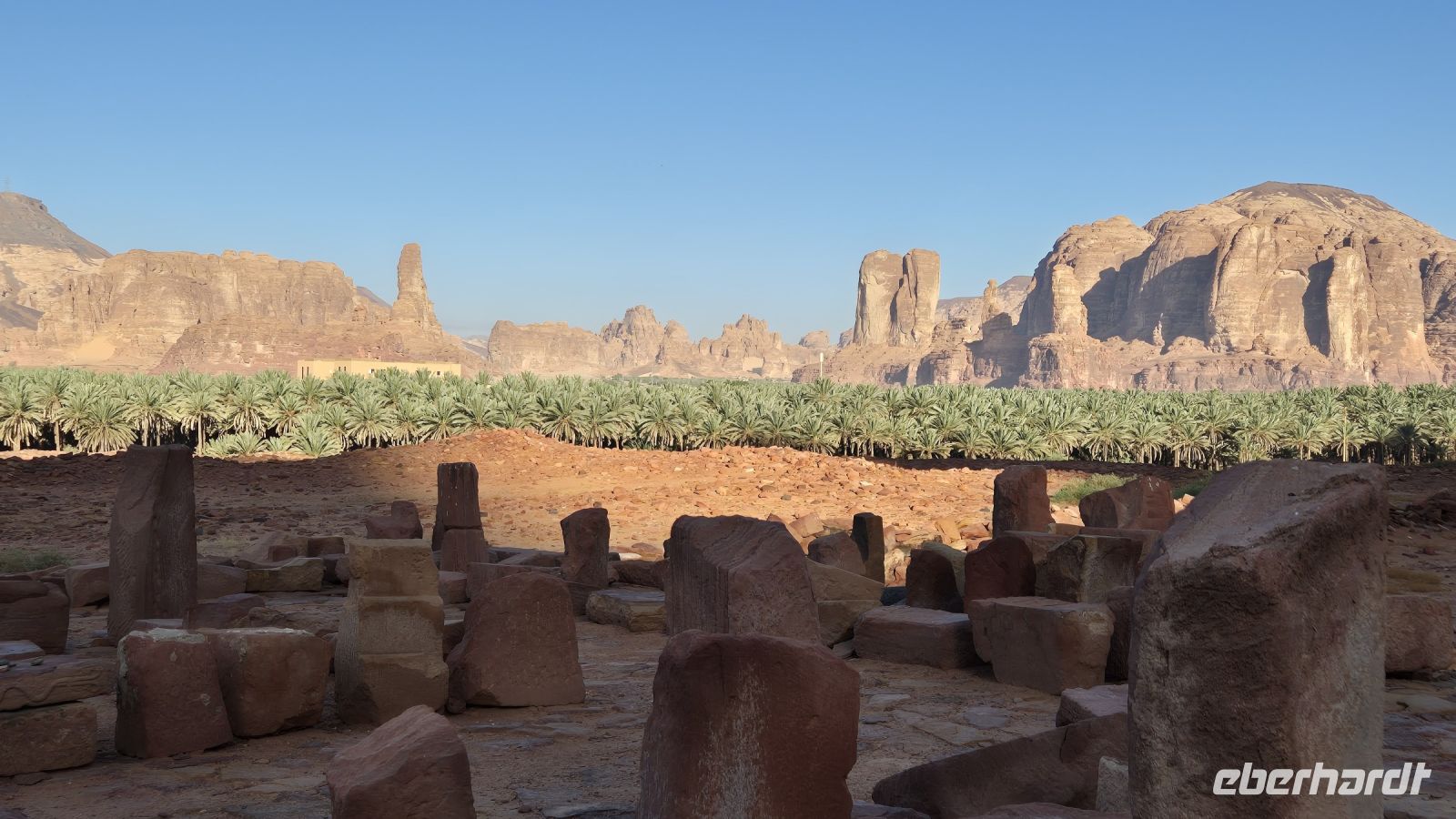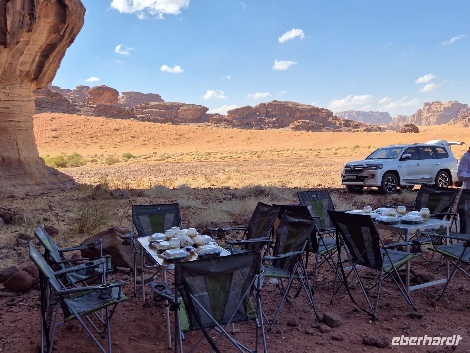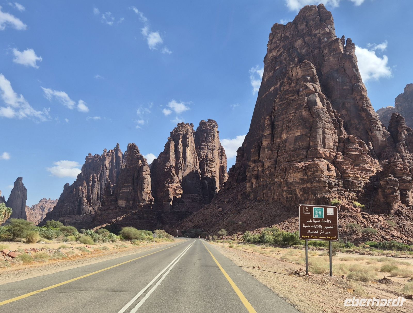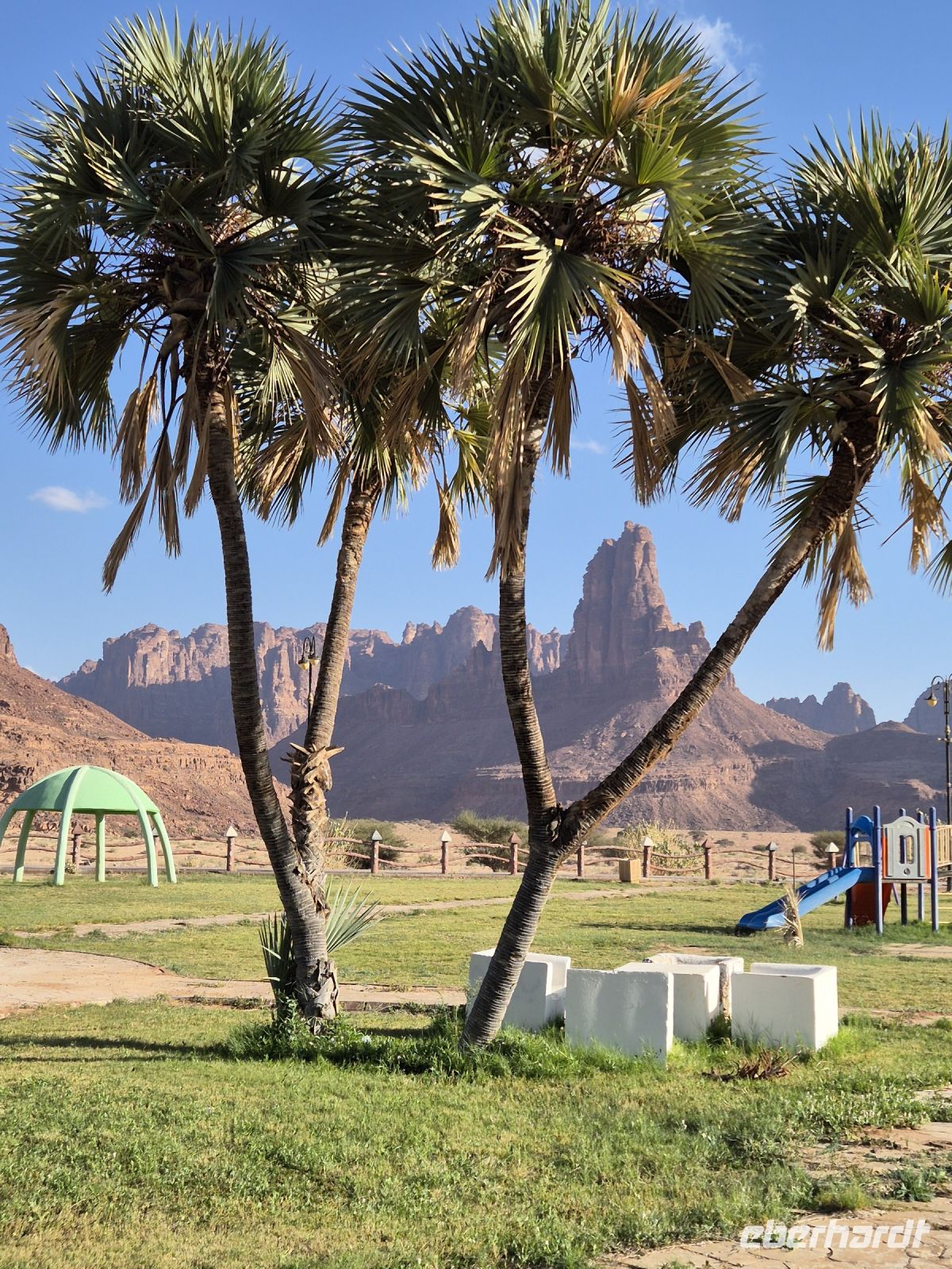 Mittags erreichen wir das Wadi Dissah, welches zu den spektakulärsten Landschaften in Saudi Arabien zählt. Diese tief eingeschnittene Schlucht ist ca. 25 Kilometer lang. Einzelne Felsen ragen bis zu 500 Meter in die Höhe. Das stetig fließende Wasser sorgt für eine üppige Vegetation im Wadi.