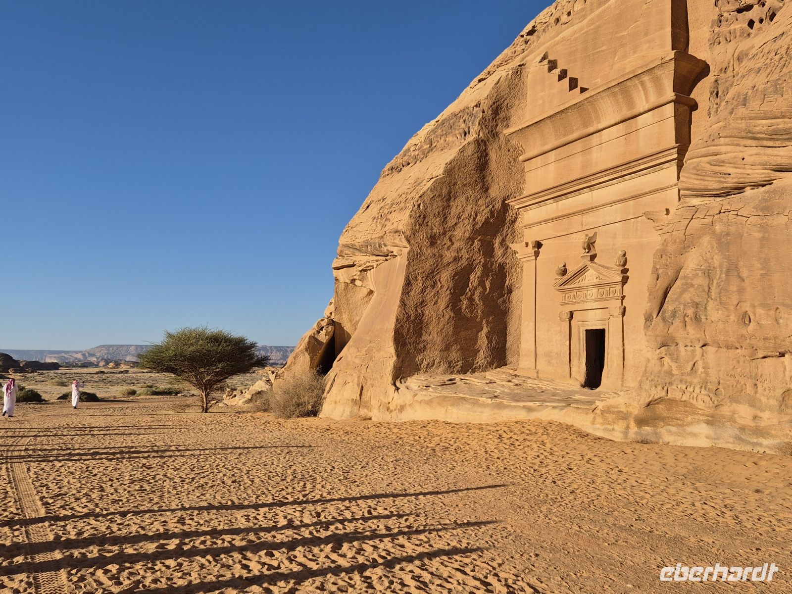 Für uns beginnt der Tag sehr früh. Schon 6.00 Uhr am Morgen starten wir vom Hotel ins Besucherzentrum von Hegra. Der Vorteil am frühen Morgen ist, dass wir für die Besichtigung angenehme Temperaturen haben. Die Lage an der Weihrauchstraße, große unterirdische Wasservorkommen und fruchtbarer Boden waren gute Voraussetzungen für Entstehung verschiedener Hochkulturen in der vorislamischen Zeit. Über zwei Jahrhunderte hatten die Nabatäer hier ihren südlichsten Außenposten. Im nabatäischen Hegra, arabisch "Mada´in Saleh", besichtigen wir in dem 52 Hektar großen Areal folgende Stätten: