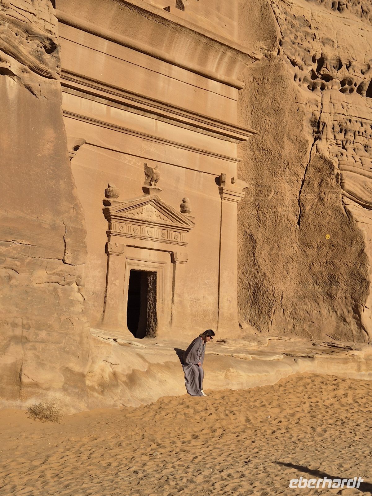3.) Qasr Al Farid (Tomb of Lihyan son of Kuza). Mit ihrer exponierten Lage und ihrer Größe von 21 Metern avancierte dieses Grab zum Symbol von Mada´in Saleh. Das Grab wurde nicht vollendet. Zu den möglichen Gründen dafür, hören wir verschiedene Theorien: war Lihyan ein großer Feldherr, der fernab von Hegra im Kampf starb? Konnte das Grab mangels finanzieller Mittel nicht fertig gestellt werde? Hat man die Arbeiten eingestellt, weil sich in der Grabfassade ein großer Riss gebildet hat?