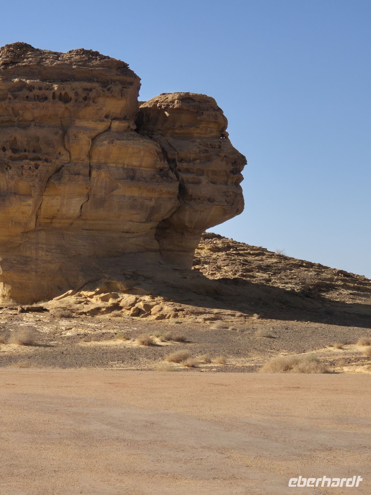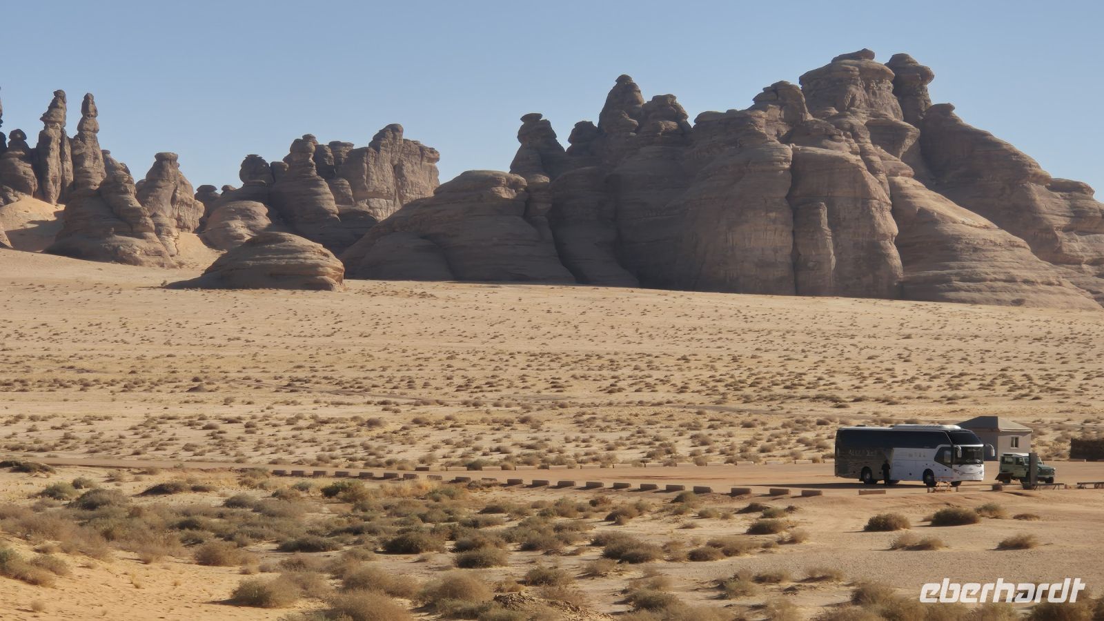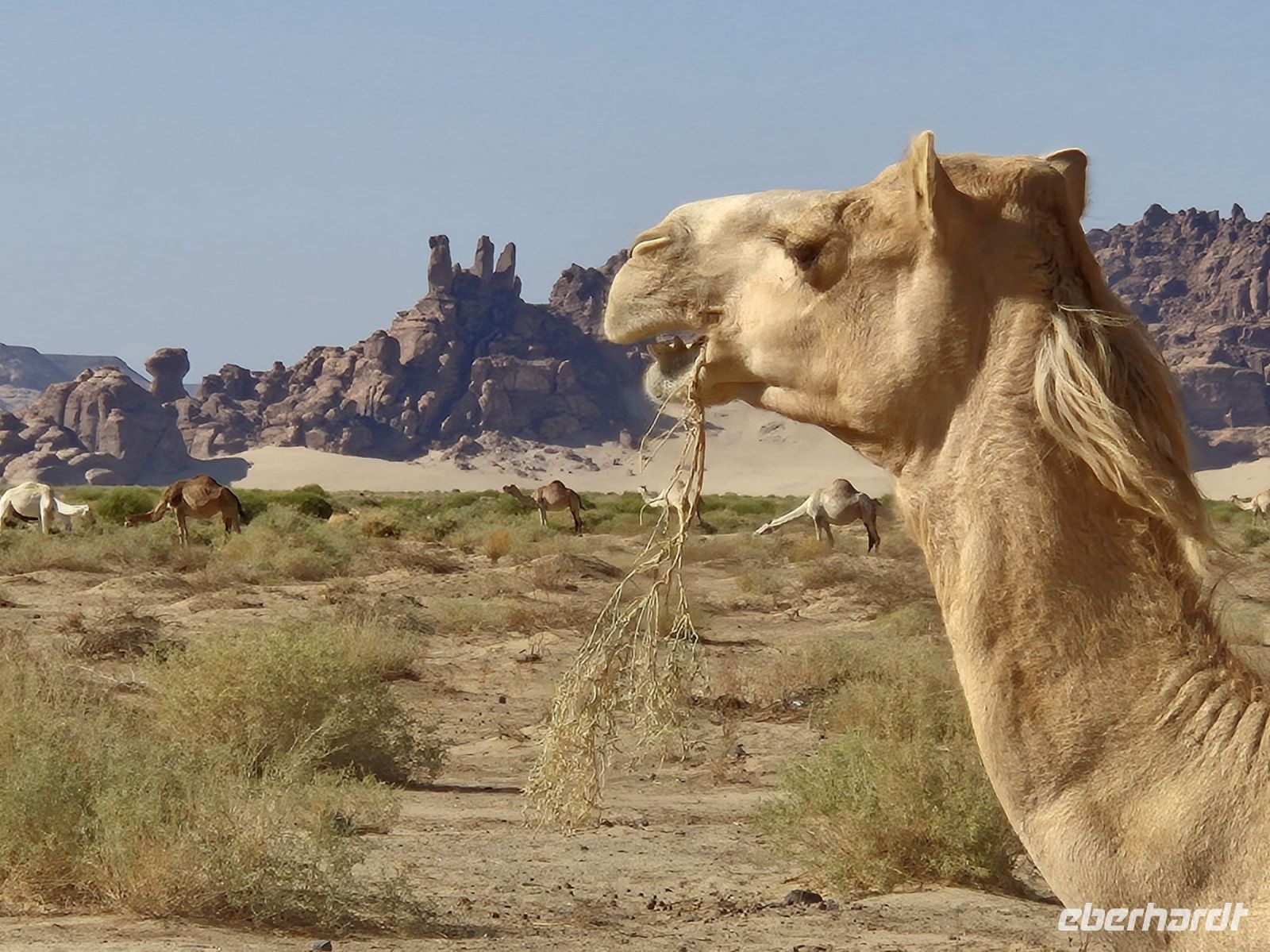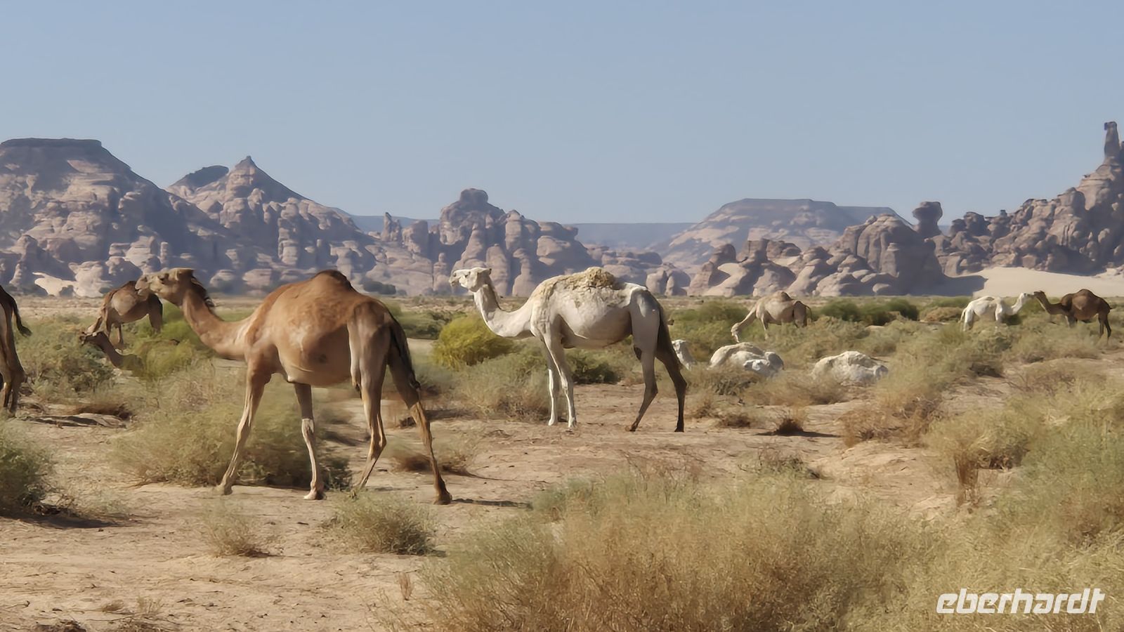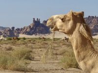 Am Nachmittag dann ist unser erstes Ziel der imposante Felsenbogen von Madachil. Die Fahrt dorthin führt durch eine wunderschöne Landschaft mit bizarren Sandsteinfelsen. Wenn es unterwegs etwas Interessantes zu sehen gibt, halten wir einfach an, zum Beispiel bei einem Kamelhinweisschild,, bei einer Bahnstation der früheren Hedschasbahn, wo uns Muhammad auch eine Art „Wüstenmelone“ erklärt oder bei dem besonders schönem Motiv einer Kamelherde vor eindrucksvoller Bergkulisse.