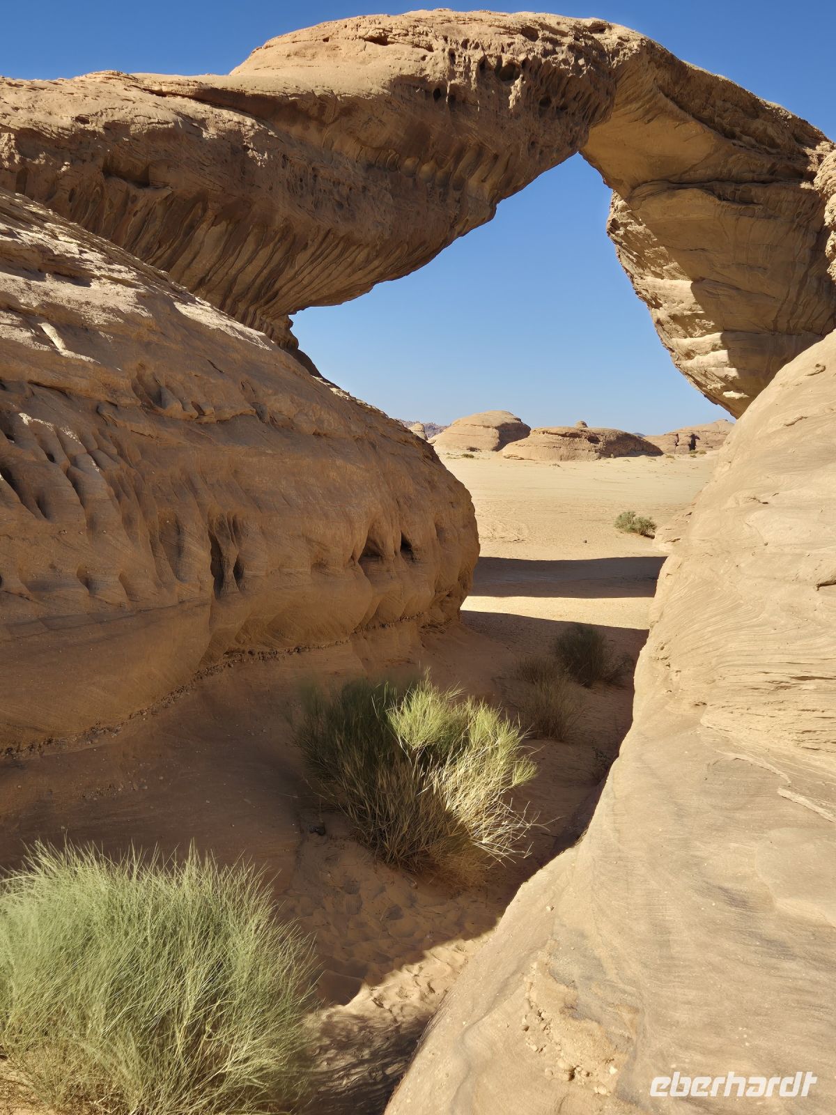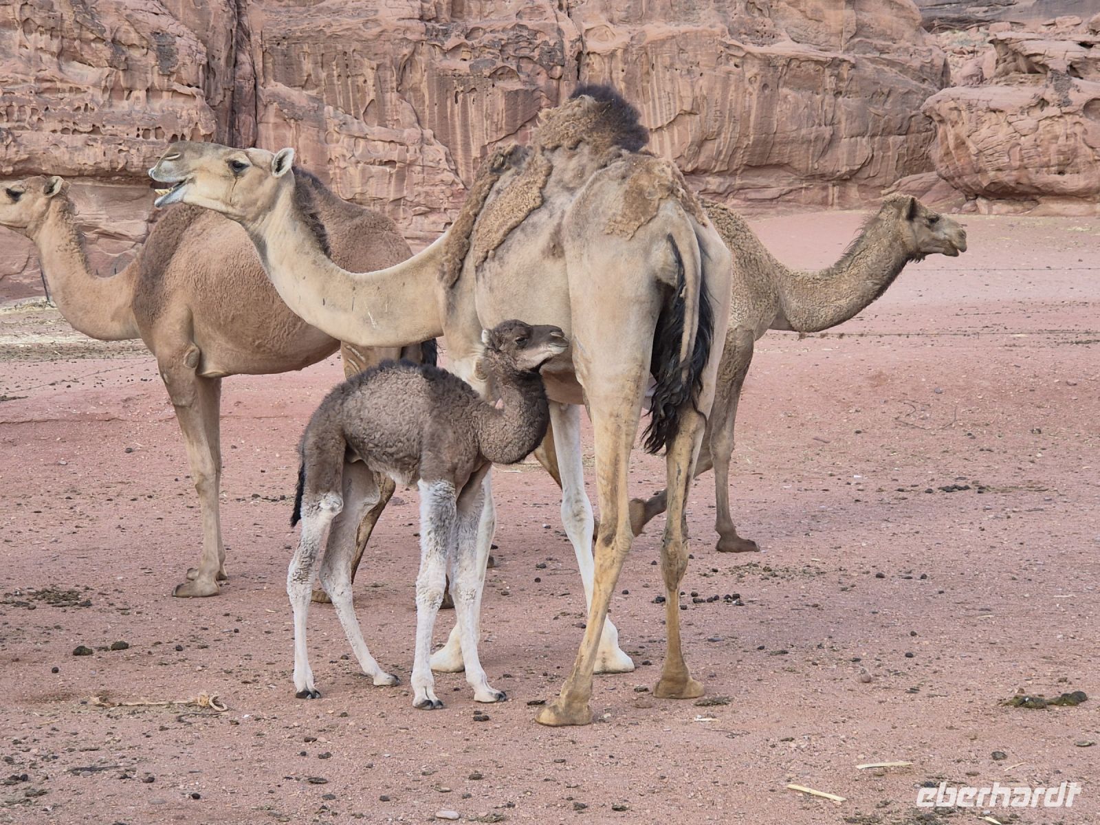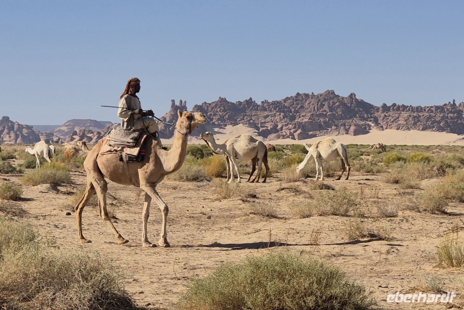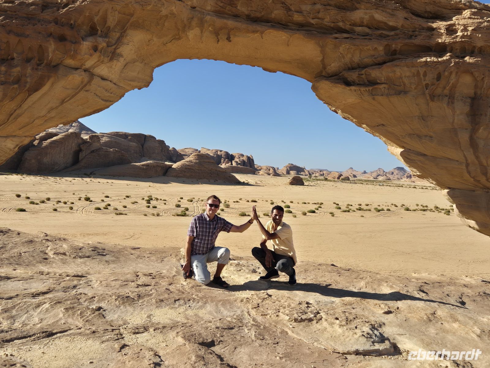 Am Nachmittag dann ist unser erstes Ziel der imposante Felsenbogen von Madachil. Die Fahrt dorthin führt durch eine wunderschöne Landschaft mit bizarren Sandsteinfelsen. Wenn es unterwegs etwas Interessantes zu sehen gibt, halten wir einfach an, zum Beispiel bei einem Kamelhinweisschild,, bei einer Bahnstation der früheren Hedschasbahn, wo uns Muhammad auch eine Art „Wüstenmelone“ erklärt oder bei dem besonders schönem Motiv einer Kamelherde vor eindrucksvoller Bergkulisse.