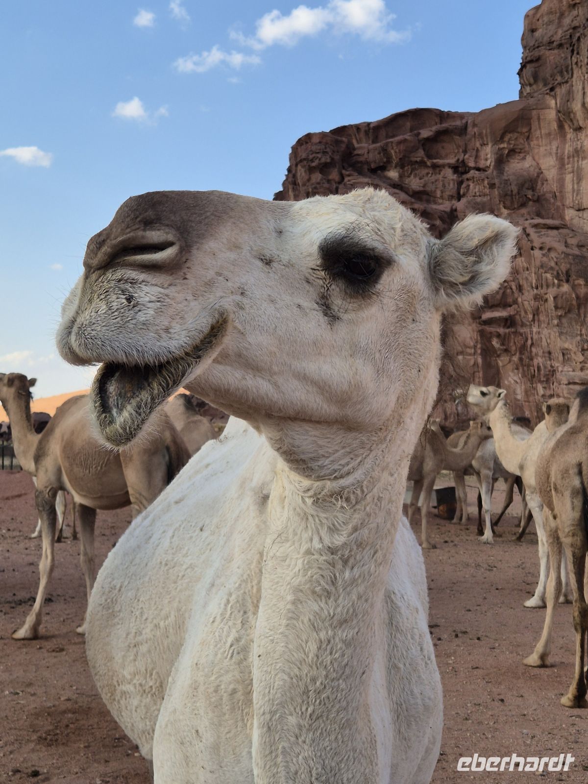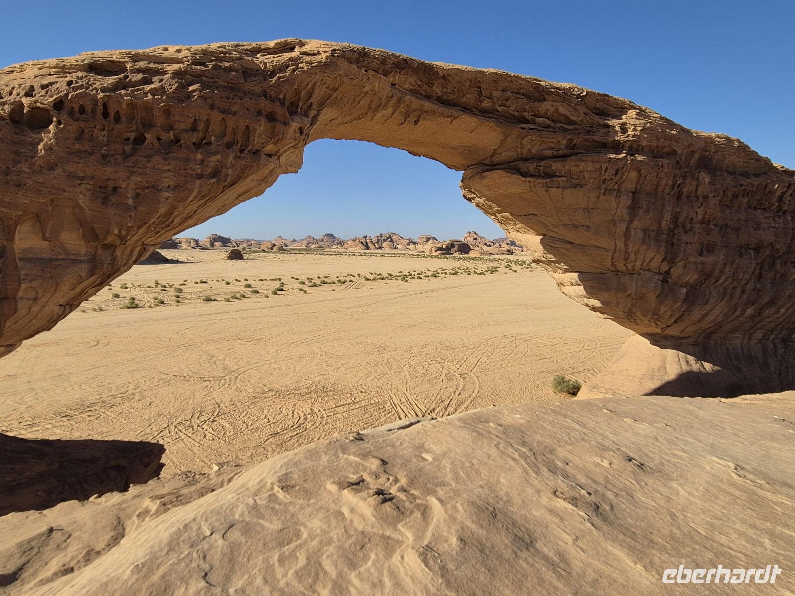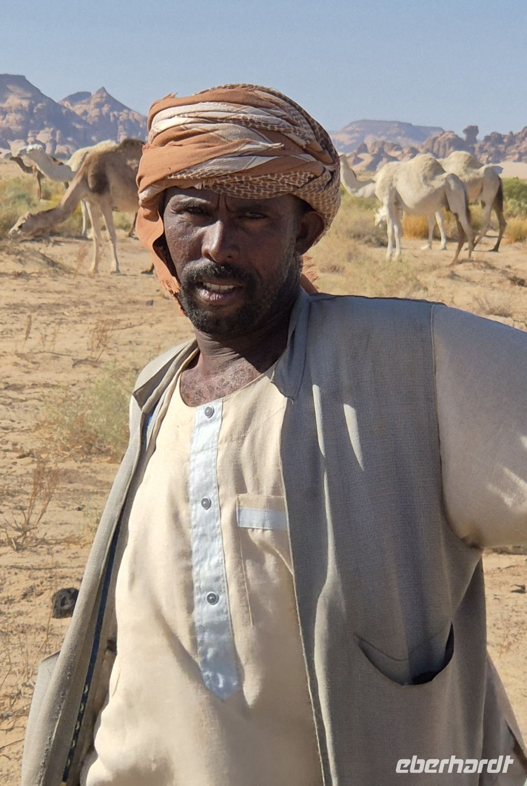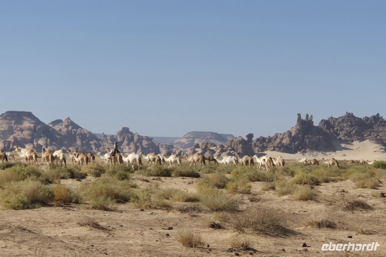 Am Nachmittag dann ist unser erstes Ziel der imposante Felsenbogen von Madachil. Die Fahrt dorthin führt durch eine wunderschöne Landschaft mit bizarren Sandsteinfelsen. Wenn es unterwegs etwas Interessantes zu sehen gibt, halten wir einfach an, zum Beispiel bei einem Kamelhinweisschild,, bei einer Bahnstation der früheren Hedschasbahn, wo uns Muhammad auch eine Art „Wüstenmelone“ erklärt oder bei dem besonders schönem Motiv einer Kamelherde vor eindrucksvoller Bergkulisse.
