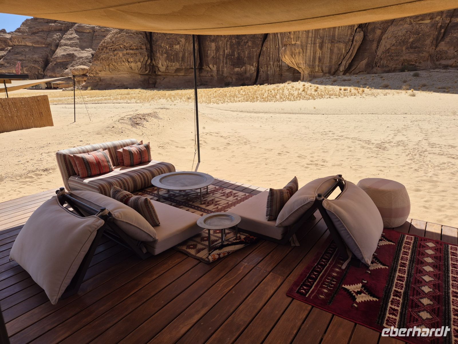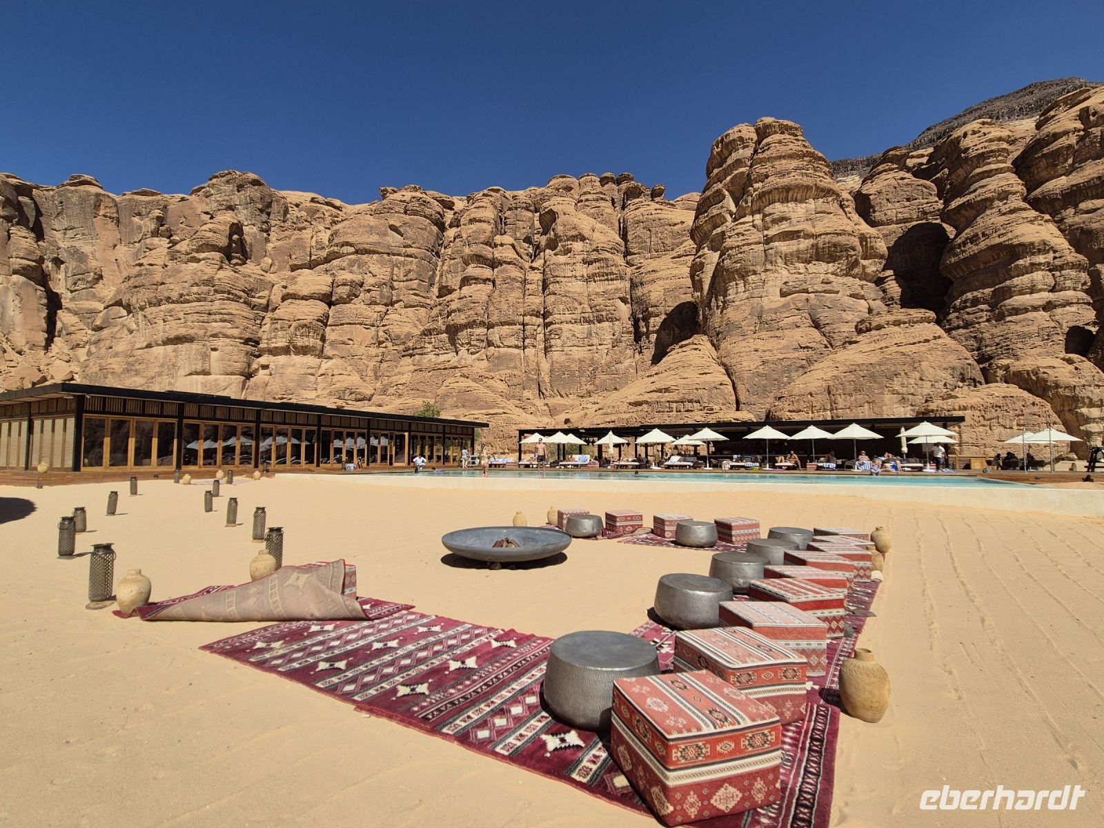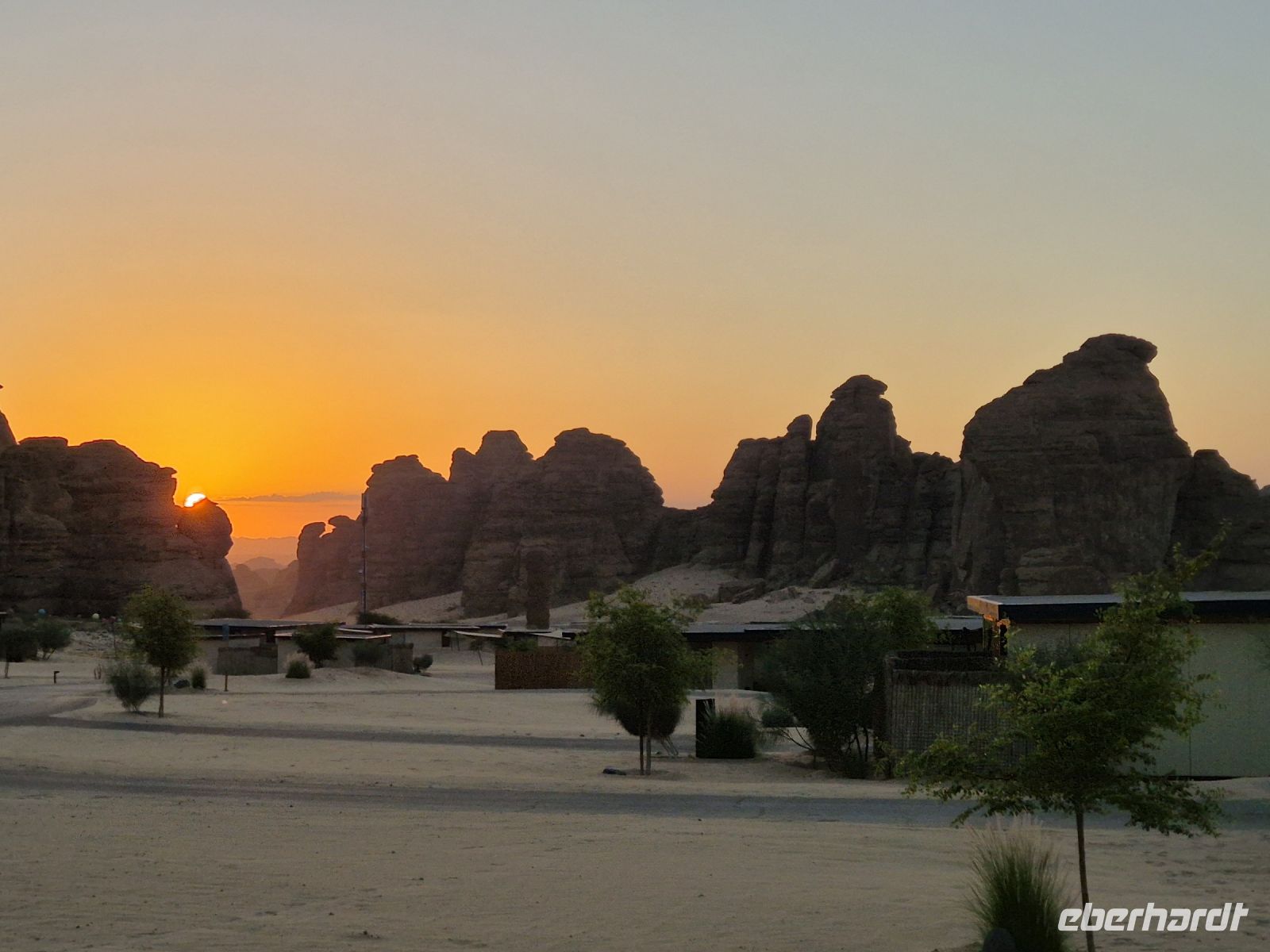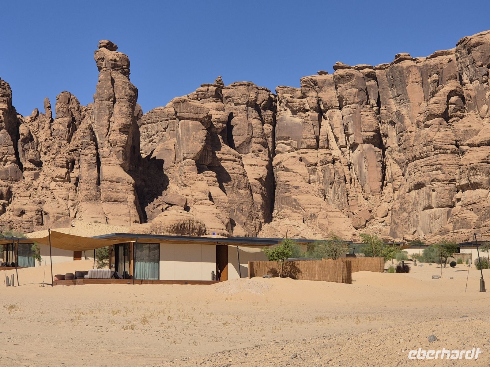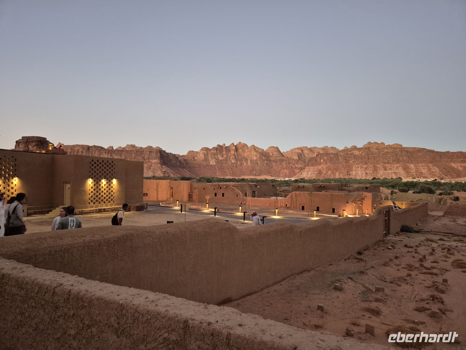 Je näher wir Al Ula kommen, umso interessanter wird die Landwirtschaft, welche zunehmend von Bergen geprägt wird. Als wir Al Ula erreichen, lässt die tief stehende Sonne die Sandsteinfelsen in rotbraunem Farbtönen strahlen. Wir freuen uns jetzt auf drei Nächte im komfortablen Fünfsterne-Ressort Our Habitas Al Ula. Dieses befindet sich im vielleicht schönsten Seitental von Al Ula. In dieses Tal haben nur Hotelgäste und Leute mit einer Genehmigung Zutritt. Im gleichen Tal befindet sich auch die berühmte Konzerthalle Maraya.