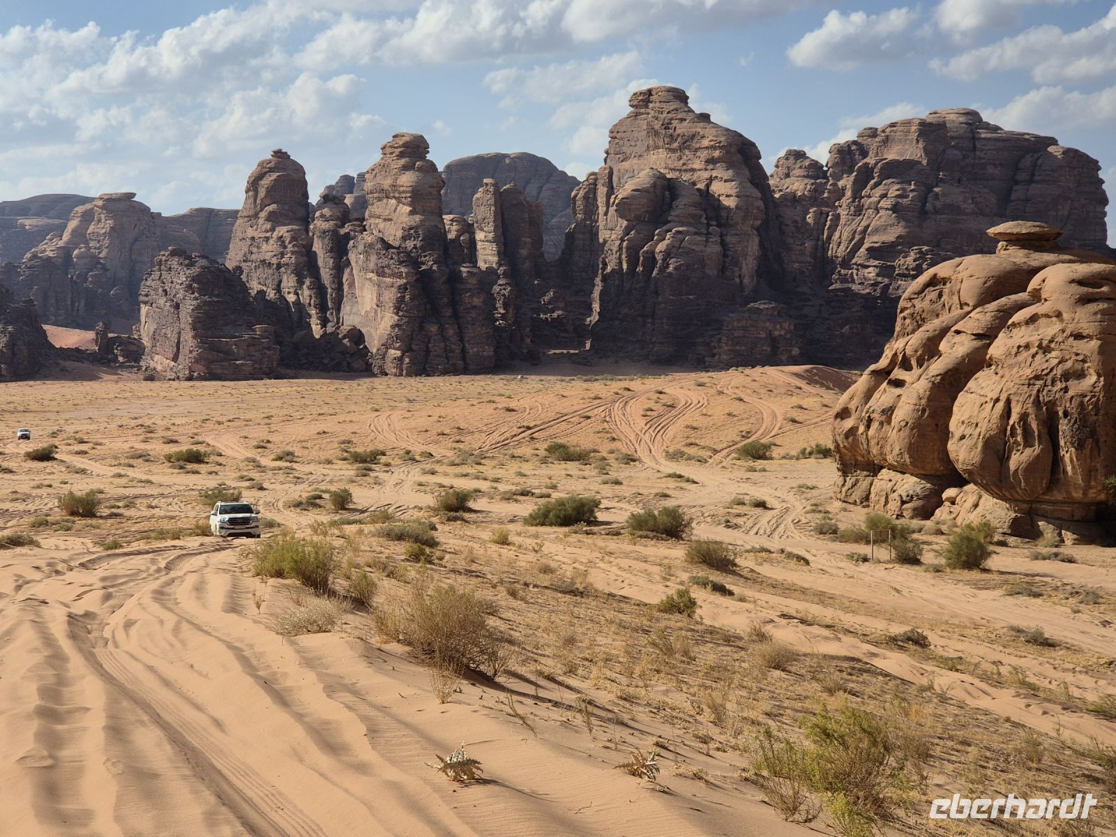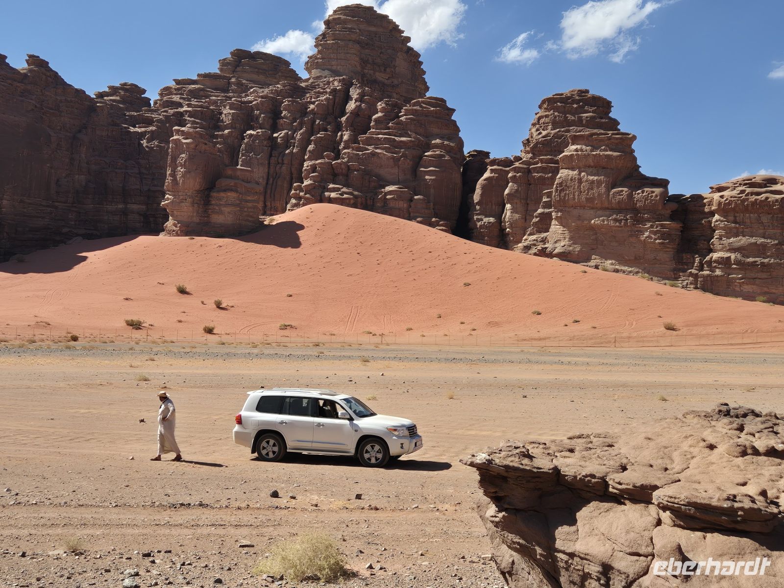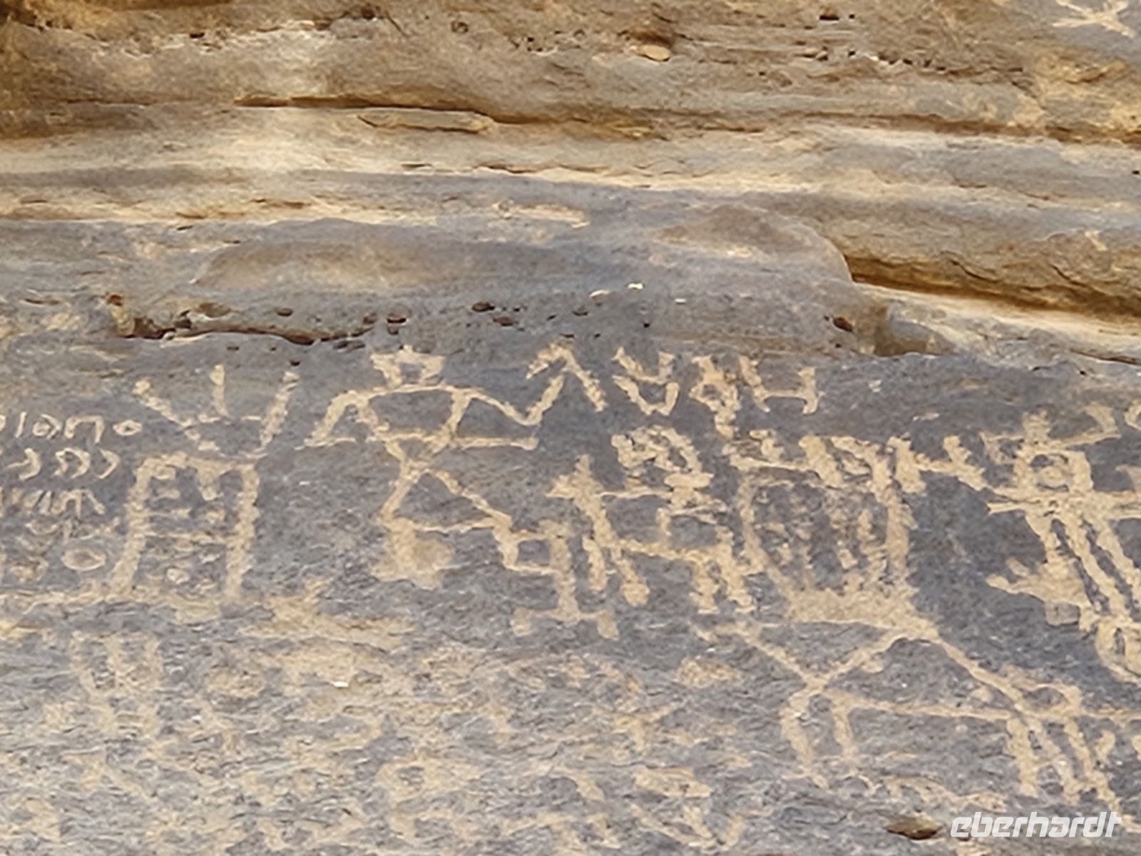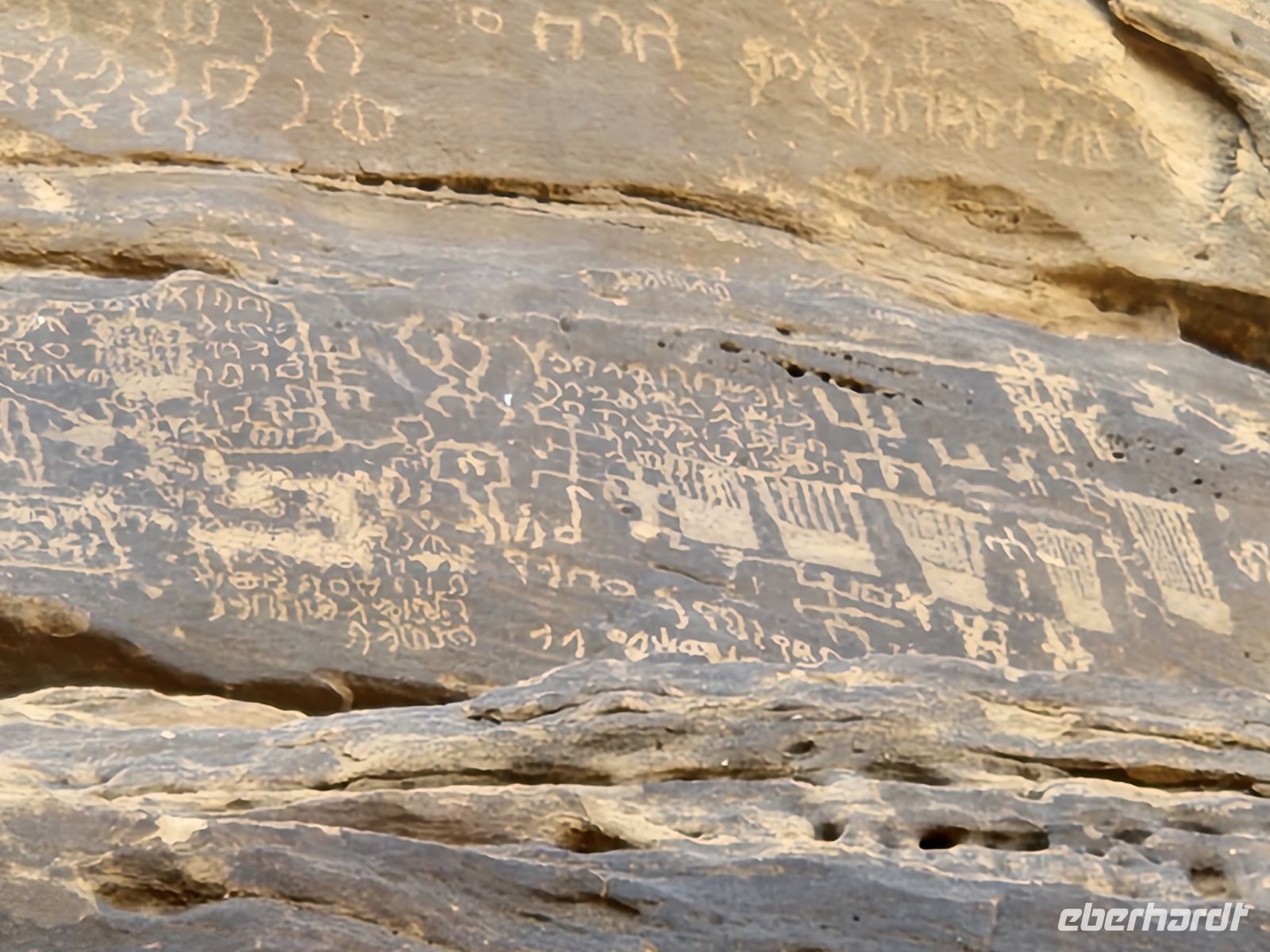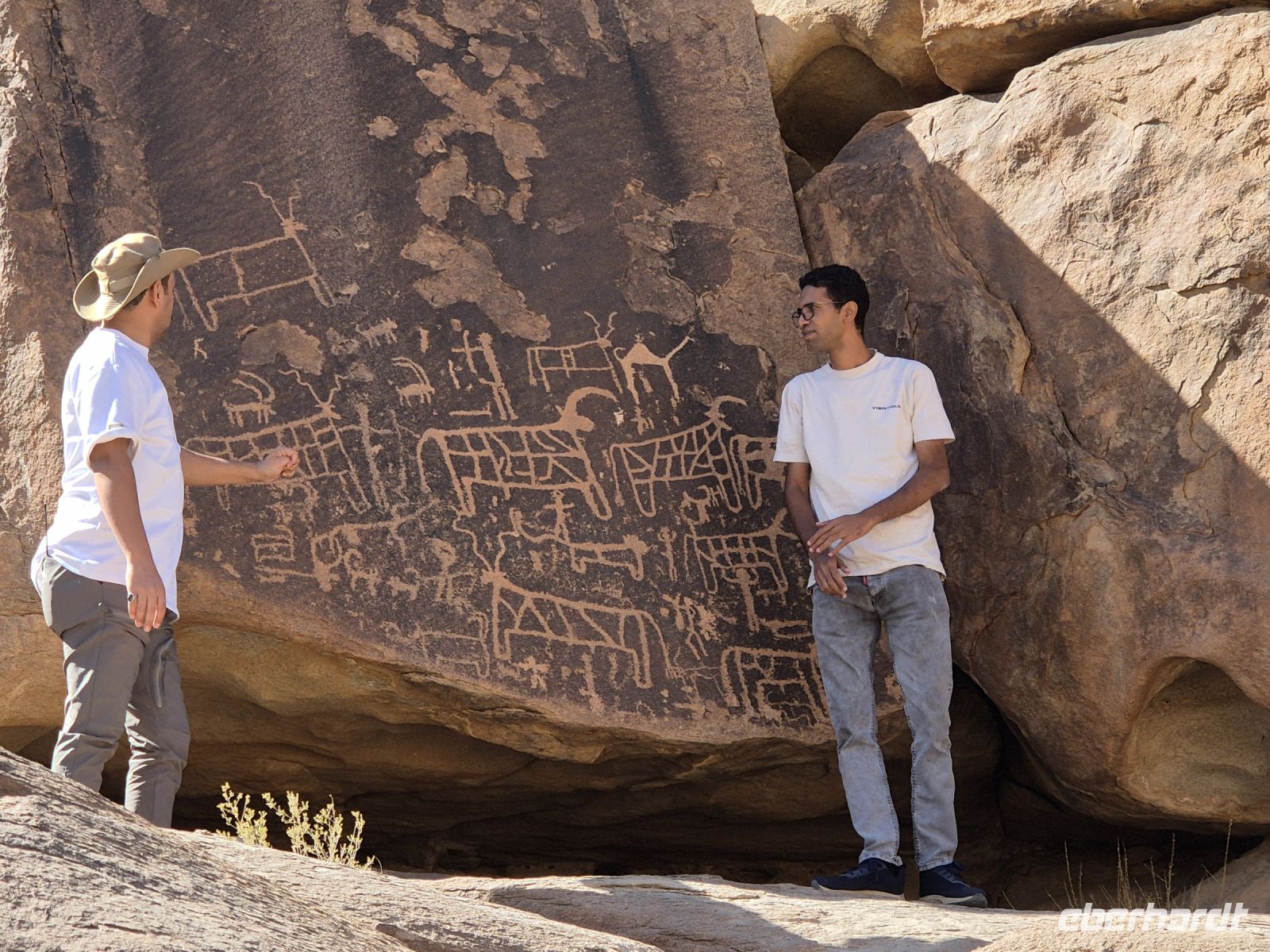 Tabuk ist für uns der ideale Ausgangspunkt, um die faszinierenden Gesteinsformationen und Wüstenlandschaften der Region zu entdecken. Auf fünf Toyota Land Cruiser verteilt und per Walkie-Talkie miteinander in Kontakt starten wir in den Nordwesten. Den Cheffahrer, seine Name ist Shahir, kenne ich bereits vom letzten Jahr. Er arbeitet als Lehrer an einer Sonderschule und verdient sich als Guide etwas dazu. Es ist Vorschrift, dass in dieser sensiblen Region mit einer wichtigen Militärbasis und der Nähe zu Ägypten und Jordanien ein Saudi mit an Bord kommt. Er zeigt uns zunächst den Jabal Safina (deutsch „Schiffsberg“). Sein Kollege Abdullah erläutert uns mit viel Begeisterung und Enthusiasmus einige Inschriften und erzählt vom „schwarzen Brett“ hier an der alten Handelsroute.