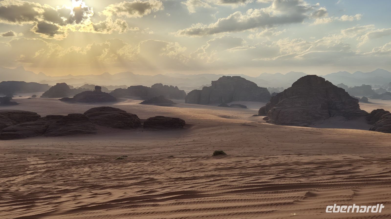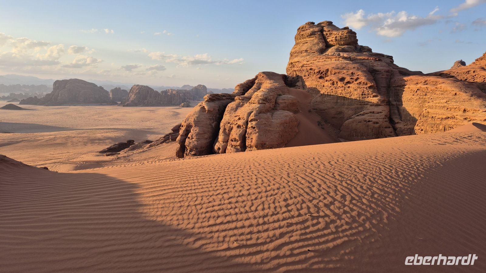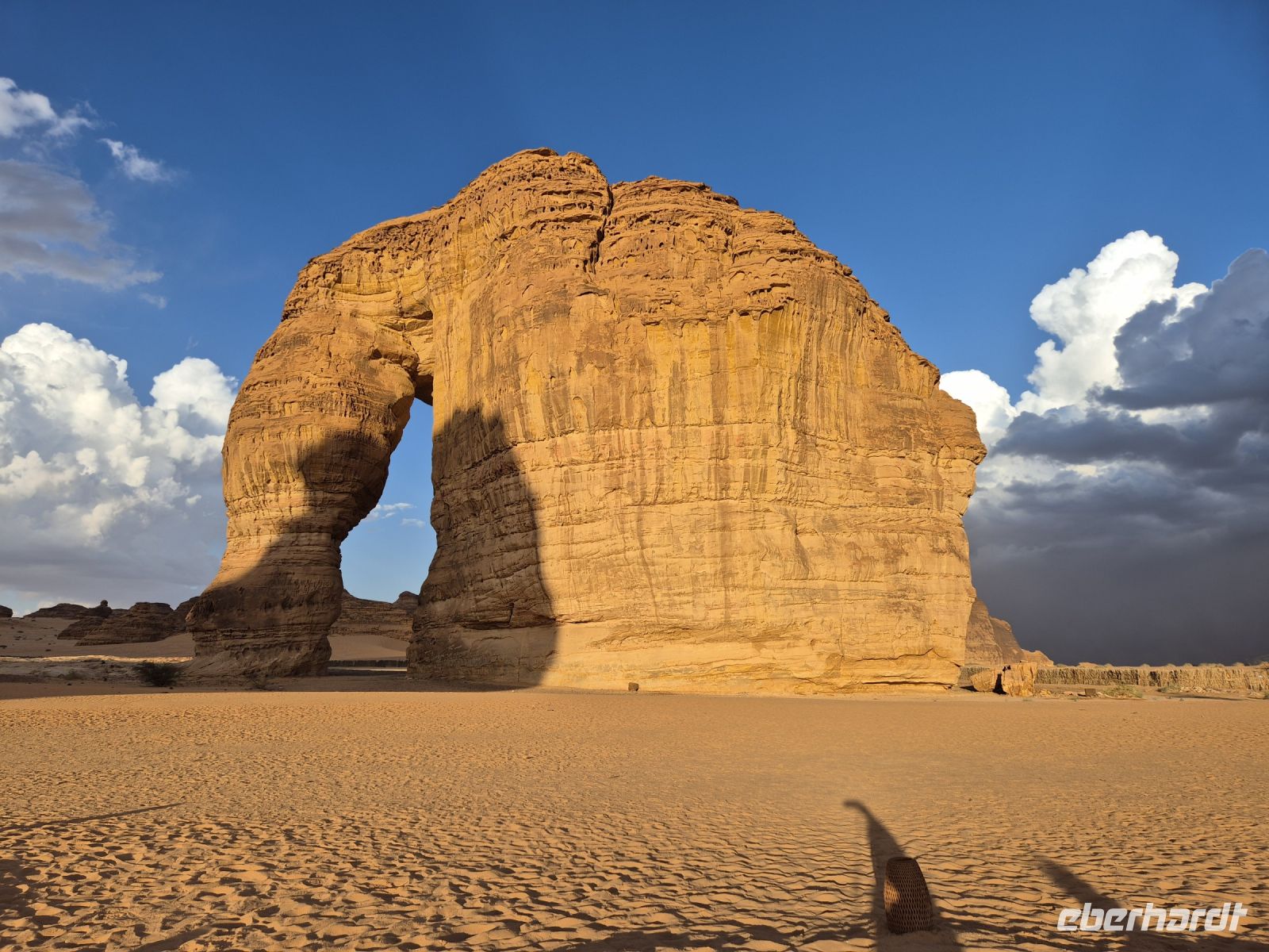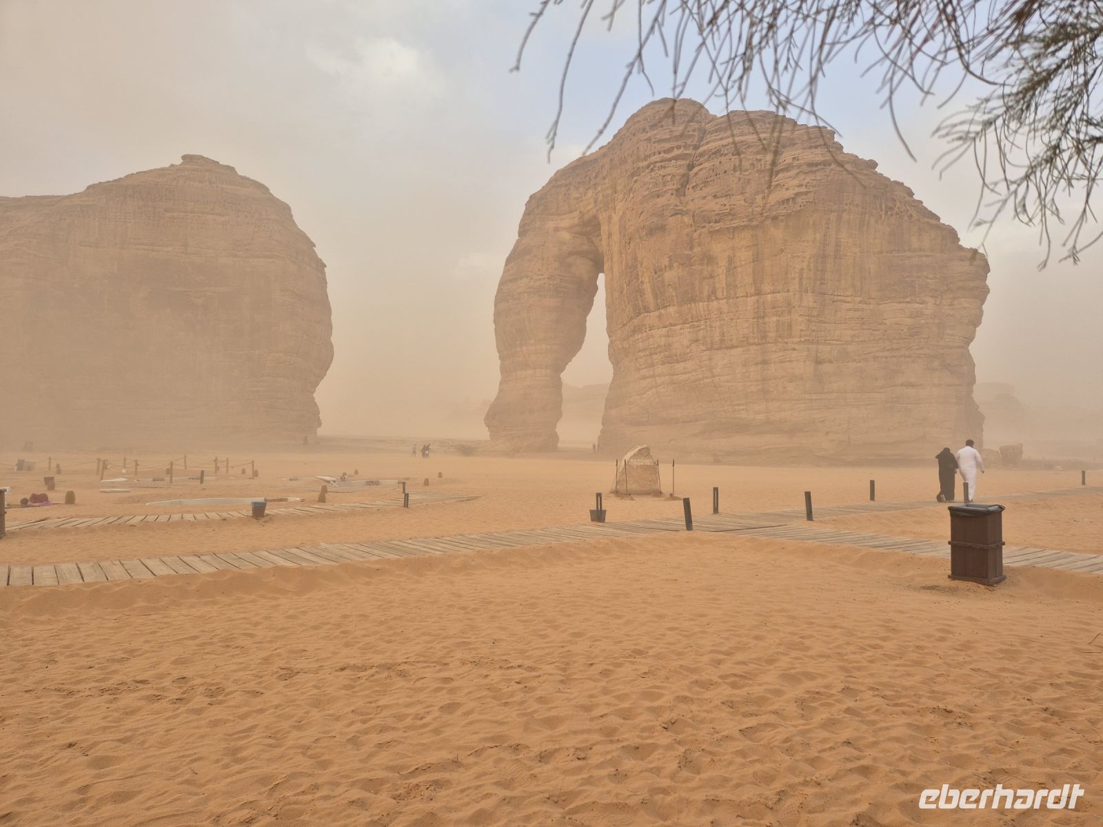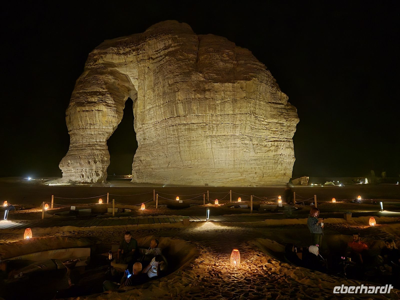 Auch heute haben wir tagsüber etwas Freizeit, die wir im Ressort verbringen. Am Nachmittag fahren wir zum Elephant Rock. Der riesige Sandsteinfels in Form eines Elefanten gilt als Wahrzeichen von Al Ula. Vor dem Elephant Rock hat man originelle Sitzmöglichkeiten in kreisförmigen Vertiefungen geschaffen. Unser Plan, hier zum Sonnenuntergang und in den Abend hinein zu bleiben, wird vom Wetter durchkreuzt. Es ziehen dunkle Wolken auf, die einen Sandsturm und ein paar Regentropfen mit sich bringen. Nach dem Abendessen im nicht weit entfernt gelegenem Sahary Camp hat sich der Sturm verzogen. Wir kehren noch einmal zum Elephant Rock zurück um ihn jetzt bei Nacht angestrahlt zu sehen.