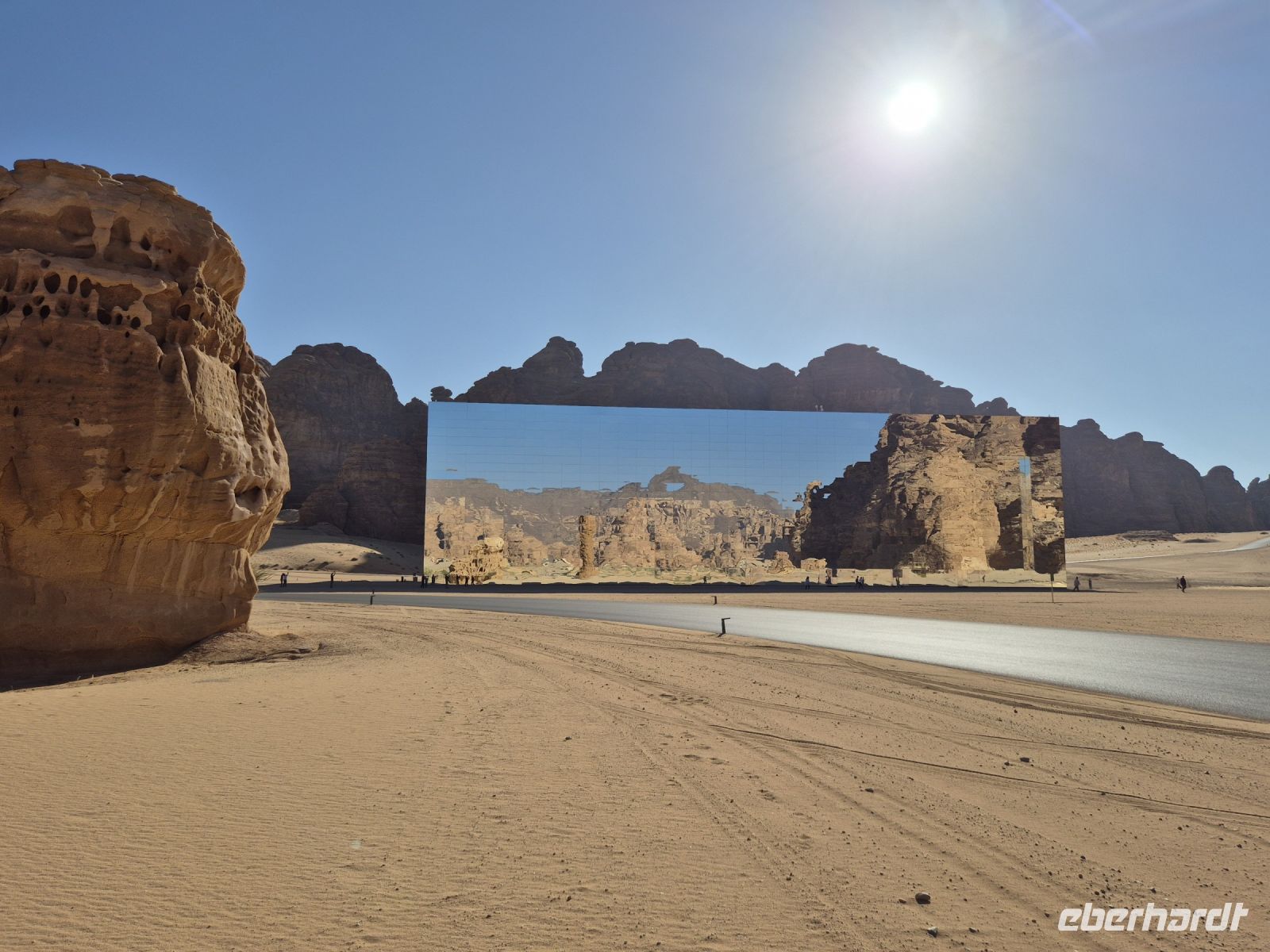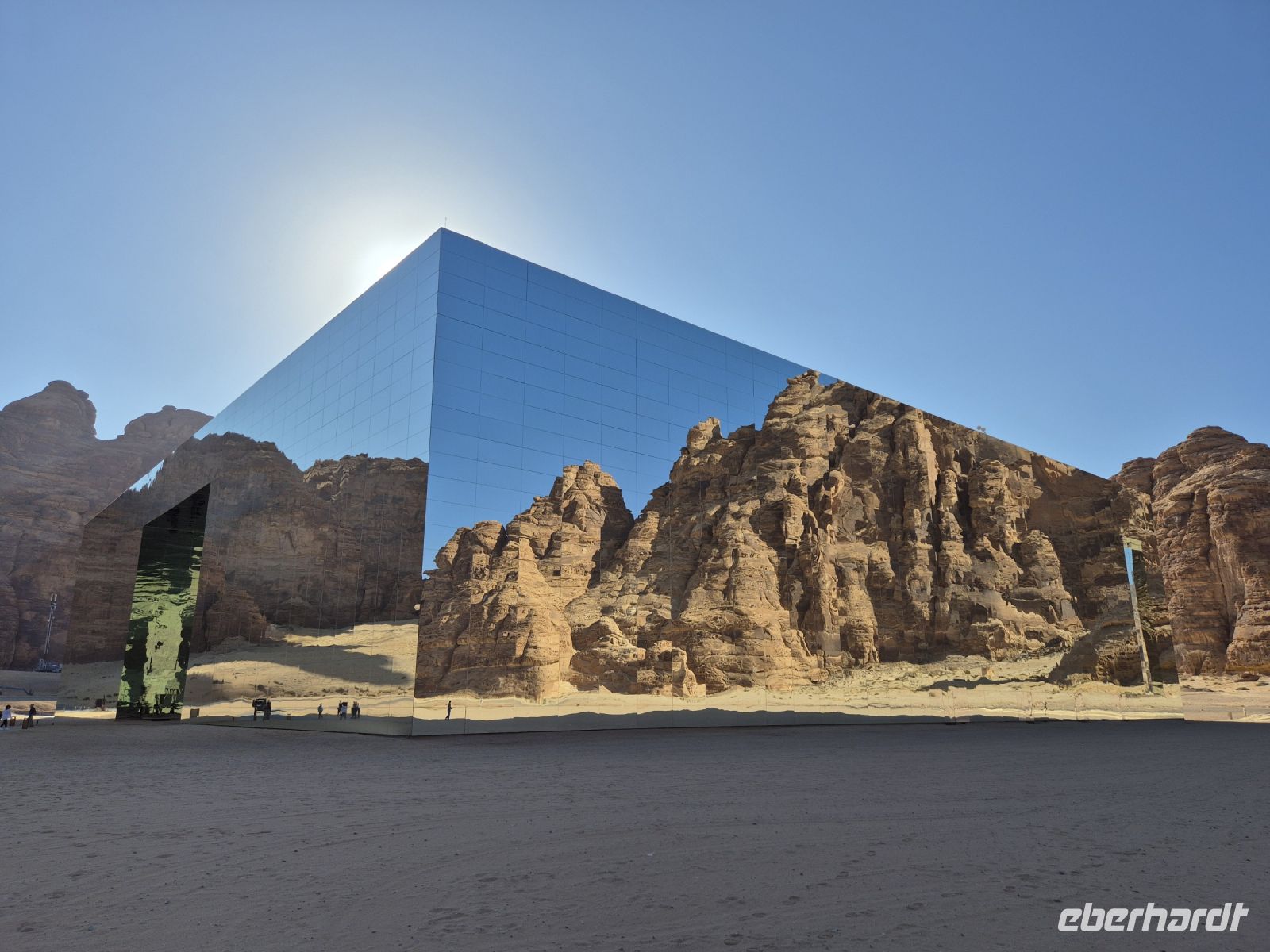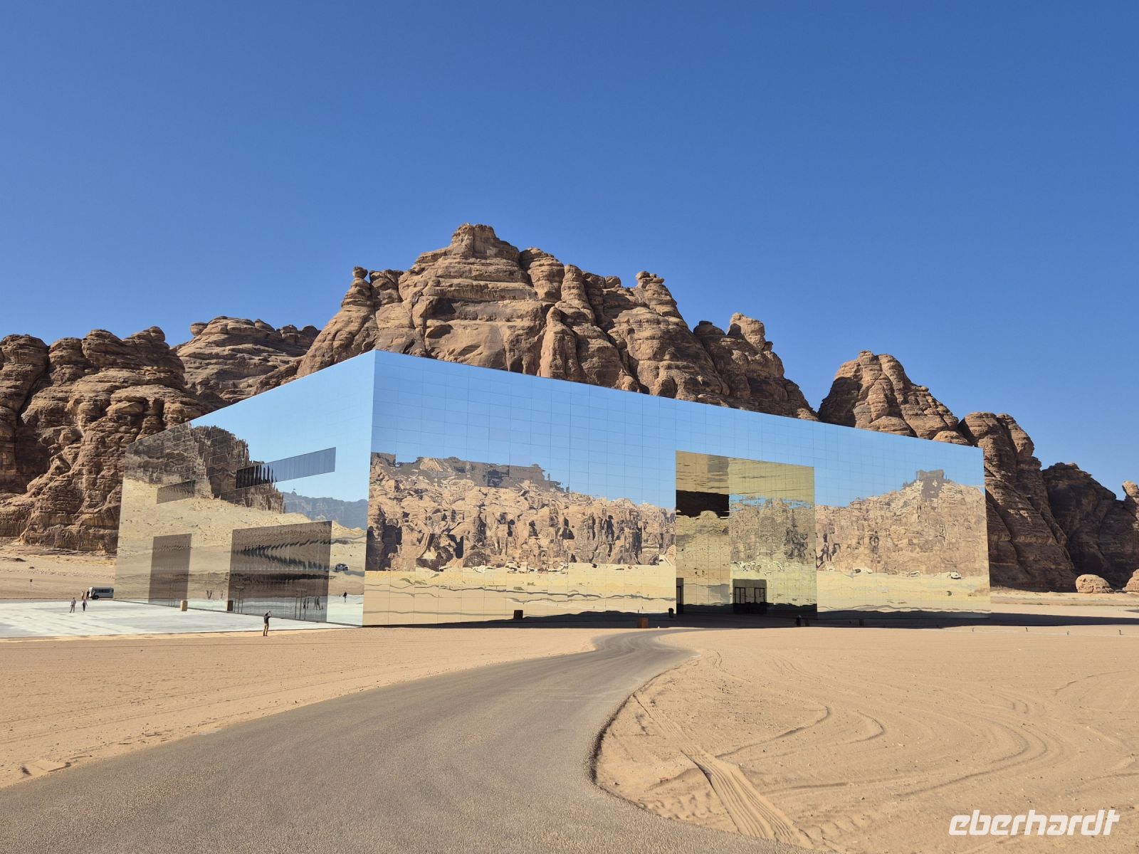 Bevor wir uns von Al Ula verabschieden, erwartet uns noch ein echter Höhepunkt – die Konzerthalle Maraya. Sie befindet sich in diesem grandiosen Al Ashar Tal mit seinen faszinierenden Sandsteinfelsen. Saudi Arabien wollten in dieser wunderschönen Natur eine Konzerthalle errichten, ohne dass das Landschaftsbild gestört wird. Der ausgewählte italienische Architekt hatte die Idee, die Fassade der Konzerthalle mit 5.000 einzelnen Teilen zu verspiegeln. Damit lag auch der Name der Konzerthalle auf der Hand, denn „Maraya“ bedeutet im Arabischen einfach nur „Spiegel“. Wir bestaunen und fotografieren Maraya von allen Seiten, immer wieder ergeben sich je nach Standort interessante Perspektiven.