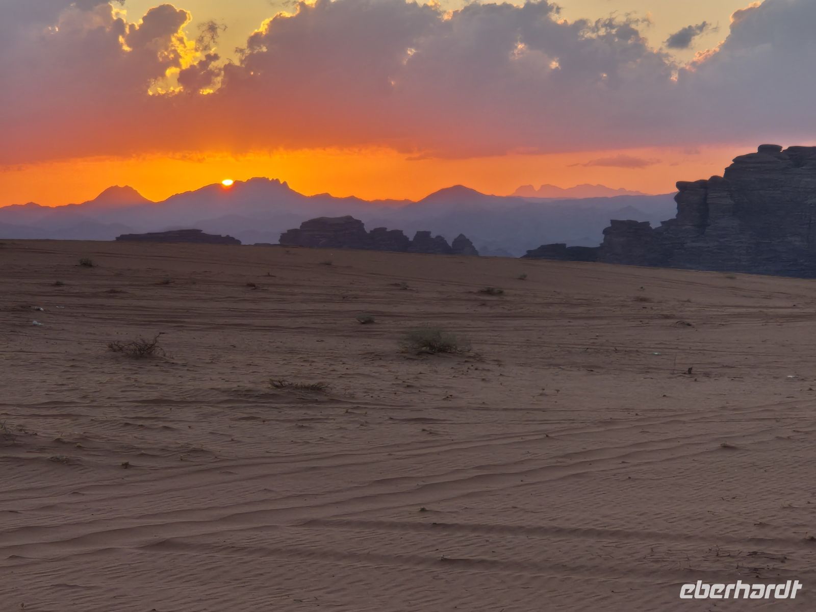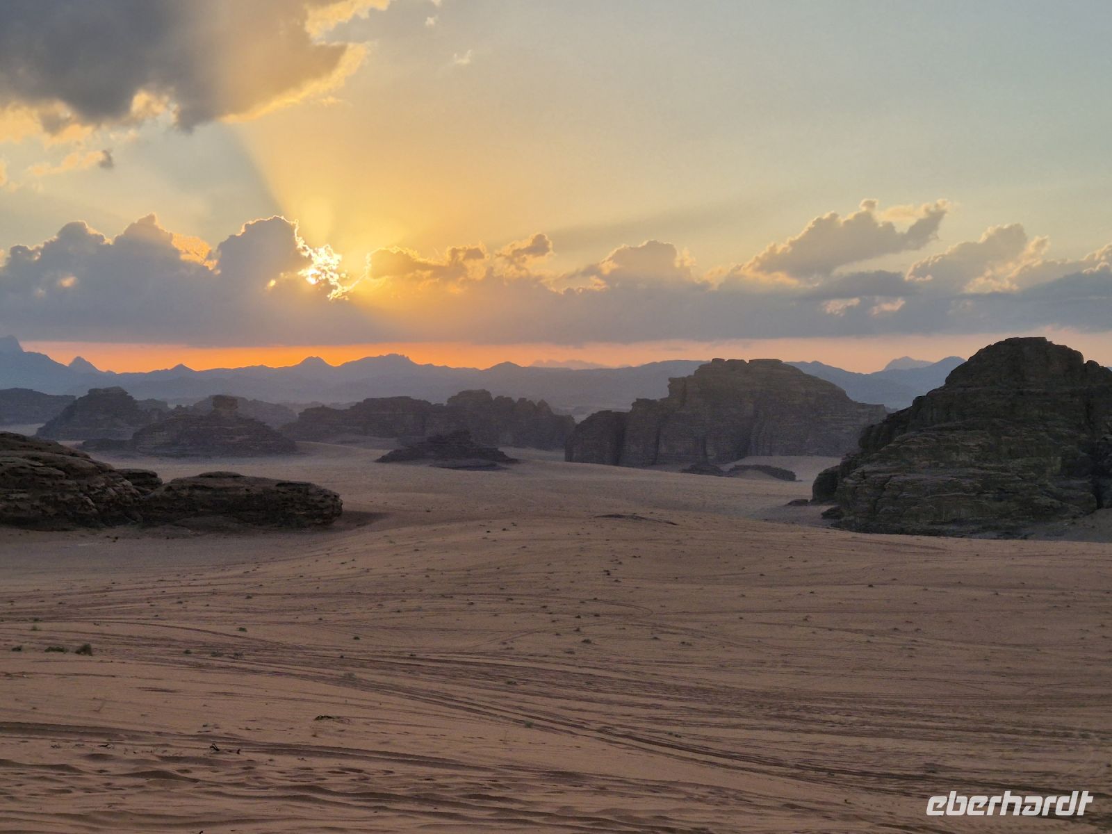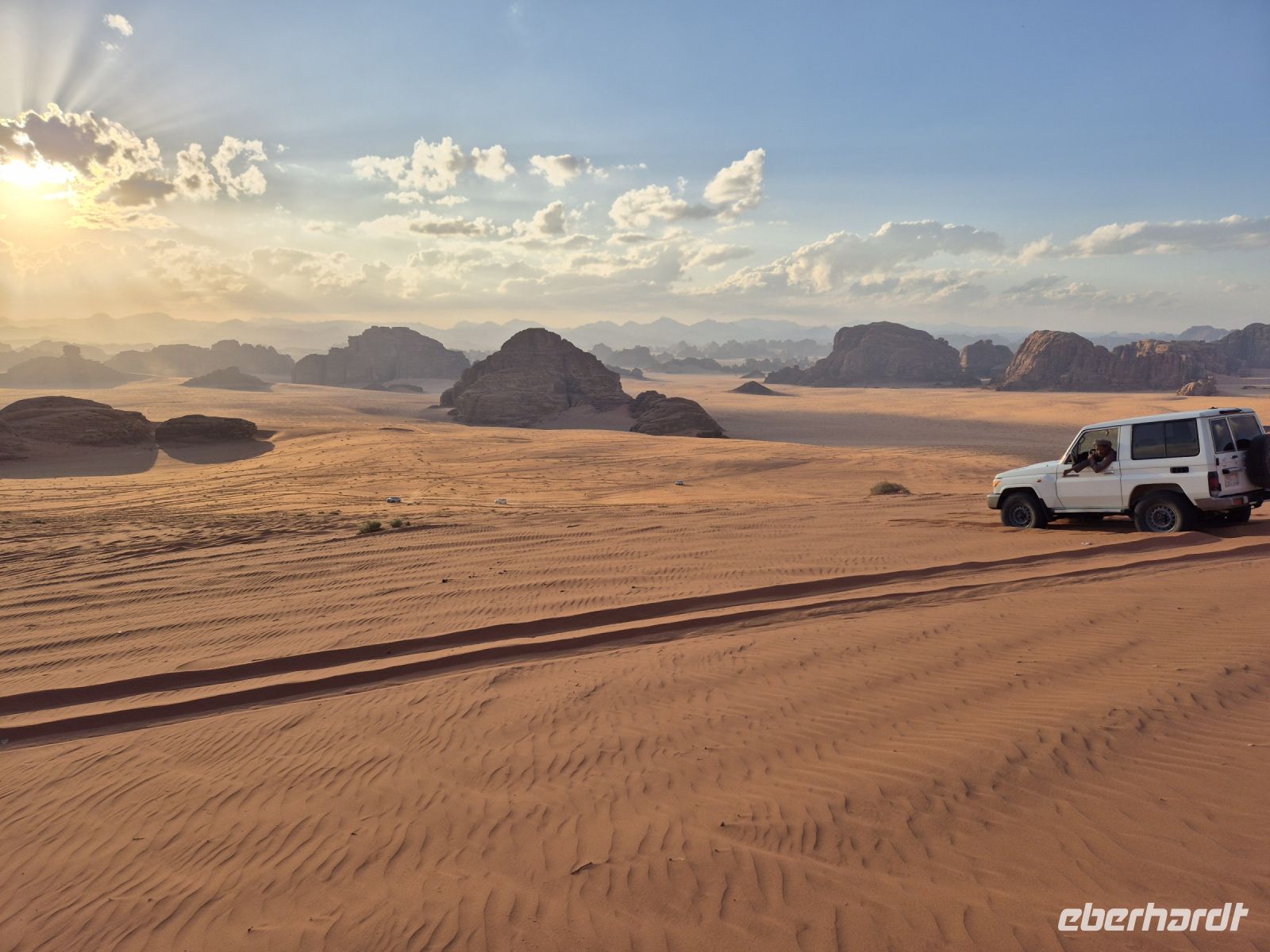 Nach einem Halt bei Kamelen wird es Zeit, einen guten Platz für die Zeit des Sonnenuntergangs zu finden. Unsere Fahrer kennen ein exponierte Stelle in der Wüste mit grandioser Aussicht.