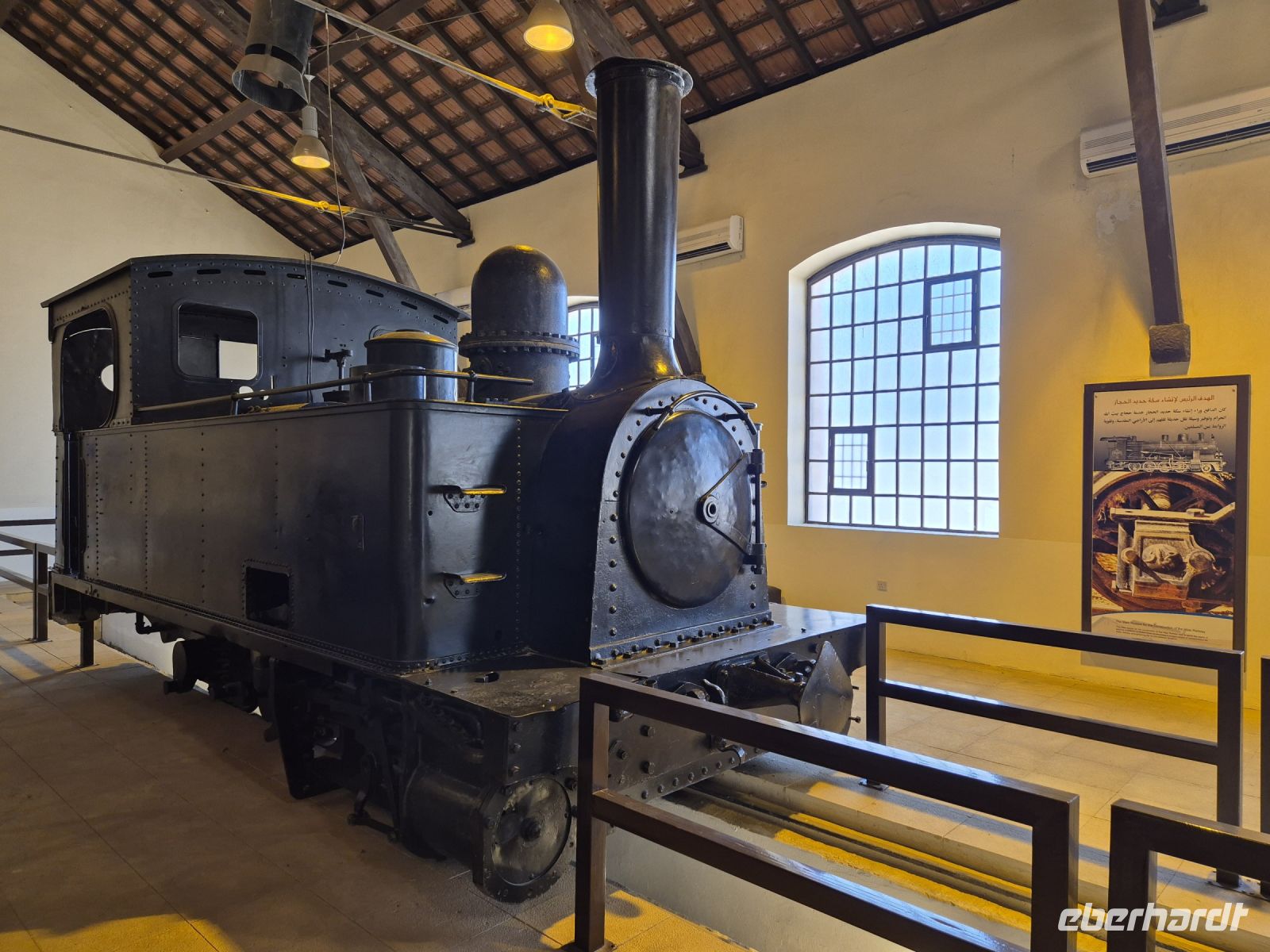 Vor unserem Rückflug nach Riad bleibt noch Zeit für einen außerplanmäßigen Abstecher zum alten Bahnhof der Hedschas-Bahn in Tabuk. Die Bahnstrecke wurde vom Osmanischen Reich in Zusammenarbeit mit dem Deutschen Reich gebaut, um Pilger die Reise von Damaskus nach Medina und Mekka zu erleichtern. Jedoch spielten auch militärische Aspekte eine wichtige Rolle bei diesem Projekt. Es dauerte nur acht Jahre, um die Strecke quer durch die Wüste bis Medina 1908 zu vollenden. Muhammad avanciert in der Museumslokomotive zum Zugführer.