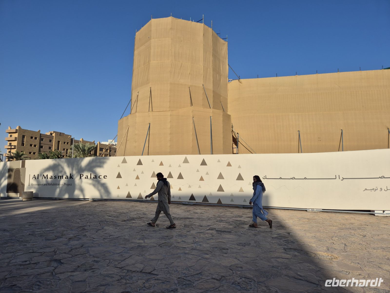 Dann bringt uns Saudia zurück nach Riad. Mit dem „Partybus“ (wegen der Tischgruppenanordnung) geht es noch einmal durch das Stau geplagte Riad. Unser Ziel ist der Stadtteil rund um das Masmak Fort. Dieses können wir nur von außen erahnen, da es wegen Renovierung eingehüllt wurde. Muhammad macht uns mit der Geschichte des Forts näher vertraut. Einen Moment denkt er nicht daran, dass dabei ein Name in diesem Land nicht ausgesprochen werden darf und schon wird er ermahnt.