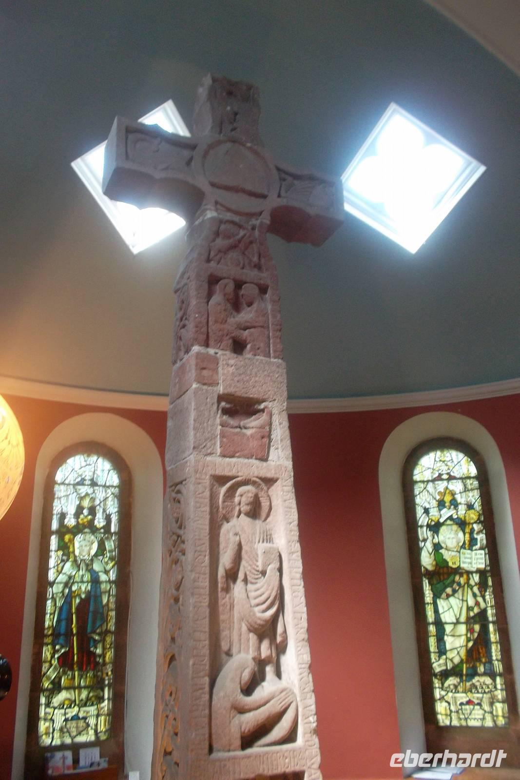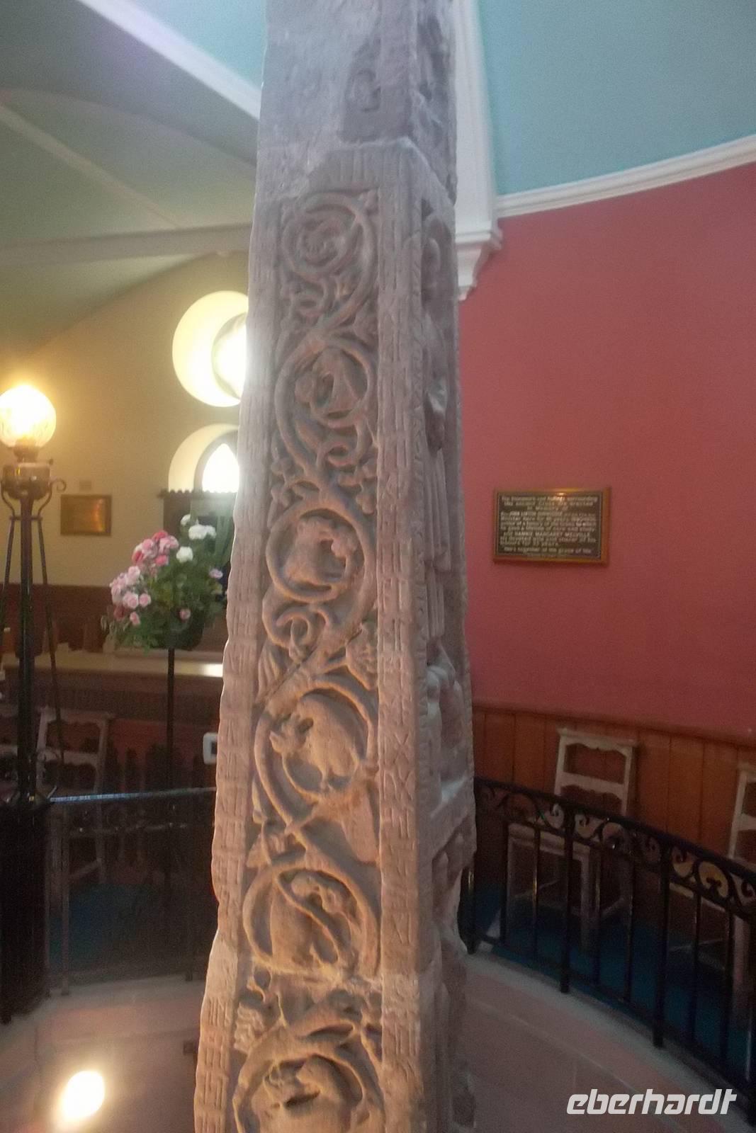 Auf dem Weg zum Tagesziel Dumfries konnten wir wieder ein „Richtig Reisen"-Extra einbauen: Der kleine Ort Ruthwell, abseits von den befahrenen Touristenrouten, beherbergt in seinem Kirchlein einen sehr seltenen und besonderen Schatz. Reichverziert steht das Ruthwell Cross aus dem 7.ahrhundert in der Kirche, mit Ornamentik und biblischen Bilddarstellungen geschmückt. Das ist angelsächsische Kreuz weist darüber hinaus sowohl lateinische als auch Runen-Inschriften auf.