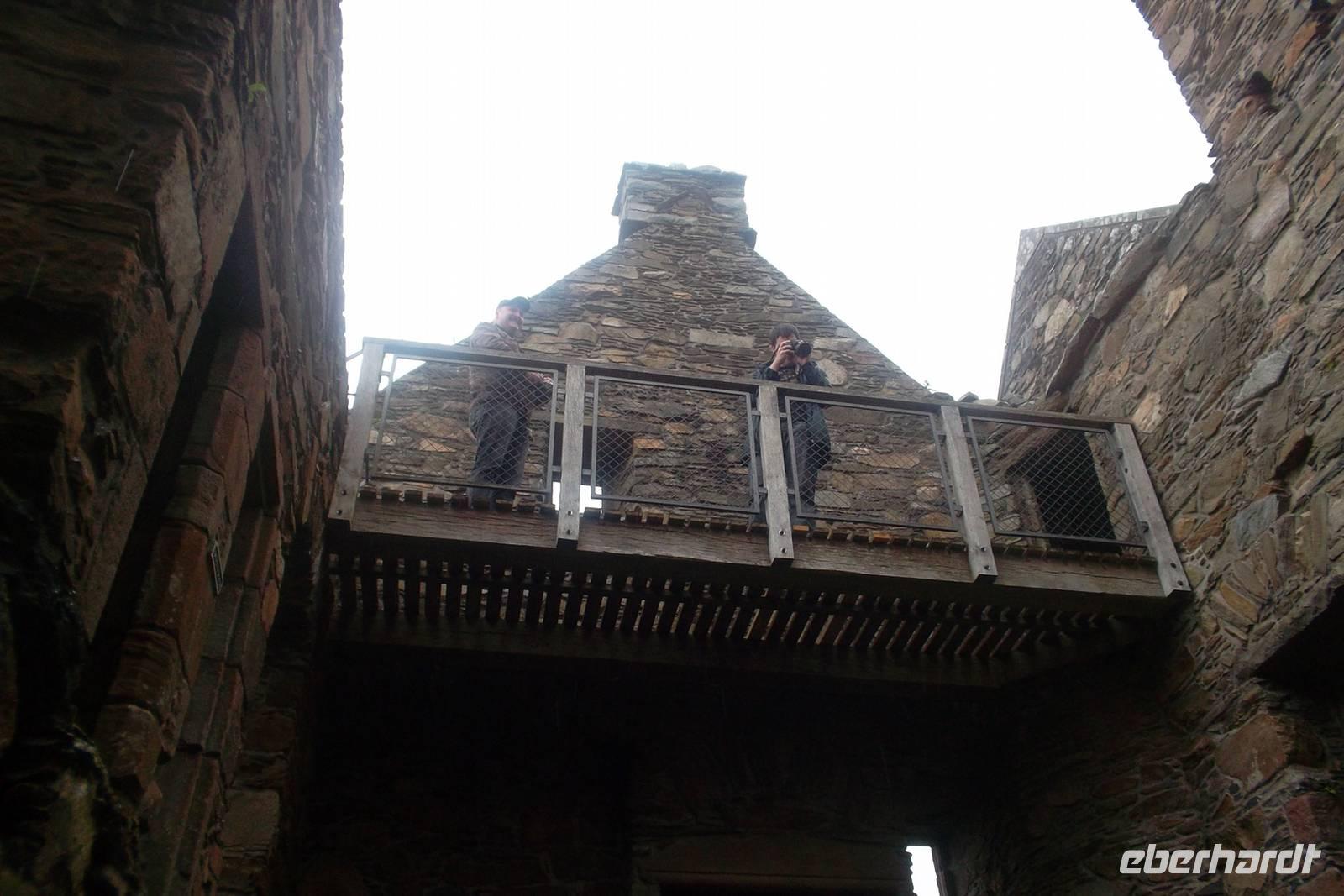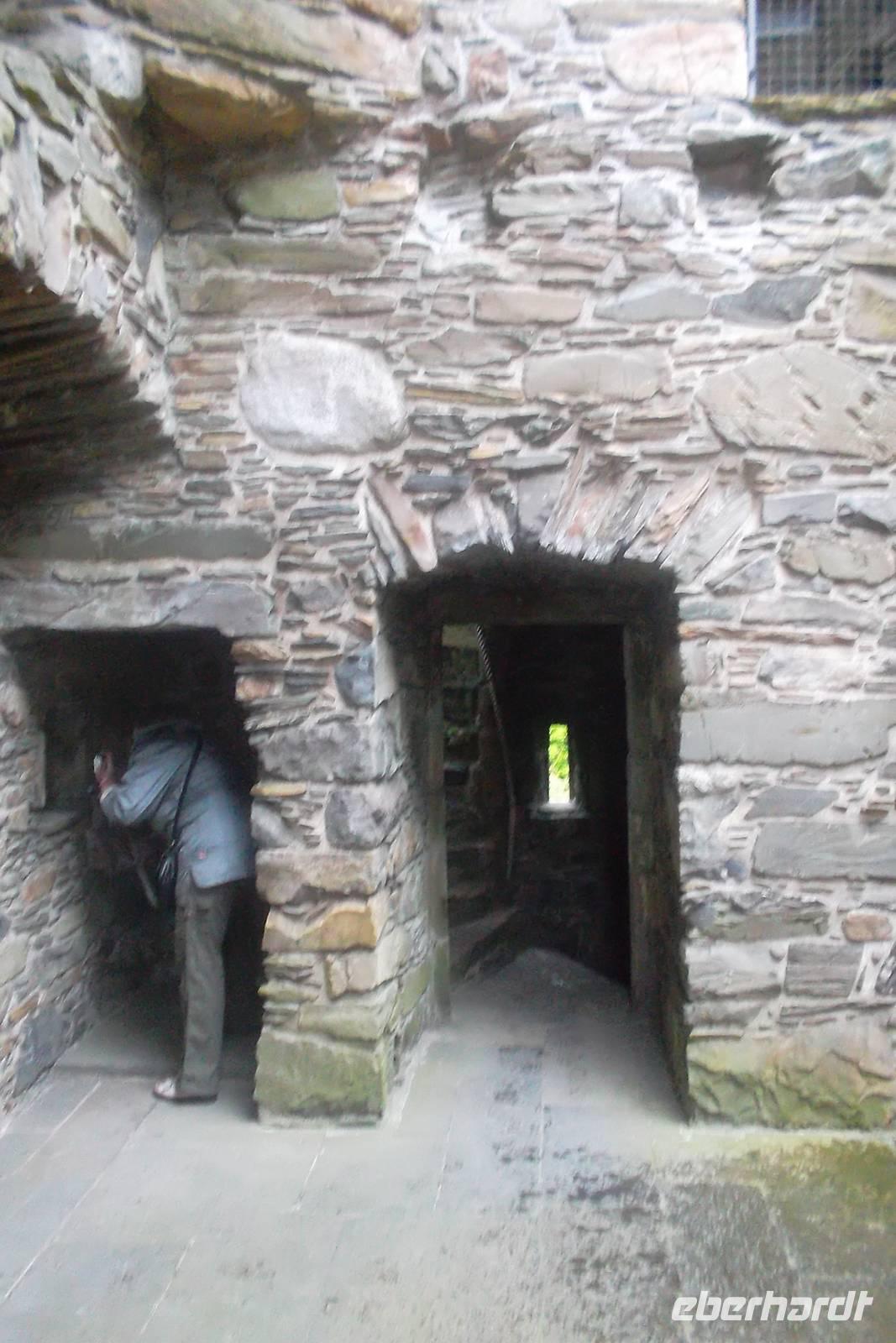 Unser heutiges Ziel war die Insel Arran, gelegen zwischen dem schottischen „Festland" und der Halbinsel Kintyre und mit 440 km² ungefähr so groß wie die deutsche Urlaubsinsel Usedom. Oft nennt man Arran aufgrund seiner landschaftlichen Vielfalt auch „Schottland in Miniatur" - und wirklich findet man hier fast alle Landschaften, für die Schottland ansonsten bekannt ist. bezeichnet. Mit der Morgenfähre der schottischen Fährgesellschaft Caledonian McBrayne fuhren wir von Ardrossan (nördlich von Ayr) auf die Insel Arran und erreichten deren Hauptort Brodick am Vormittag nach etwa 50 Minuten Überfahrt. Arran ist tatsächlich vielfältig und ein wenig davon konnten wir zunächst im Museum of Arran Life erfahren. Dann legten wir einen Stopp am Souvenir-Besucherzentrum ein, wo man in einer Parfümerie und in einer Käserei hinter die Kulissen der jeweiligen Produktionsbetriebe sehen und die beliebten Produkte erwerben kann. Speziell der leckere Arran-Käse entwickelte sich zum „Renner". Weiter unterwegs nach Norden erreichten wir das kleine Dörfchen Corrie, einst ein riesiger Steinbruch, dessen Steine zum Bau zahlreicher Gebäude in Arran, Ayr und sogar Glasgow gedient haben. Derzeit wird Arran zum Ferienzentrum erweitert, was sich in Ansammlungen zahlreicher Ferienhäuser - oft erbaut aus älteren Gebäuden -niederschlägt.. Dann erreichten wir das Fischerdorf Lochranza. Eine malerischen Burgruine, einst Grafschaftssitz der Stewarts, bildete hier die Hauptattraktion und wurde - trotz echt miesen Wetters -von allen fotografiert. Nach Mittagspause mit „Würstchenservice" an Bord und einem Toilettenstopp ging es weiter an der romantischen Küste entlang. Neben mehreren Fotrostopps gab es noch einen Halt im Dorf Blackwaterfoot, auf dem Parkplatz neben dem größten Hotel der Insel. Dann durchquerten wir die Insel komplett und kehrten zurück zum Hauptort Brodick, von wo wir nach etwas Freizeit zum Bummeln - das Wetter war inzwischen trocken! mit der Fähre aufs „Festland" und nach Ayr zurückfuhren. Nach dem Abendessen brachen noch die meisten Mitreisenden unserer Gruppe zu einem interessanten Pub auf, der originellerweise in einer alten Kirche untergebracht und sehr attraktiv und auch preiswert war.