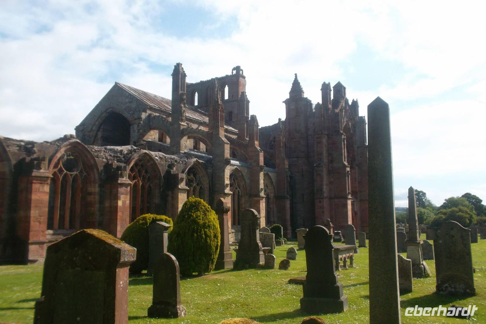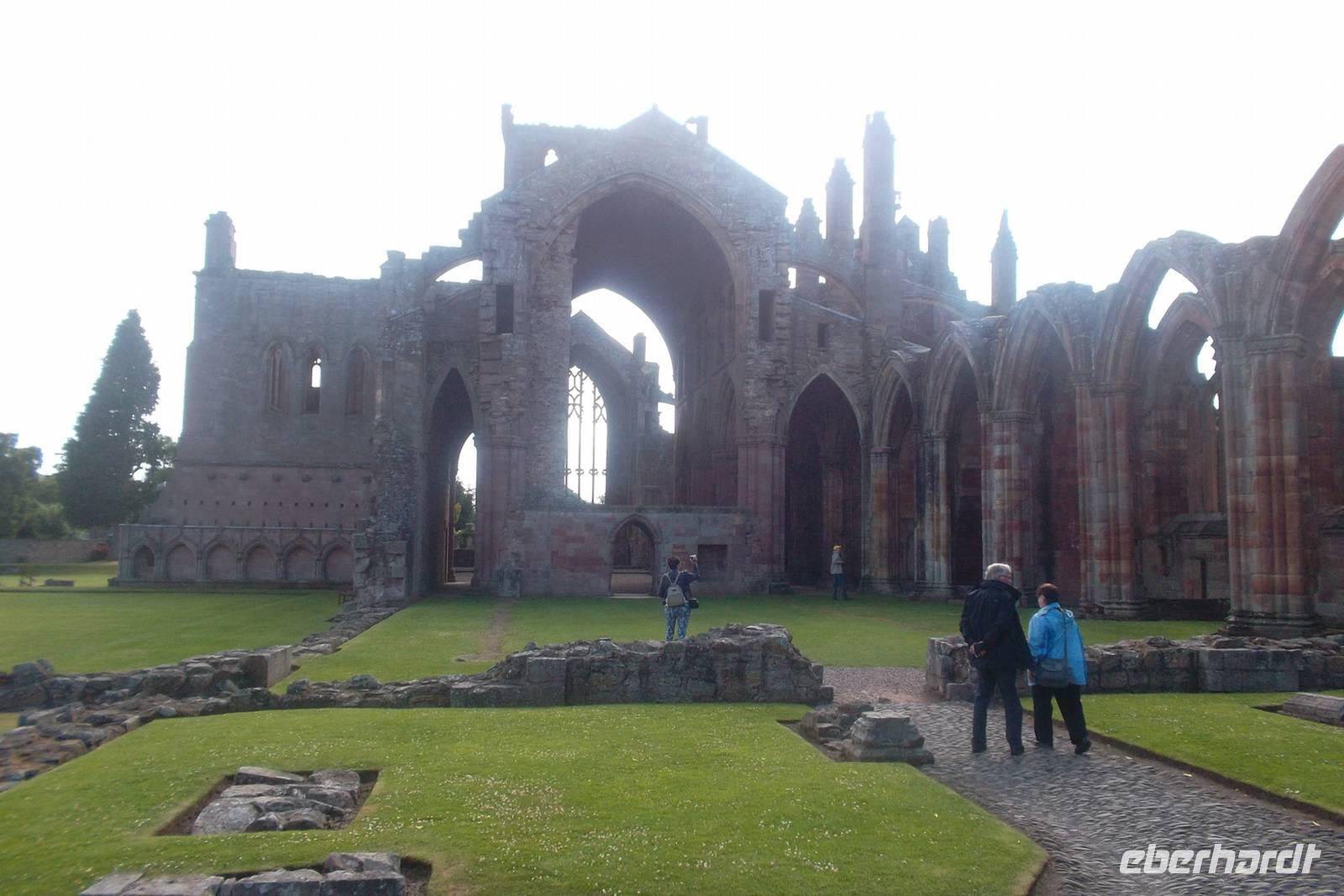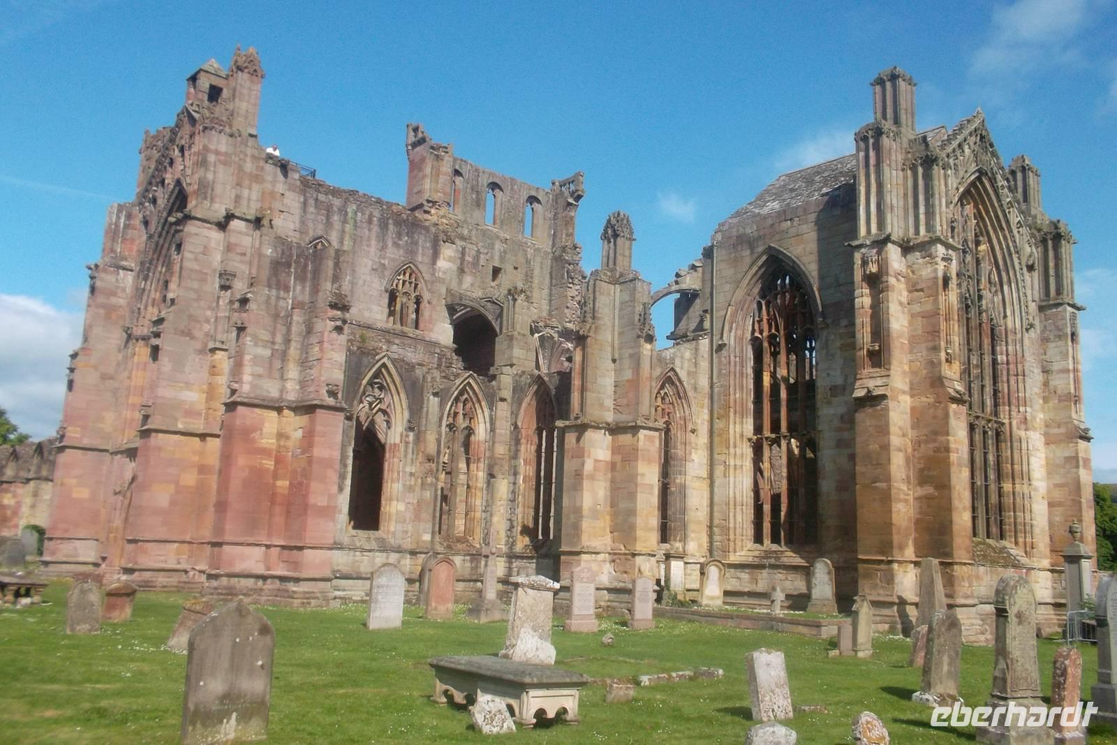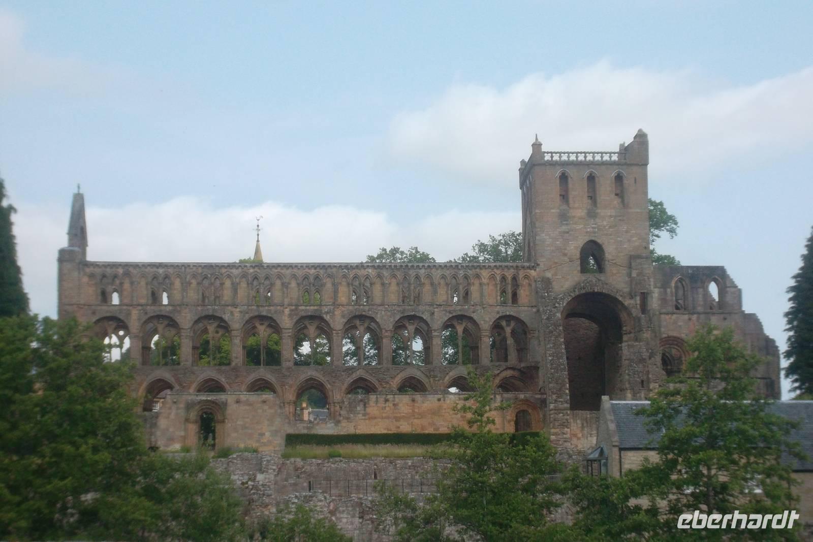 Der heutige Tag sollte noch etwas zum Besichtigen enthalten, uns aber auch zum Hafen nach Newcastle zur Fähre führen, die uns in Richtung Heimat über die Nordsee bringen würde. Wir nahmen unseren Weg durch die schottischen „Borders" eine interessante hügelige Landschaft, deren kulturelle Höhepunkte unter anderem mehrere alte Abteien aus dem 12. Jahrhundert bilden. Heute sind sie als überaus malerische Ruinen erhalten, befinden sich auf einer Art historischen Abteienroute die zu den Lieblingsorten des bekannten schottischen Schriftstellers Sir Walther Scott gehört hatte. Deshalb und weil sowohl viele seiner Romane hier spielen und sein hier befindliches Wohnhaus Abbotsfort von ihm zum Adelssitz umgebaut worden war, nennt man die Region auch im Volksmund und in der Tourismuswerbung Scotts County". Noch ein anderer war von dieser Gegend begeistert,:der deutsche Dichter Theodor Fontane. Besonders Dryburgh und Melsose hatten es ihm angetan, und für letztere hatte er empfohlen: „... und willst Du des Zaubers sicher sein, dann besuche Melrose im Mondenschein". Wir hatten in der beeindruckenden Abtei jedenfalls Glück mit dem Wetter und konnten zahlreiche Fotos machen. Dann fuhren wir weiter nach Jedburgh. Ein kurzer Besuch in der hiesigen Wollmühle brachte noch Gelegenheit für ein letztes „Schottland-Souvenir-Shopping", da hier eine besonders große Auswahl an Whiskies, Kalendern Gebäck etc. das Ausgeben der letzten „Pfunde" erleichtert. Höhepunkt jeden Aufenthaltes in Jedburgh ist aber die gewaltige Abteiruine. Wuchtig und trotz ihres Zustandes als Ruine stolz und vornehm steht sie über dem Fluß. Wir hatten auch hier genug Gelegenheit für Fotos und einen interessanten Rundgang und sogar noch für etwas Freizeit in der Jedburgher Altstadt mit altem Gefängnis, historischem Marktkreuz und einem Haus, dem der Besuch der berühmten Schottenkönigin Maria Stuart zugeschrieben wird.