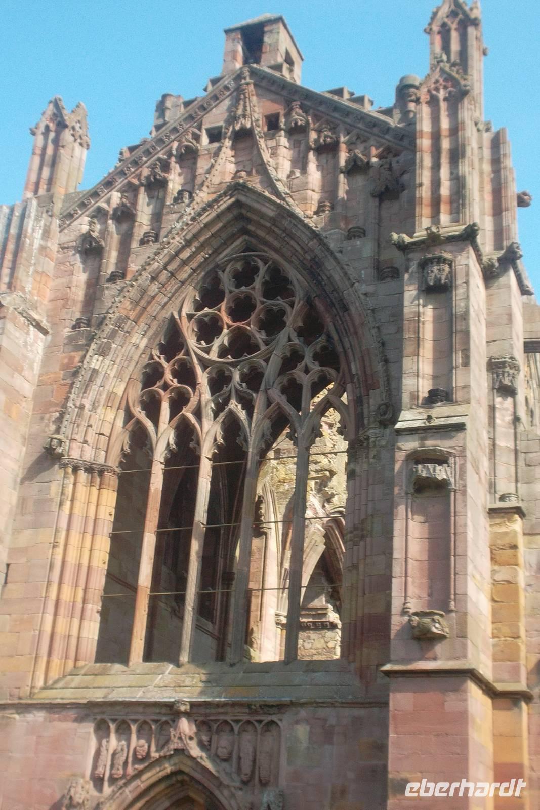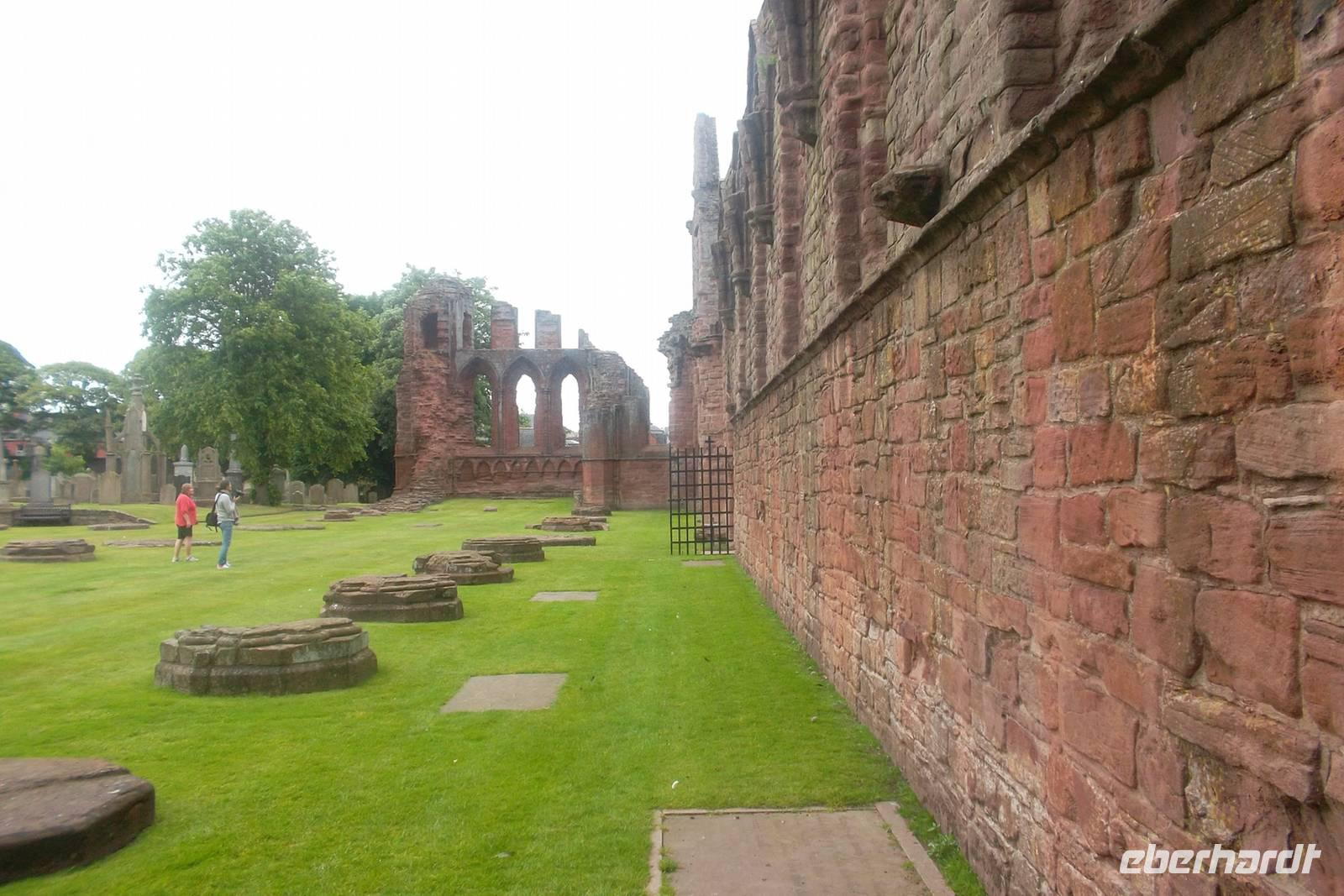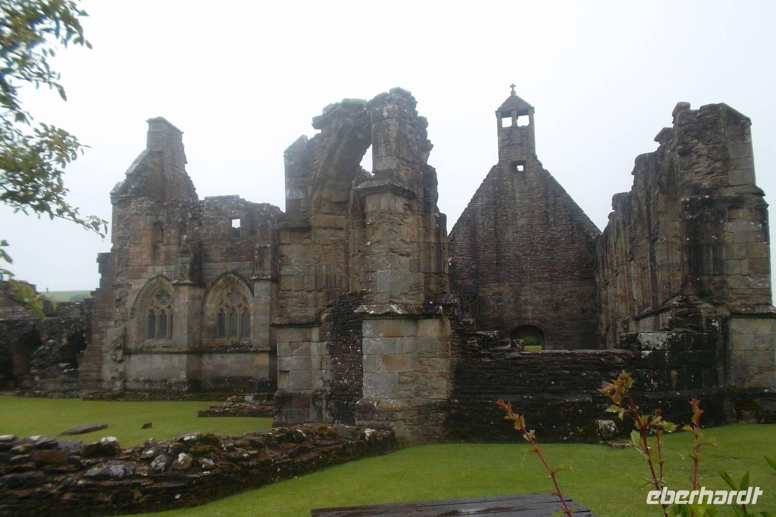 Der heutige Tag sollte noch etwas zum Besichtigen enthalten, uns aber auch zum Hafen nach Newcastle zur Fähre führen, die uns in Richtung Heimat über die Nordsee bringen würde. Wir nahmen unseren Weg durch die schottischen „Borders" eine interessante hügelige Landschaft, deren kulturelle Höhepunkte unter anderem mehrere alte Abteien aus dem 12. Jahrhundert bilden. Heute sind sie als überaus malerische Ruinen erhalten, befinden sich auf einer Art historischen Abteienroute die zu den Lieblingsorten des bekannten schottischen Schriftstellers Sir Walther Scott gehört hatte. Deshalb und weil sowohl viele seiner Romane hier spielen und sein hier befindliches Wohnhaus Abbotsfort von ihm zum Adelssitz umgebaut worden war, nennt man die Region auch im Volksmund und in der Tourismuswerbung Scotts County". Noch ein anderer war von dieser Gegend begeistert,:der deutsche Dichter Theodor Fontane. Besonders Dryburgh und Melsose hatten es ihm angetan, und für letztere hatte er empfohlen: „... und willst Du des Zaubers sicher sein, dann besuche Melrose im Mondenschein". Wir hatten in der beeindruckenden Abtei jedenfalls Glück mit dem Wetter und konnten zahlreiche Fotos machen. Dann fuhren wir weiter nach Jedburgh. Ein kurzer Besuch in der hiesigen Wollmühle brachte noch Gelegenheit für ein letztes „Schottland-Souvenir-Shopping", da hier eine besonders große Auswahl an Whiskies, Kalendern Gebäck etc. das Ausgeben der letzten „Pfunde" erleichtert. Höhepunkt jeden Aufenthaltes in Jedburgh ist aber die gewaltige Abteiruine. Wuchtig und trotz ihres Zustandes als Ruine stolz und vornehm steht sie über dem Fluß. Wir hatten auch hier genug Gelegenheit für Fotos und einen interessanten Rundgang und sogar noch für etwas Freizeit in der Jedburgher Altstadt mit altem Gefängnis, historischem Marktkreuz und einem Haus, dem der Besuch der berühmten Schottenkönigin Maria Stuart zugeschrieben wird.