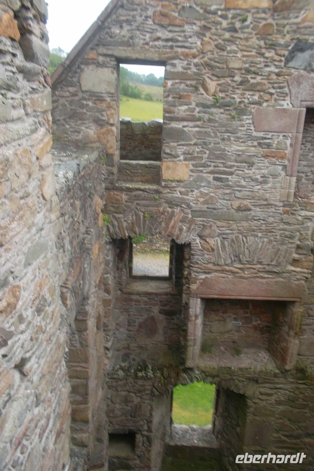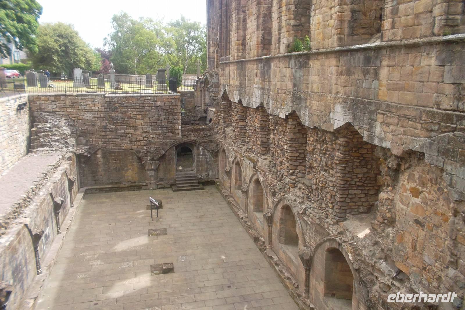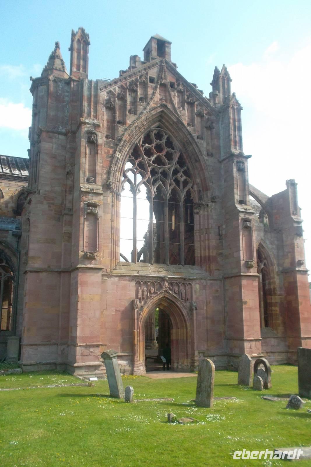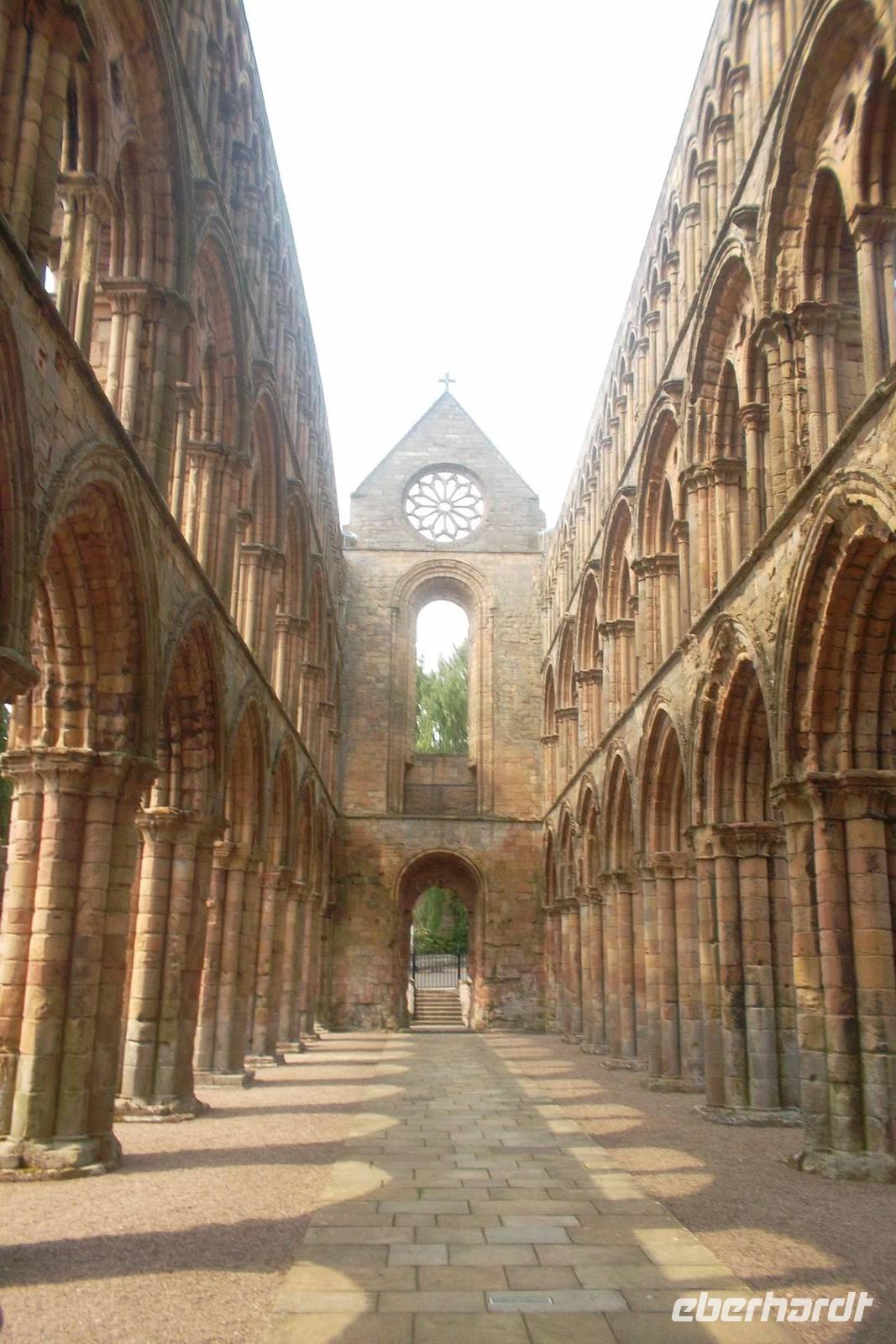 Der heutige Tag sollte noch etwas zum Besichtigen enthalten, uns aber auch zum Hafen nach Newcastle zur Fähre führen, die uns in Richtung Heimat über die Nordsee bringen würde. Wir nahmen unseren Weg durch die schottischen „Borders" eine interessante hügelige Landschaft, deren kulturelle Höhepunkte unter anderem mehrere alte Abteien aus dem 12. Jahrhundert bilden. Heute sind sie als überaus malerische Ruinen erhalten, befinden sich auf einer Art historischen Abteienroute die zu den Lieblingsorten des bekannten schottischen Schriftstellers Sir Walther Scott gehört hatte. Deshalb und weil sowohl viele seiner Romane hier spielen und sein hier befindliches Wohnhaus Abbotsfort von ihm zum Adelssitz umgebaut worden war, nennt man die Region auch im Volksmund und in der Tourismuswerbung Scotts County". Noch ein anderer war von dieser Gegend begeistert,:der deutsche Dichter Theodor Fontane. Besonders Dryburgh und Melsose hatten es ihm angetan, und für letztere hatte er empfohlen: „... und willst Du des Zaubers sicher sein, dann besuche Melrose im Mondenschein". Wir hatten in der beeindruckenden Abtei jedenfalls Glück mit dem Wetter und konnten zahlreiche Fotos machen. Dann fuhren wir weiter nach Jedburgh. Ein kurzer Besuch in der hiesigen Wollmühle brachte noch Gelegenheit für ein letztes „Schottland-Souvenir-Shopping", da hier eine besonders große Auswahl an Whiskies, Kalendern Gebäck etc. das Ausgeben der letzten „Pfunde" erleichtert. Höhepunkt jeden Aufenthaltes in Jedburgh ist aber die gewaltige Abteiruine. Wuchtig und trotz ihres Zustandes als Ruine stolz und vornehm steht sie über dem Fluß. Wir hatten auch hier genug Gelegenheit für Fotos und einen interessanten Rundgang und sogar noch für etwas Freizeit in der Jedburgher Altstadt mit altem Gefängnis, historischem Marktkreuz und einem Haus, dem der Besuch der berühmten Schottenkönigin Maria Stuart zugeschrieben wird.