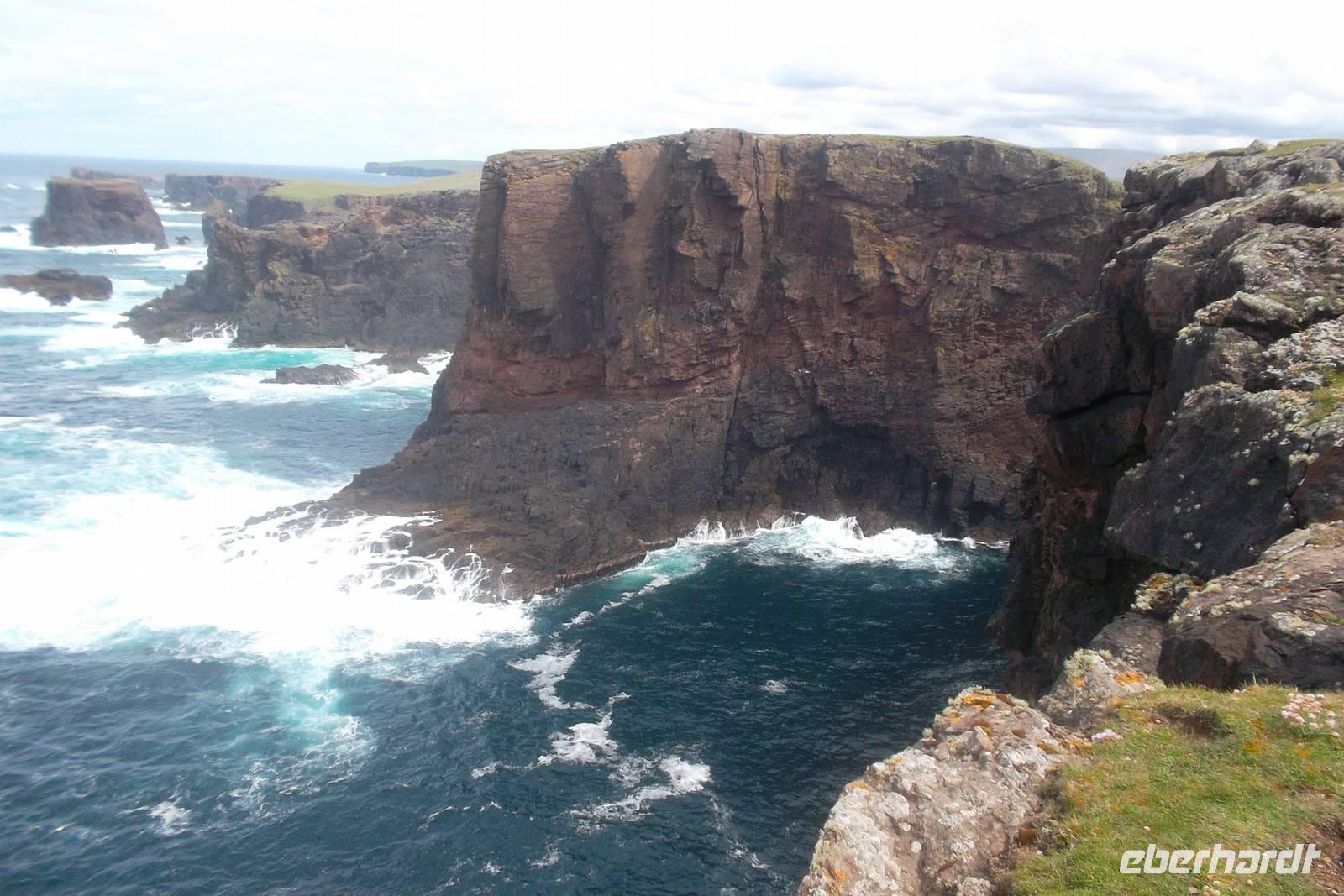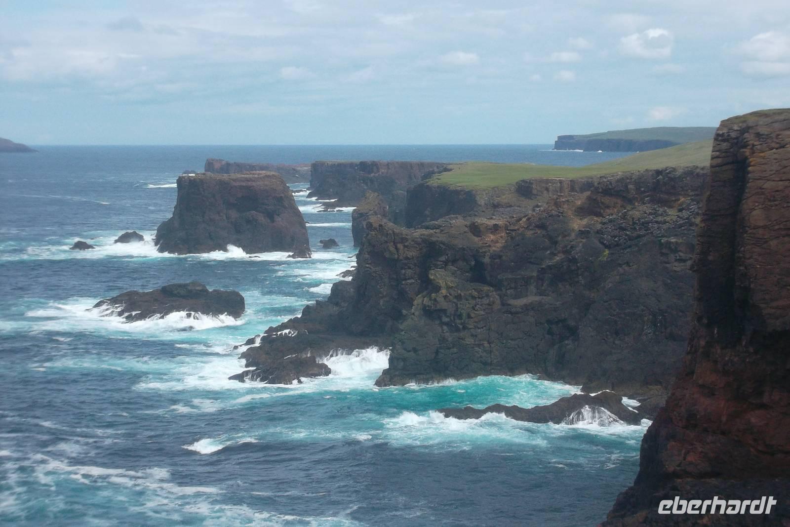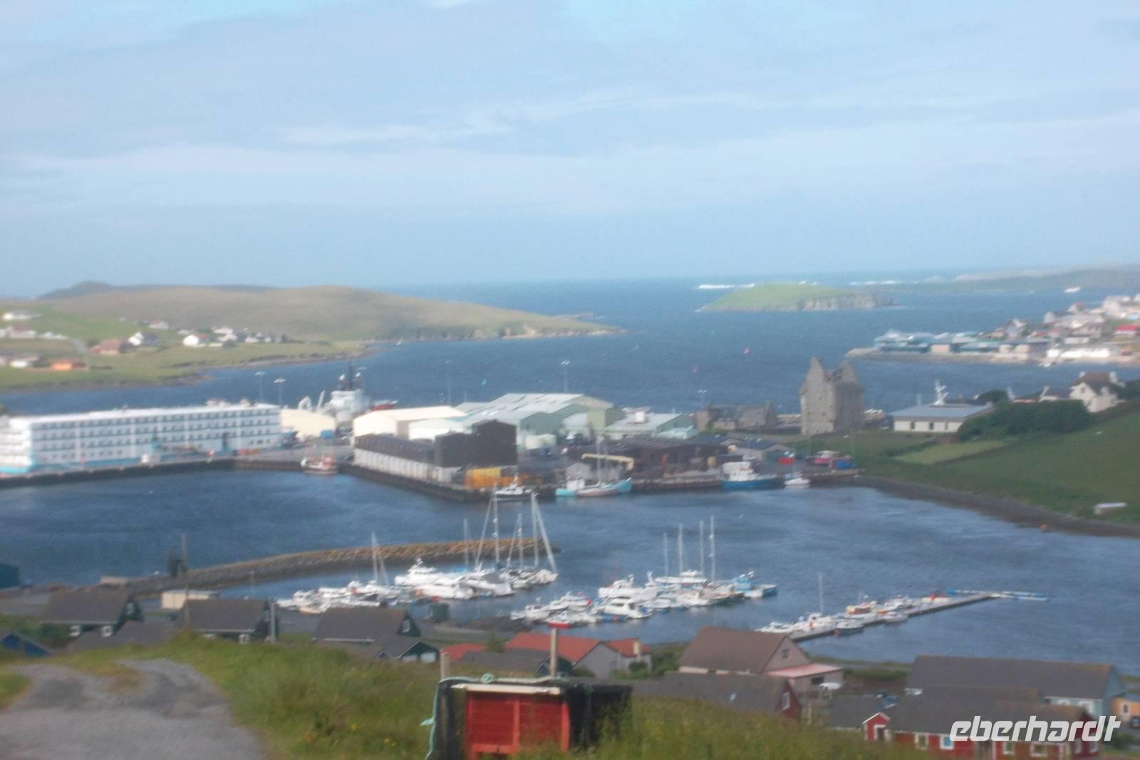 North Mainland endet an der Halbinsel Eshaness, die sich in grandiosen Küstenlandschaften und Felsenszenarien verliert. Tosende weißlich-azurblaue Brandung stürzt sich auf die zerklüfteten roten Vulkanfelsen am Eshaness Head, die etwa 60 m über den Atlantik hinausragen und von einem 1929 von der berühmten Familie Stephenson erbauten Leuchtturm gekrönt sind. Unzählige Fotos haben wir von der mitreißenden Komposition aus zerklüfteten Uferfelsen gemacht, bevor wir bei Stenness noch einen Fotostopp am durchbrochenen Felsen der Insel Dore Holm einlegten. Die Gestalt eines trinkenden Pferdes soll die rote Insel darstellen, die von einem durch die Naturgewalten des Meeres geschaffenen natürlichen Bogen - oder Felsendurchbruch - beherrscht wird. Nach einem Stopp am kleinen Fährhafen von Toft, wo die reguläre Fähre als Verbindung nach Ulsta auf der Shetland-Insel Yell ablegt, kehrten wir nach Lerwick zurück. Hier hatten wir noch Gelegenheit zu ausgiebigem Spaziergang und Bummel durch die Inselhauptstadt, zum Beispiel durch das wehrhafte Artilleriefort Charlotte, das aus dem 17. Jahrhundert stammt, oder durch die Geschäfte der Fußgängerzone.