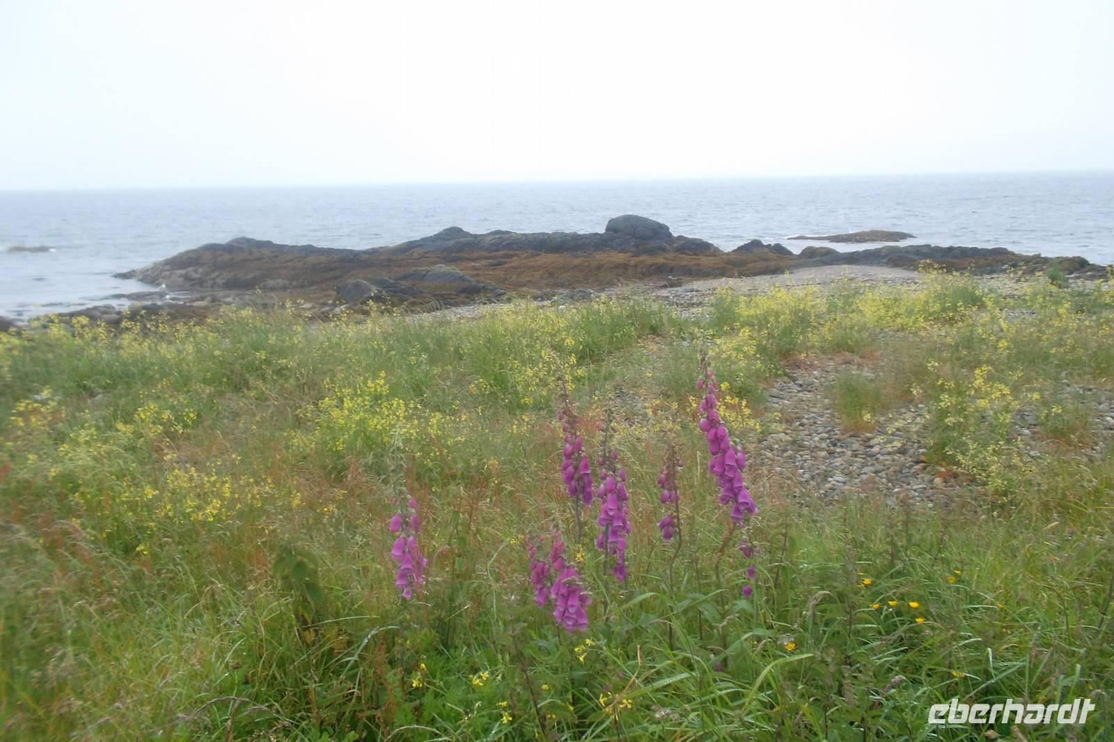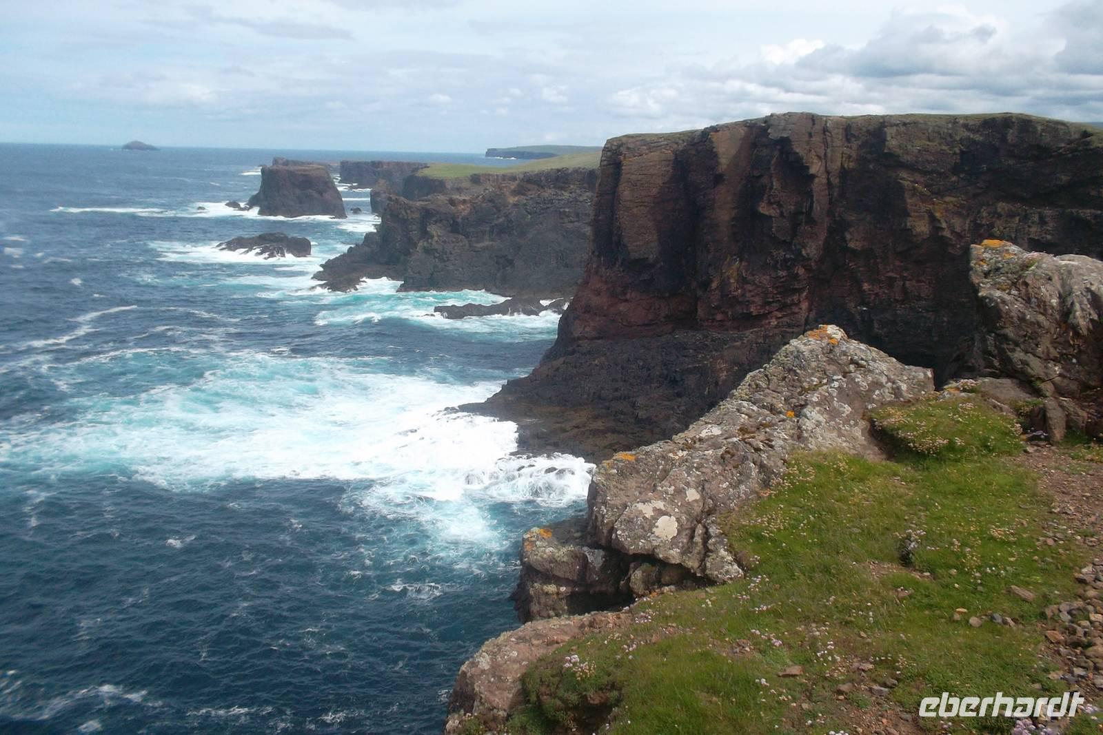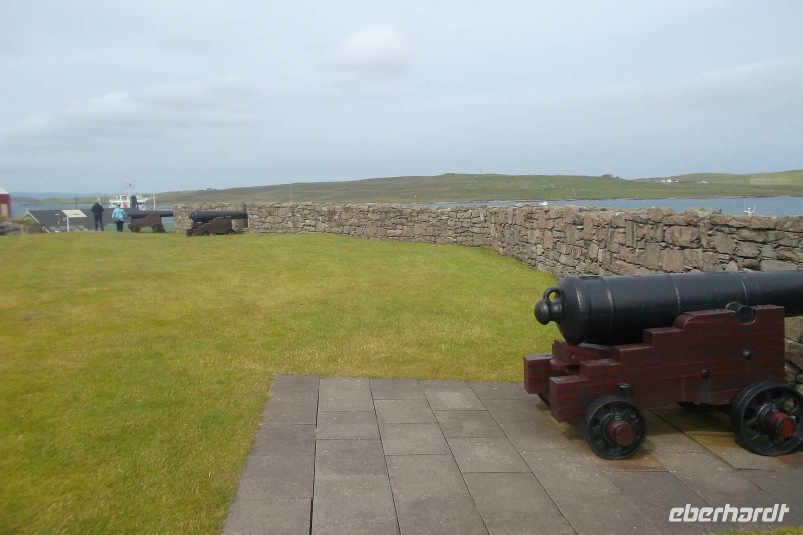 North Mainland endet an der Halbinsel Eshaness, die sich in grandiosen Küstenlandschaften und Felsenszenarien verliert. Tosende weißlich-azurblaue Brandung stürzt sich auf die zerklüfteten roten Vulkanfelsen am Eshaness Head, die etwa 60 m über den Atlantik hinausragen und von einem 1929 von der berühmten Familie Stephenson erbauten Leuchtturm gekrönt sind. Unzählige Fotos haben wir von der mitreißenden Komposition aus zerklüfteten Uferfelsen gemacht, bevor wir bei Stenness noch einen Fotostopp am durchbrochenen Felsen der Insel Dore Holm einlegten. Die Gestalt eines trinkenden Pferdes soll die rote Insel darstellen, die von einem durch die Naturgewalten des Meeres geschaffenen natürlichen Bogen - oder Felsendurchbruch - beherrscht wird. Nach einem Stopp am kleinen Fährhafen von Toft, wo die reguläre Fähre als Verbindung nach Ulsta auf der Shetland-Insel Yell ablegt, kehrten wir nach Lerwick zurück. Hier hatten wir noch Gelegenheit zu ausgiebigem Spaziergang und Bummel durch die Inselhauptstadt, zum Beispiel durch das wehrhafte Artilleriefort Charlotte, das aus dem 17. Jahrhundert stammt, oder durch die Geschäfte der Fußgängerzone.