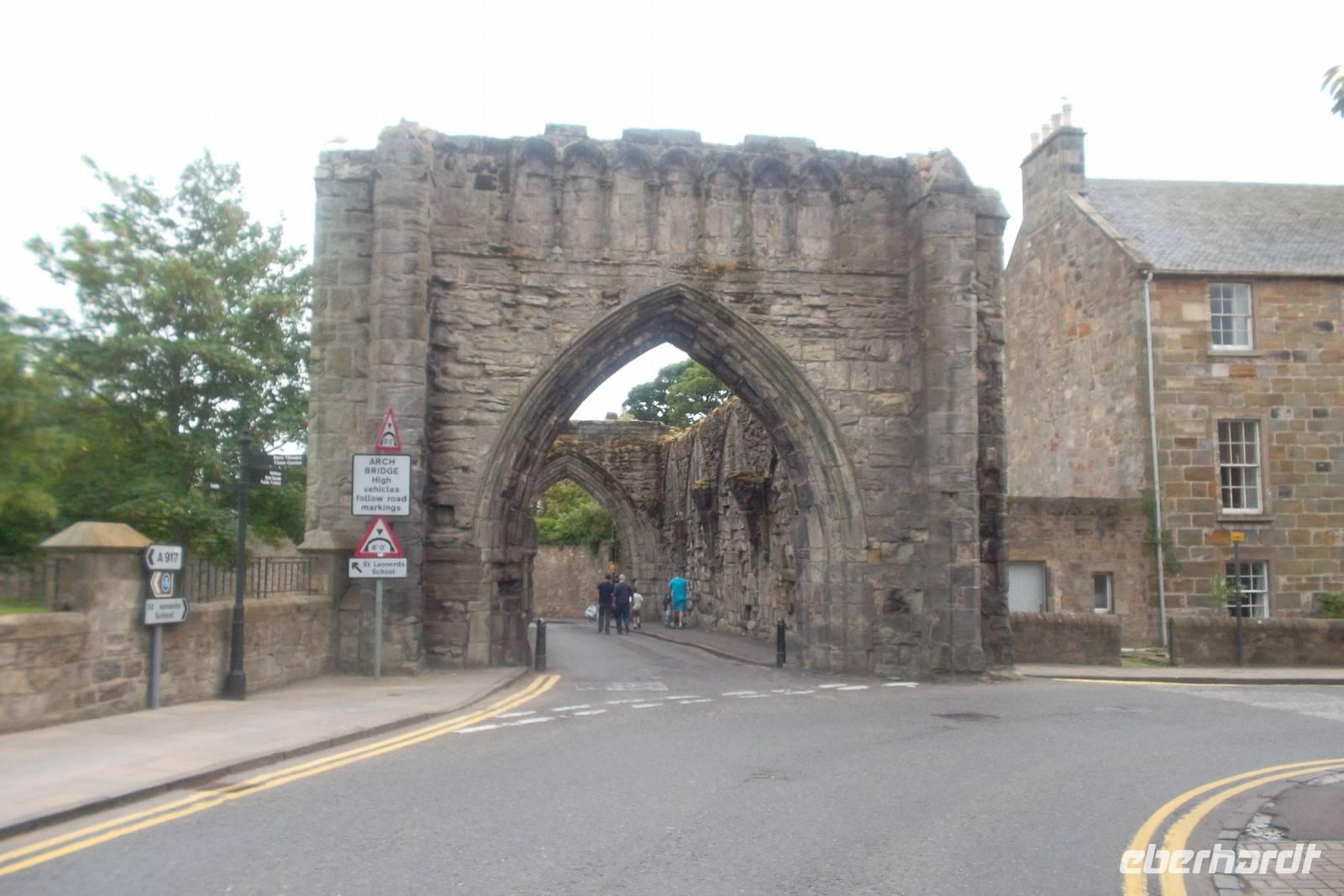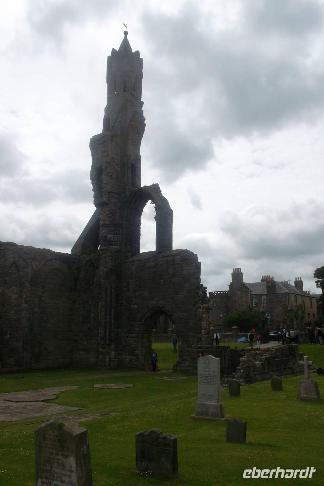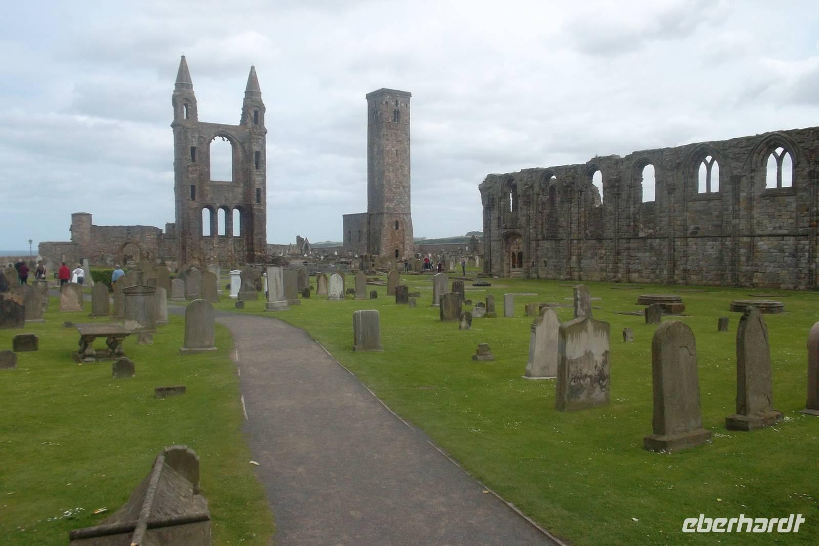 Danach besuchten wir St. Andrews, die traditionellste und historisch bedeutsamste der schottischen Universitätsstädte und gleichzeitig eine Hochburg des Golf. Zwar wurde er nicht unbedingt hier erfunden, wie viele behaupten, aber er wurde hier wiederentdeckt und trat von St. Andrews seinen Siegeszug durch die ganze Welt an. Aber dieser Sport hatte auf unsere Reise wenig Einfluss, denn uns ging es darum, vor allem die bedeutende Kathedrale zu sehen. Eindrucksvoll liegt ihre Ruine am Meer und direkt daneben ragt der begehbare Turm der St. Regulus-Kirche auf -als Rest eines Sakralbaues, in dem ursprünglich die Gebeine des Heiligen Andreas, des schottischen Nationalheiligen, aufbewahrt wurden.