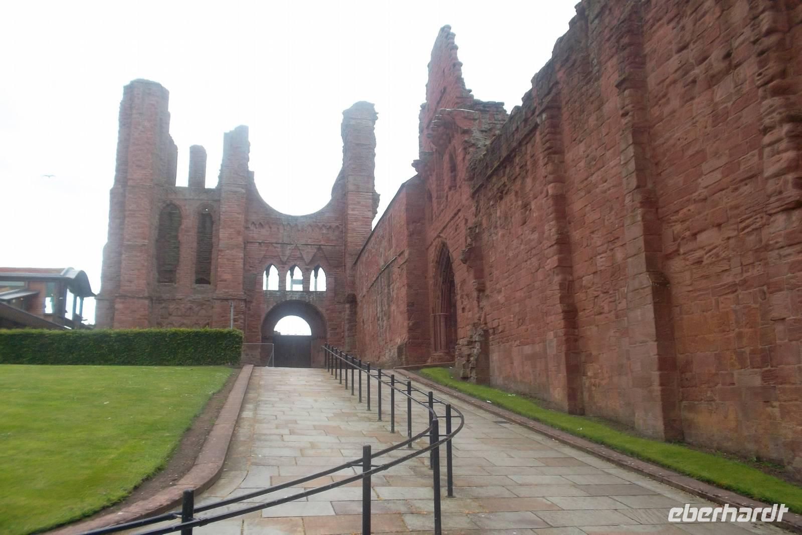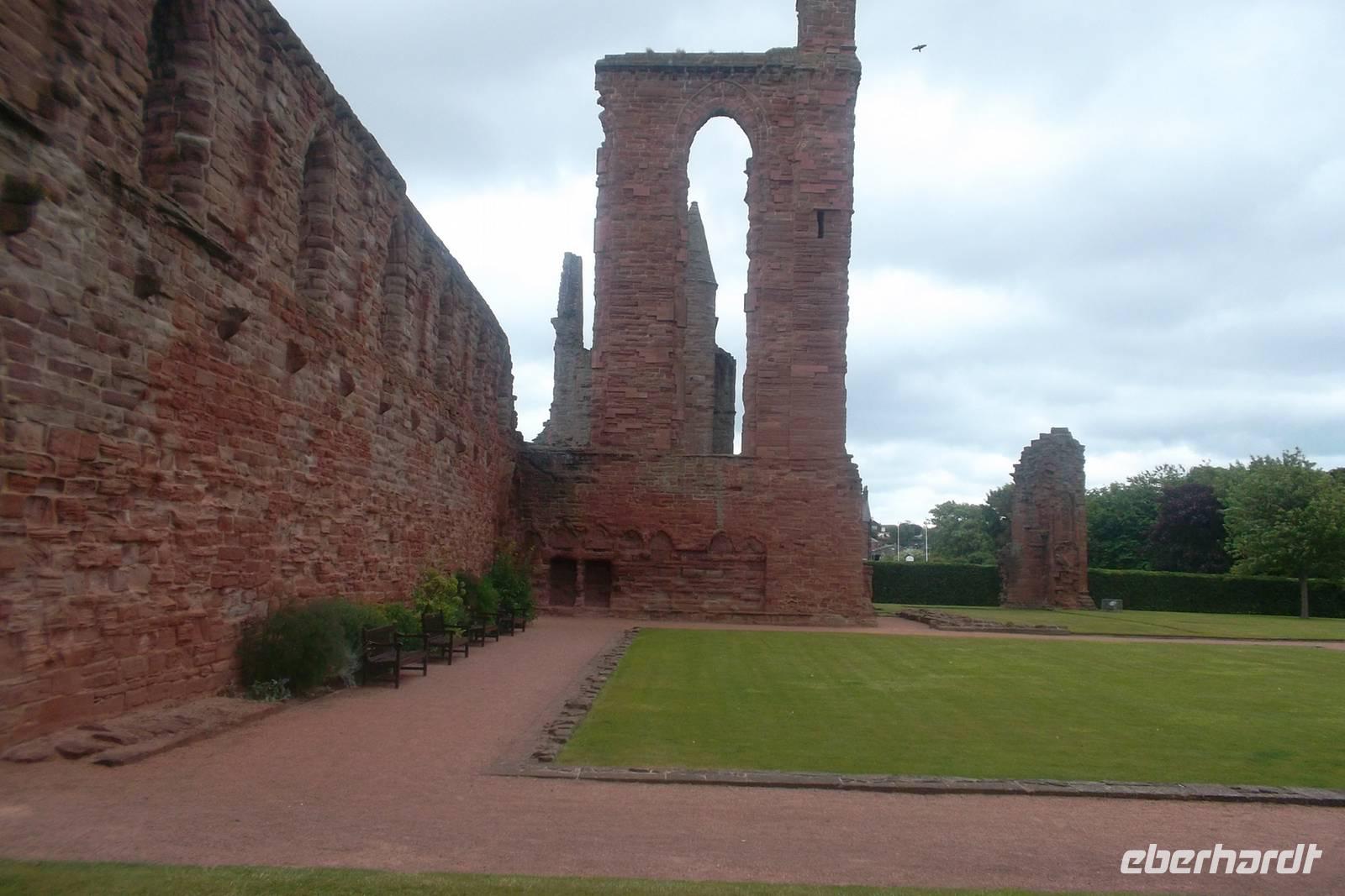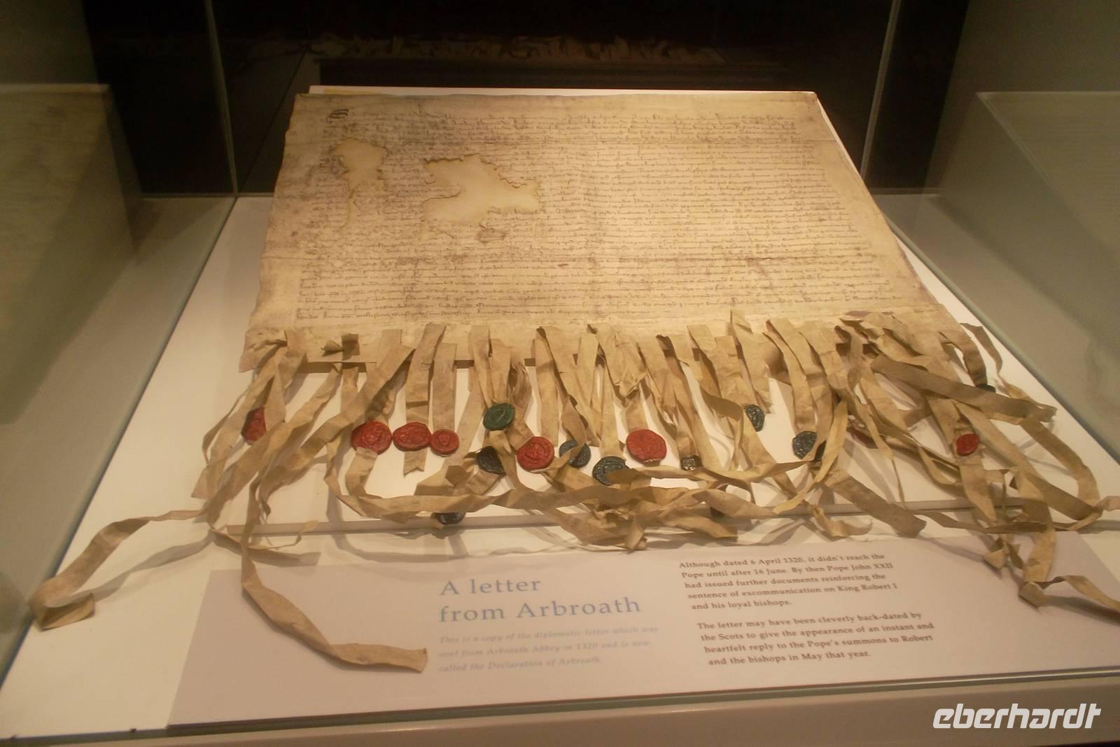 Das nächste Ziel war Arbroath. Die „rote Stadt" - wegen ihrer Sandsteinbauten so genannt - birgt als Kleinod die Abtei von Arbroath. Im 11. Jahrhundert vom schottischen König gegründet und mit Tironenser-Mönchen aus Kelso besetzt, sind die Ruinen der Abtei noch heute ein überaus inspirierendes Kulturdenkmal. Abgesehen von den Aspekten als fotogene Ruine beherbergt das ehemalige Kloster auch die Ausstellung der „the declaration of Scottish Independence". Dieses unschätzbare Dokument wurde 1320 hier im Kloster ausgefertigt und an den damals in Avignon im Exil lebenden Papst geschickt, der daraufhin 1329 als unantastbare Autorität Schottlands Unabhängigkeit anerkannte, die der schottische König Robert I. (Robert the Bruce) mit dem Sieg in der Schlacht von Bannockburn 1314 erkämpft hatte.