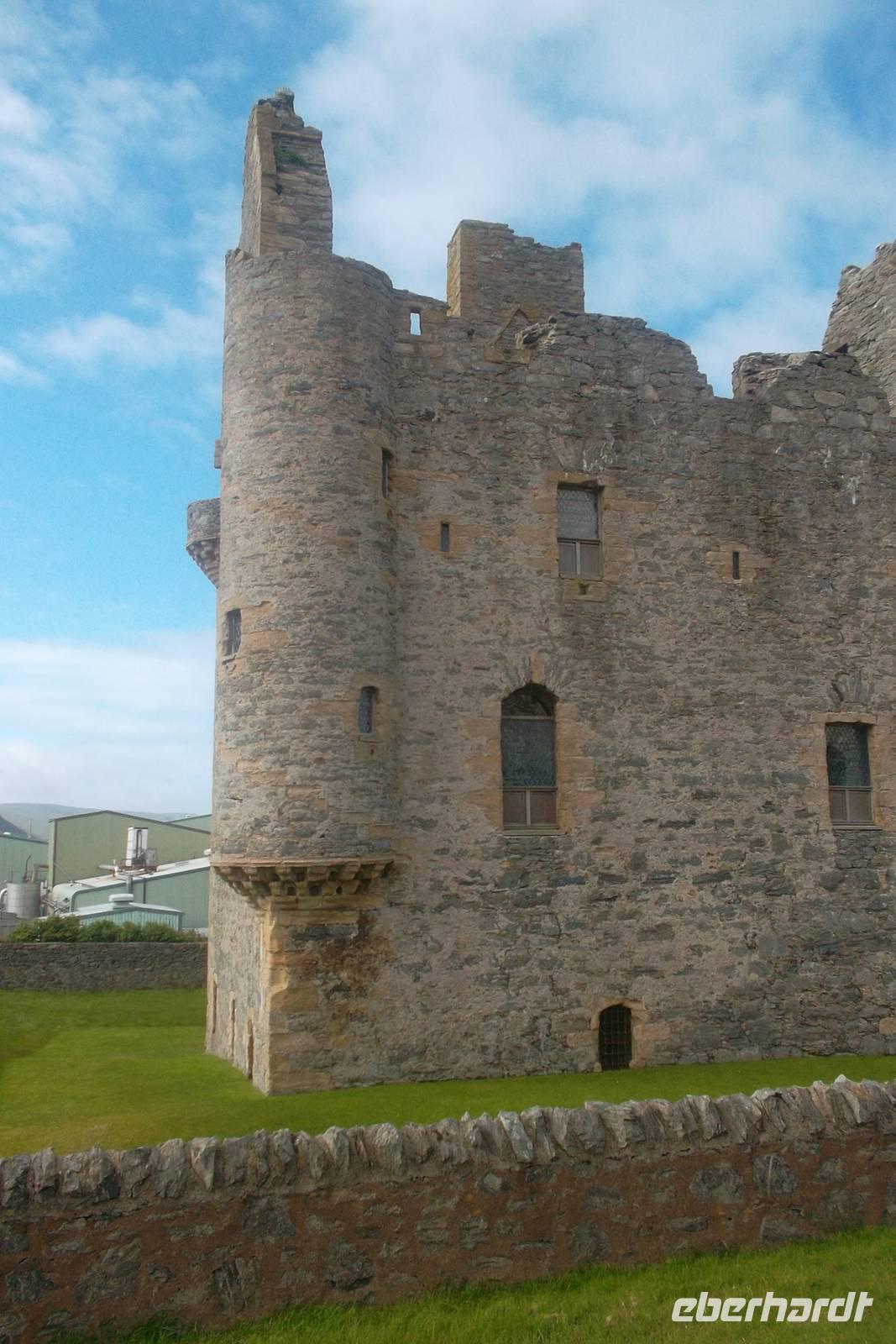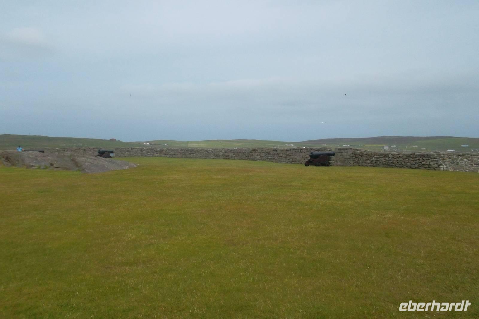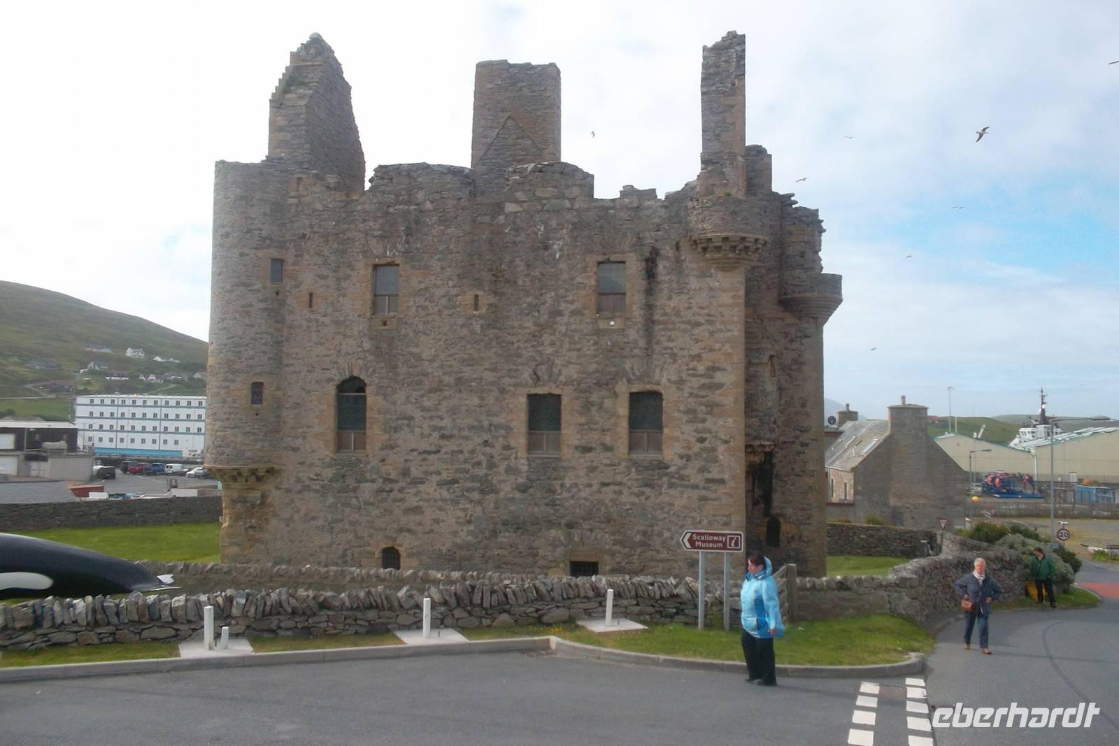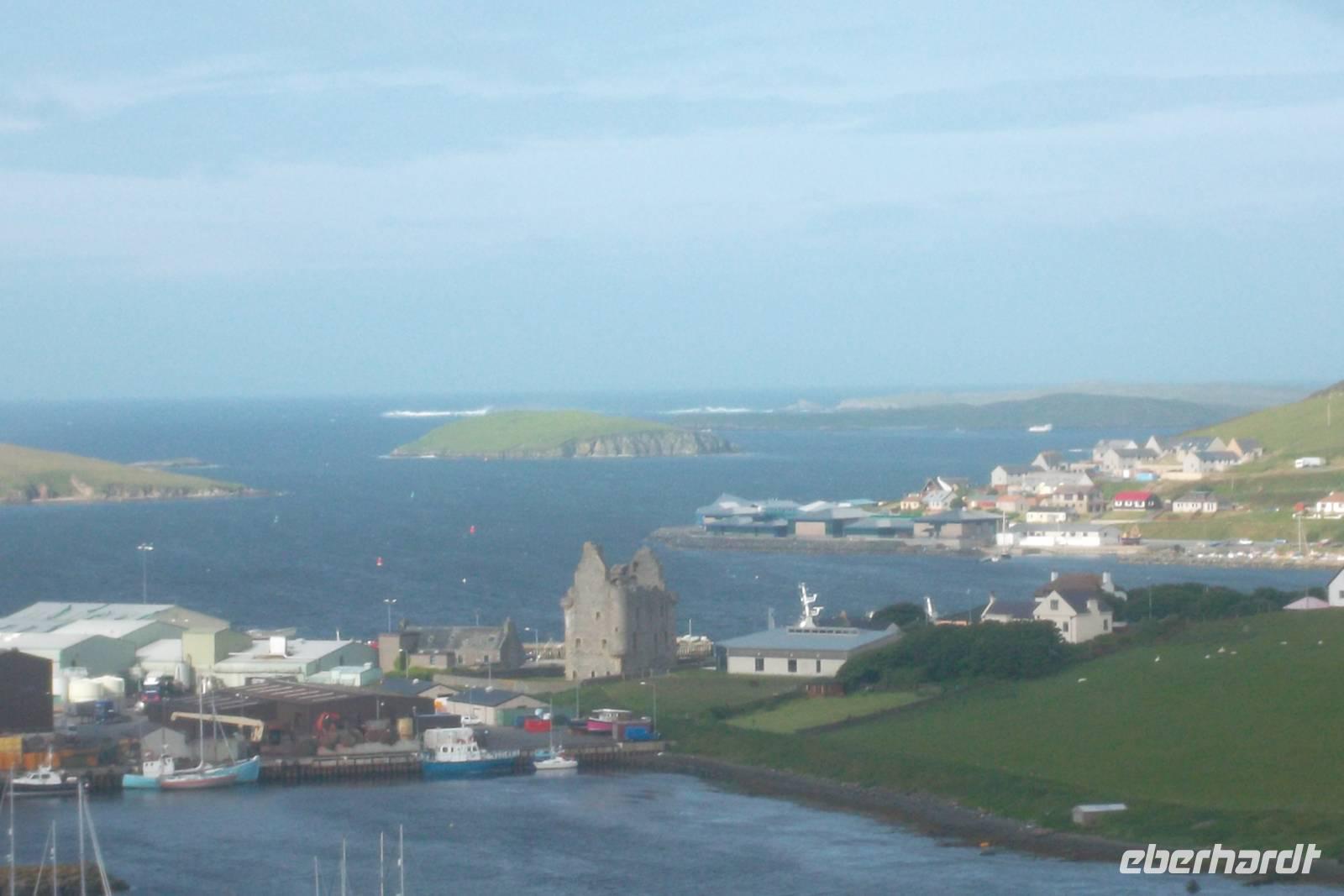 Gemütlich war das Frühstück auf dem Fährschiff, ehe wir per Bus das südliche Mainland der Shetlands erkundeten. „Hauptland" ist der Name der über 100km langen Hauptinsel, neben der es noch fast 100 andere gibt, von denen insgesamt 19 bewohnt sind und es auf etwa 28.000 Einwohner bringen. Die Shetlands sind fast so etwas wie ein „Außenposten" Europas, bereits im Eismeer und kurz vor Island gelegen. Als erstes besuchten wir dide ehemalige Hauptstadt der Shetlands, Scalloway", deren alte Burg frei zugänglich und sehr fotogren ist. Sie ist der besterhaltene Wehrbau der Inselgruppe und mit er Geschichte von Earl Patrick Stuart verbunden, der als infamer Bösewicht gilt und 1615 - wiewohl verwandt mit der Königsfamilie - von der schottischen Justiz hingerichtet wurde. Anschließend gab es einen ungeplanten Besuch in Old Scatness. Hier werden seit 1995 Ausgrabungen gemacht und beachtliche prähistorische Reste freigelegt. Bei einer liebevollen Führung durch Museumswärter Chris erfuhren wir einiges über die Rundhäuser der Eisenzeit und der piktischen Ära Schottlands.