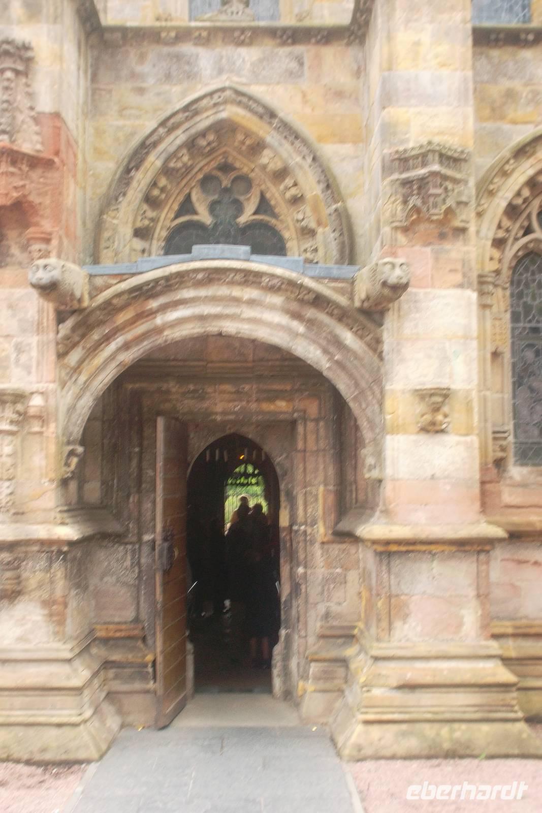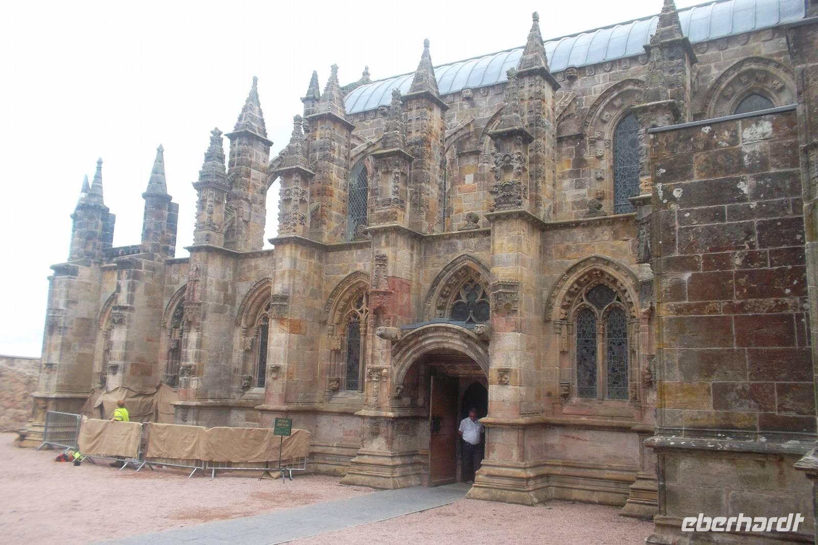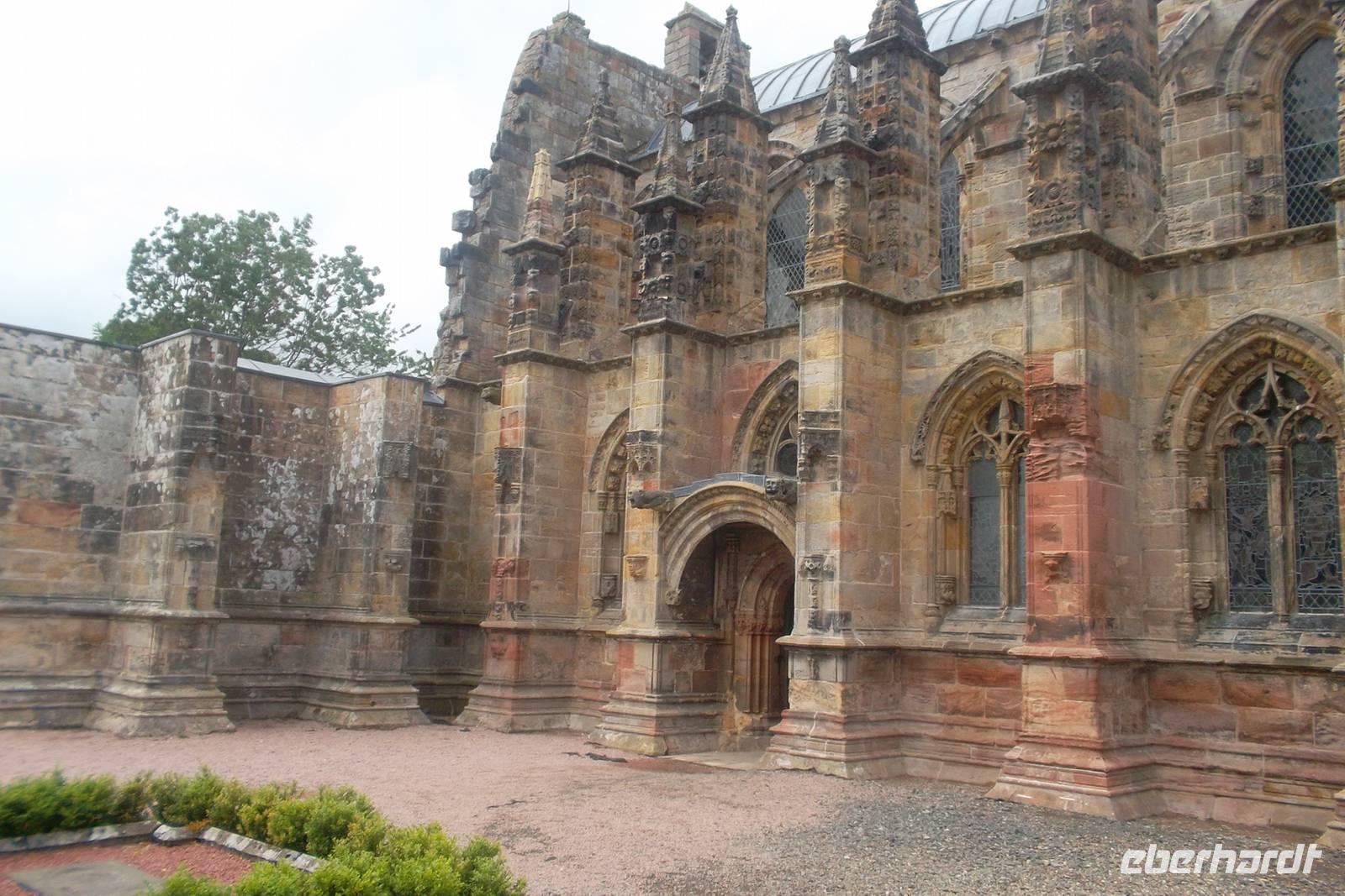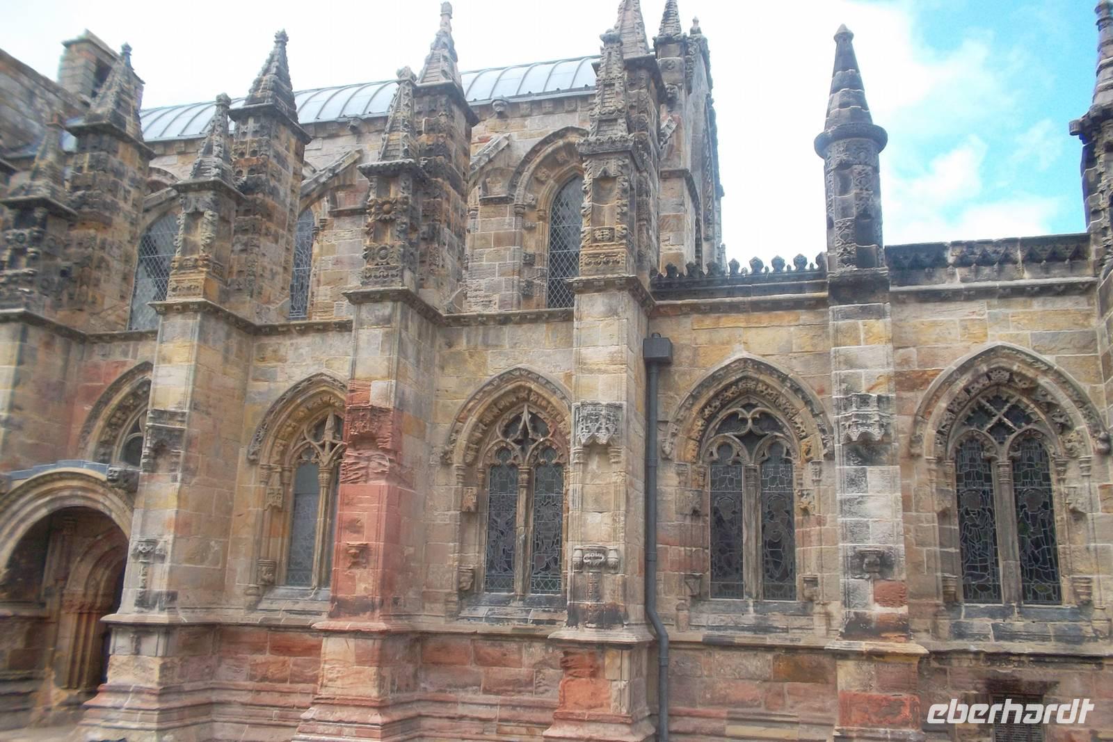 Danach gab es als weiteren Höhepunkt einen Besuch in der mit herrlichen Steinmetzarbeiten verzierten Kapelle von Roslyn. Wer Dan Browns Roman „Der da Vinci-Code" (deutsche Ausgabe unter dem Titel „Sakrileg") kennt, der kann sie sich als Aufbewahrungsort für den Heiligen Gral vorstellen. Auf jeden Fall ist die aus dem 15. Jahrhundert stammende Kapelle etwas ganz Besonderes - man sieht es an den Glasmalereien der Fenster ebenso wie an den Steinmetzarbeiten der Fensterrahmungen oder den Verzierungen der Säulen. Vom Dörfchen Roslyn aus war es nicht mehr weit zu unserem Hotel, das in einem Vorort von Peebles lag.