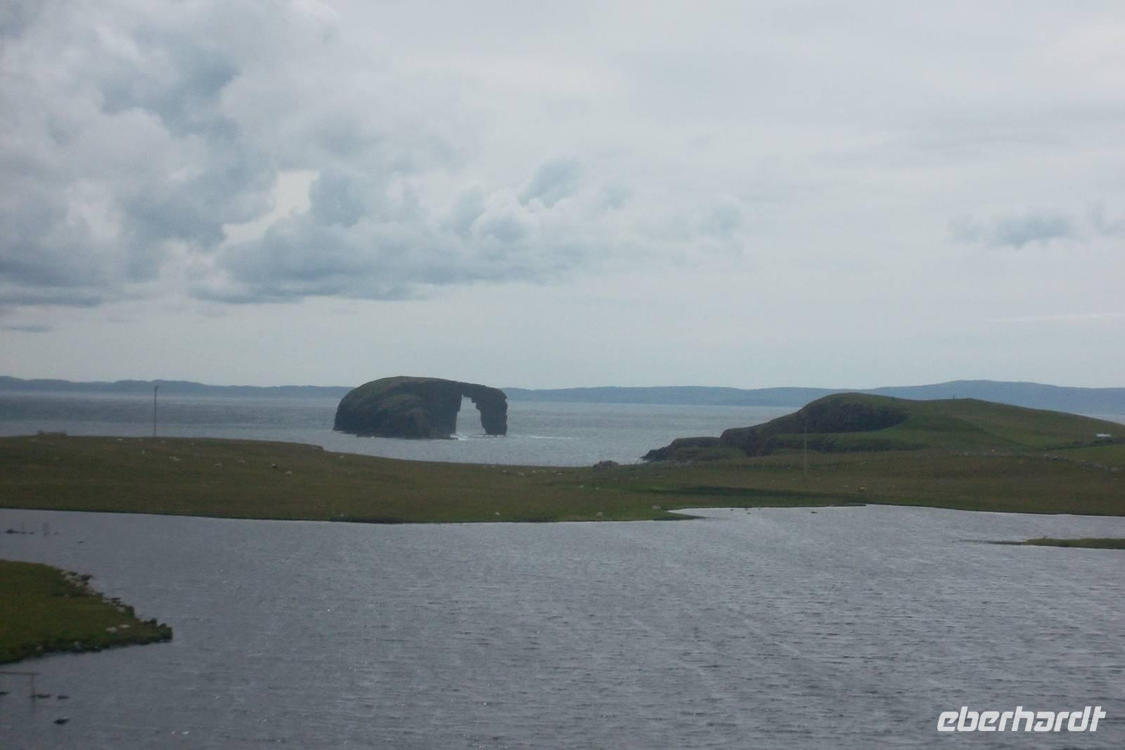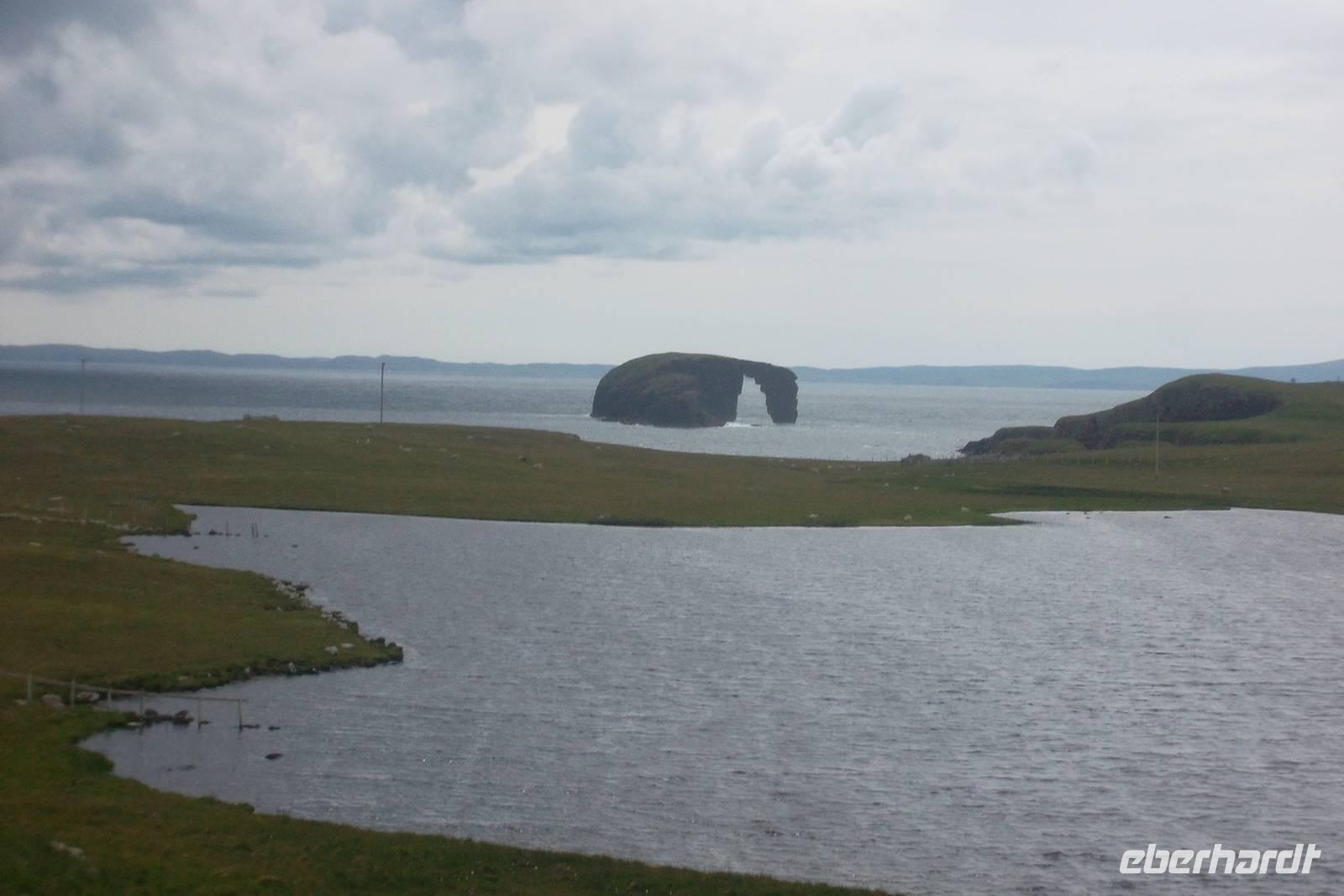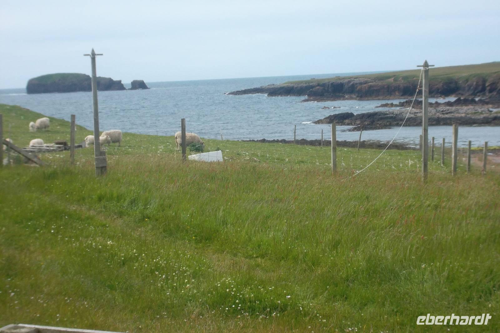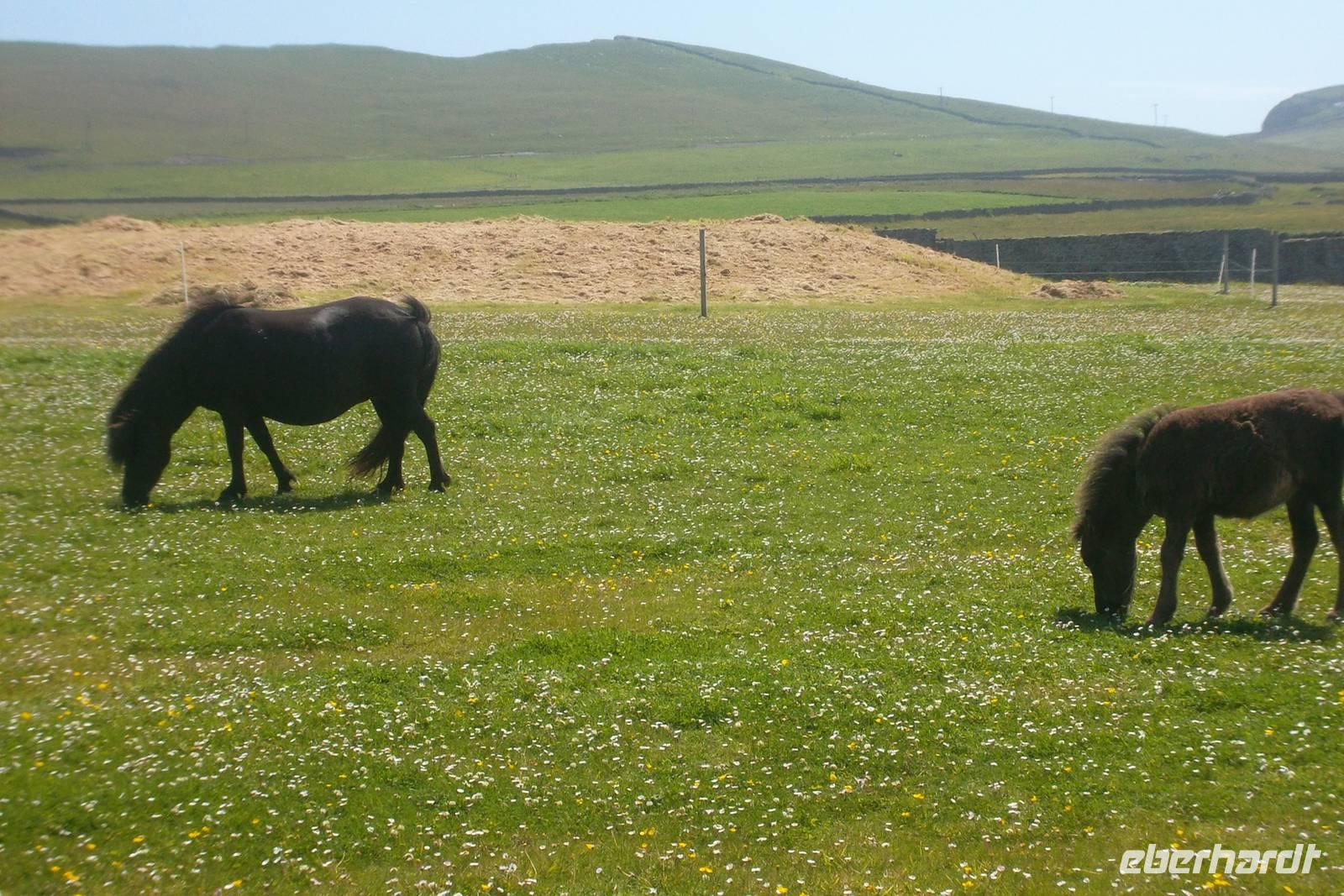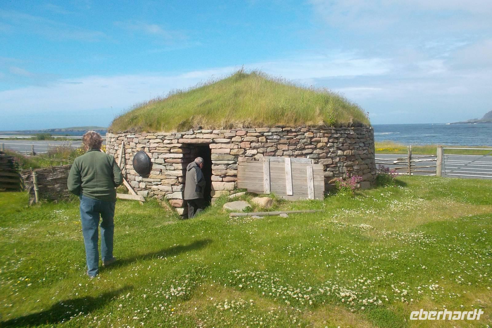 Noch einmal war der ganze Tag den Shetland-Inseln gewidmet. Heute fuhren wir zunächst nach Norden, durch immer einsamer werdende Landschaften. Erster Stopp war in Marvis Grind, einer interessanten Landenge, über die die Hauptstraße ins nördliche Mainland - Nordmavine ist der Name der Halbinsel - führt. Hier ist der Atlantik, repräsentiert durch eine Meeresbucht, nur einen Steinwurf weit von der zur Nordsee gehörenden Bucht entfernt - nirgendwo in Europa liegen diese beiden Meere so dicht nebeneinander. Von hier ging es weiter nördlich zur Halbinsel Eshaness, die den wildesten Teil der Shetlands darstellt. Vorbei an einsamen Gehöften, Torfmooren und riesigen Koppeln mit Schafen und mit Shetland-Ponies gelangten wir erst einmal zum Tangwick Haa Museum. .Liebevoll stellt man hier ein Sammelsurium von Alltagsdingen der Shetlands aus, zusammen mit Fotos der Bewohner, der herrlichen Natur und der unglaublichen Landschaften der Inselgruppe.