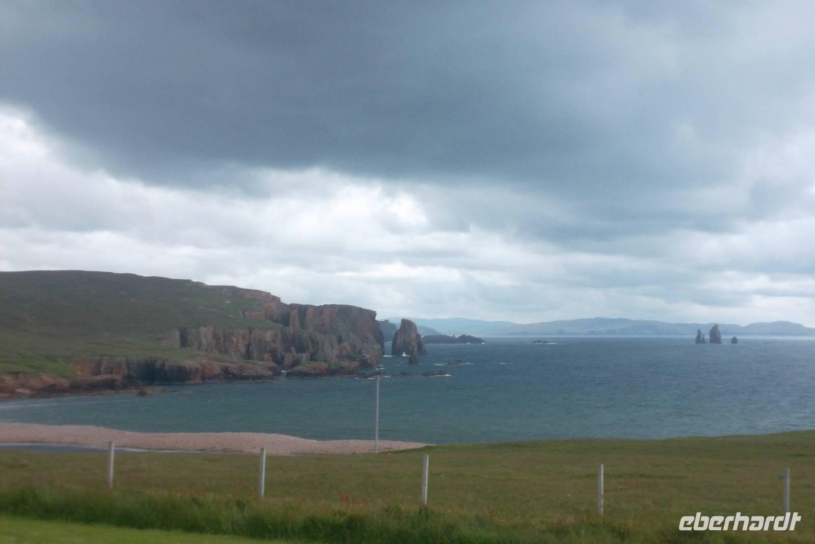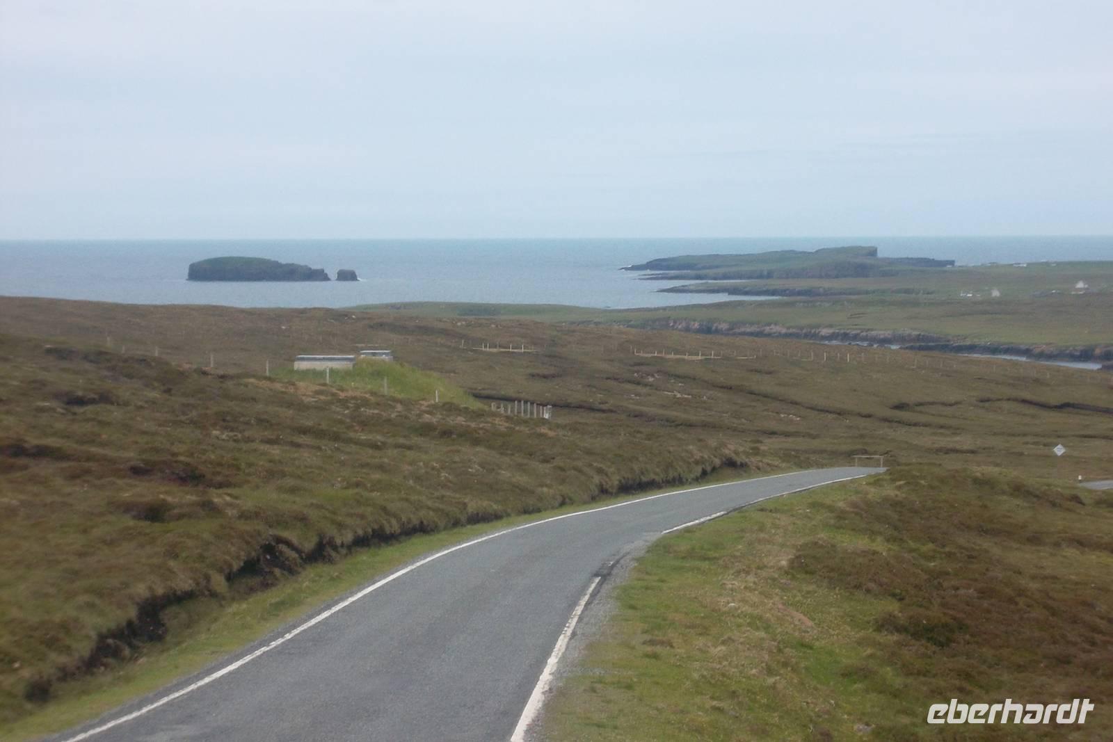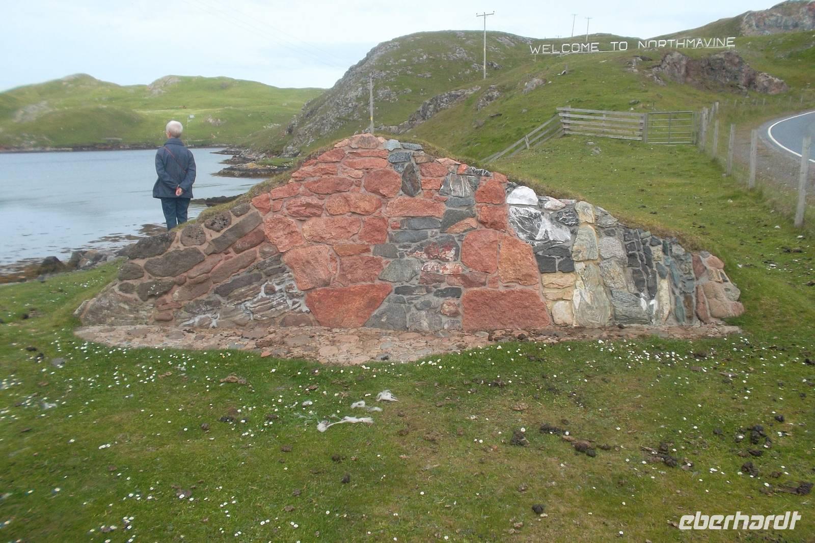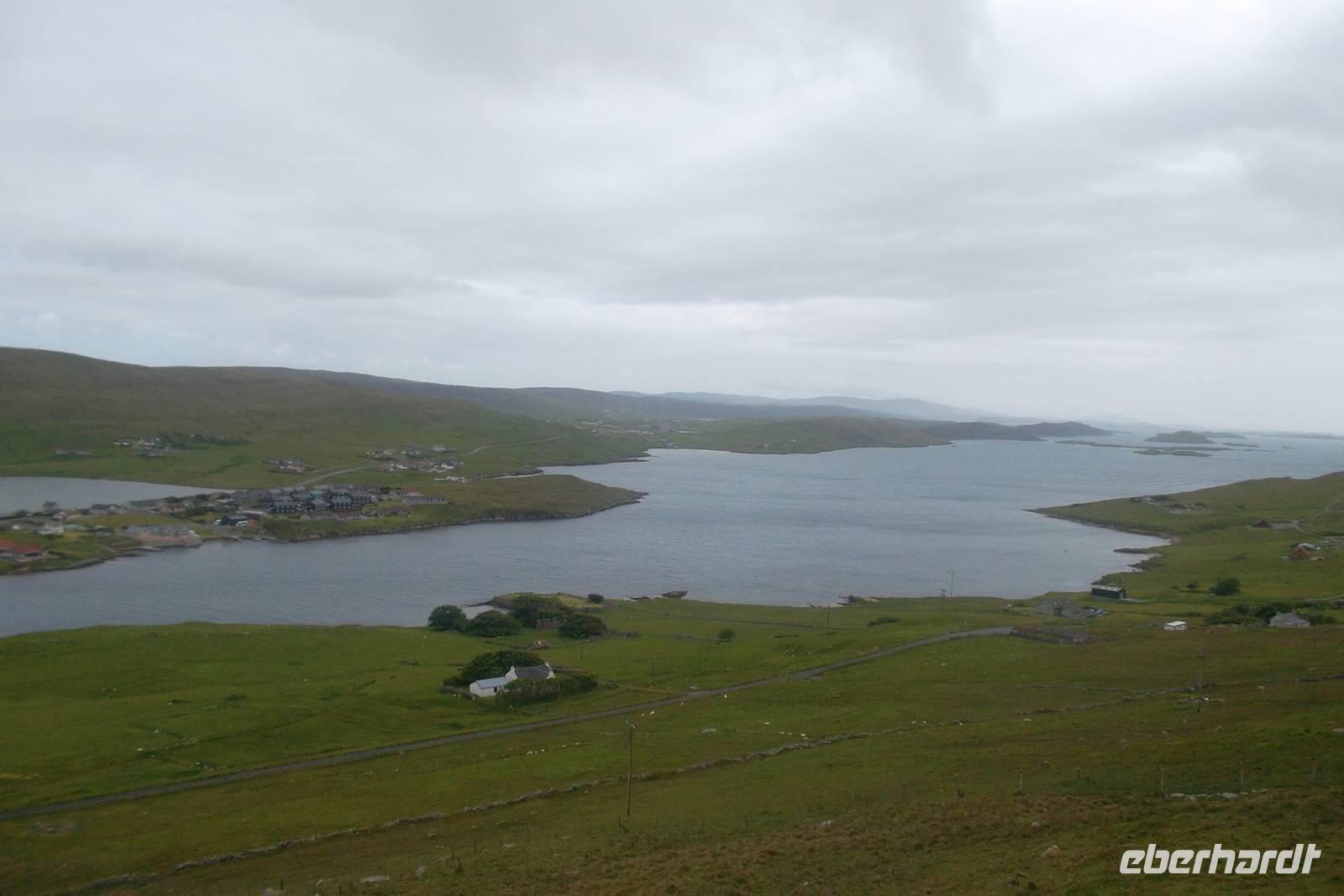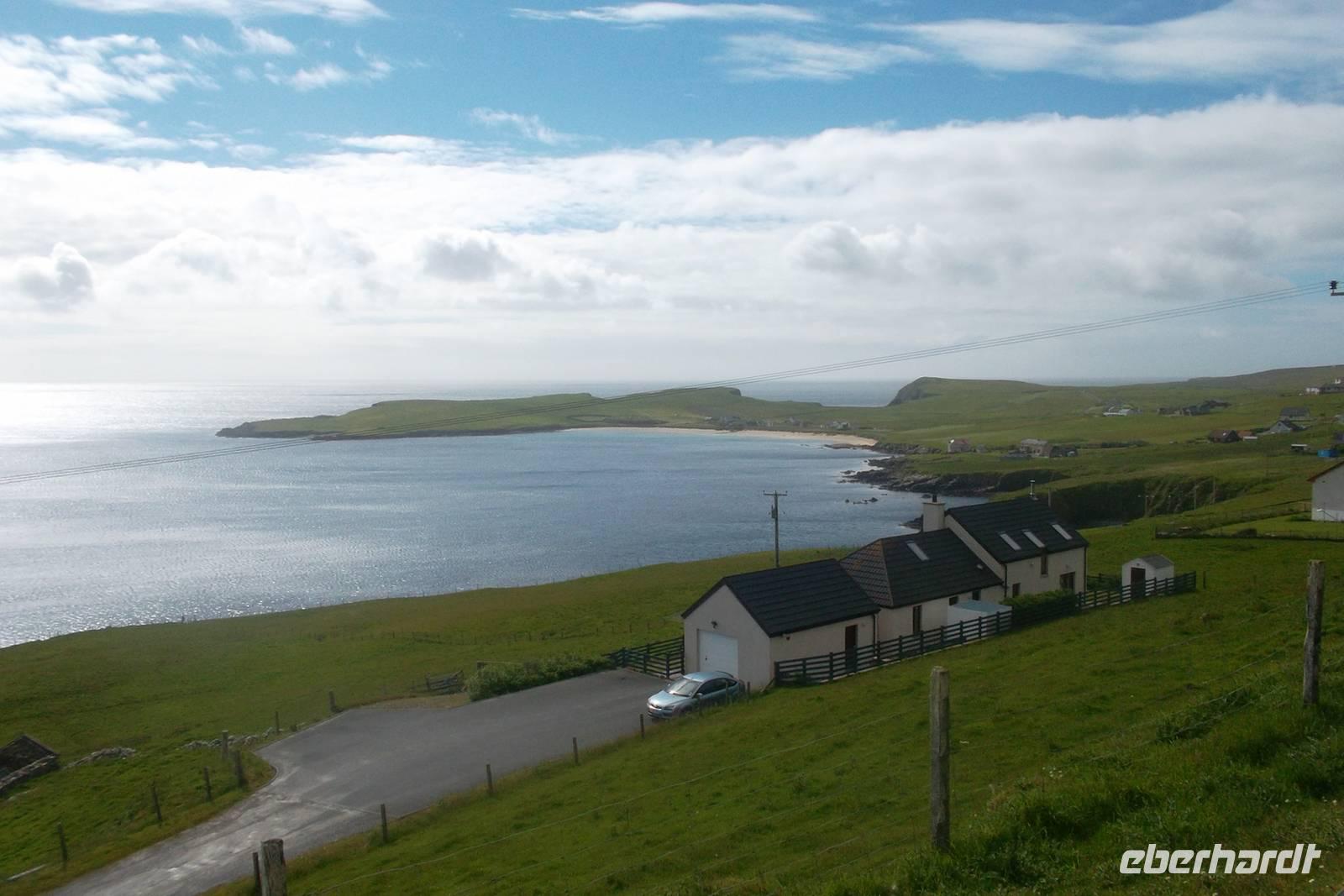 Noch einmal war der ganze Tag den Shetland-Inseln gewidmet. Heute fuhren wir zunächst nach Norden, durch immer einsamer werdende Landschaften. Erster Stopp war in Marvis Grind, einer interessanten Landenge, über die die Hauptstraße ins nördliche Mainland - Nordmavine ist der Name der Halbinsel - führt. Hier ist der Atlantik, repräsentiert durch eine Meeresbucht, nur einen Steinwurf weit von der zur Nordsee gehörenden Bucht entfernt - nirgendwo in Europa liegen diese beiden Meere so dicht nebeneinander. Von hier ging es weiter nördlich zur Halbinsel Eshaness, die den wildesten Teil der Shetlands darstellt. Vorbei an einsamen Gehöften, Torfmooren und riesigen Koppeln mit Schafen und mit Shetland-Ponies gelangten wir erst einmal zum Tangwick Haa Museum. .Liebevoll stellt man hier ein Sammelsurium von Alltagsdingen der Shetlands aus, zusammen mit Fotos der Bewohner, der herrlichen Natur und der unglaublichen Landschaften der Inselgruppe.