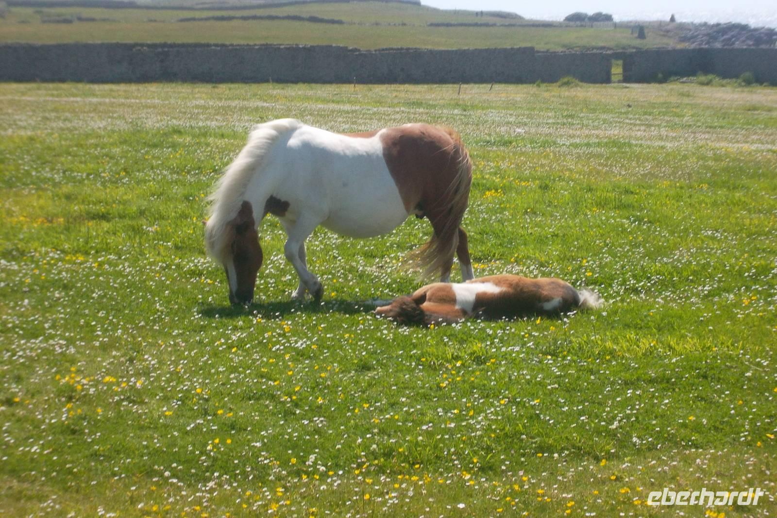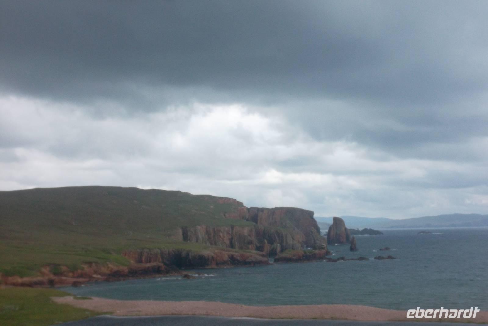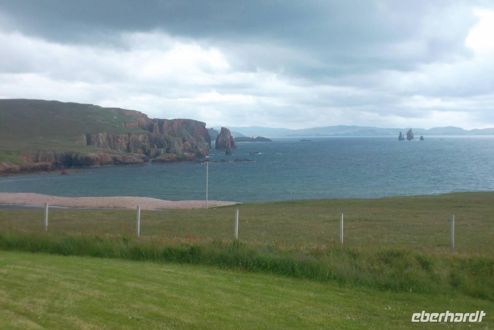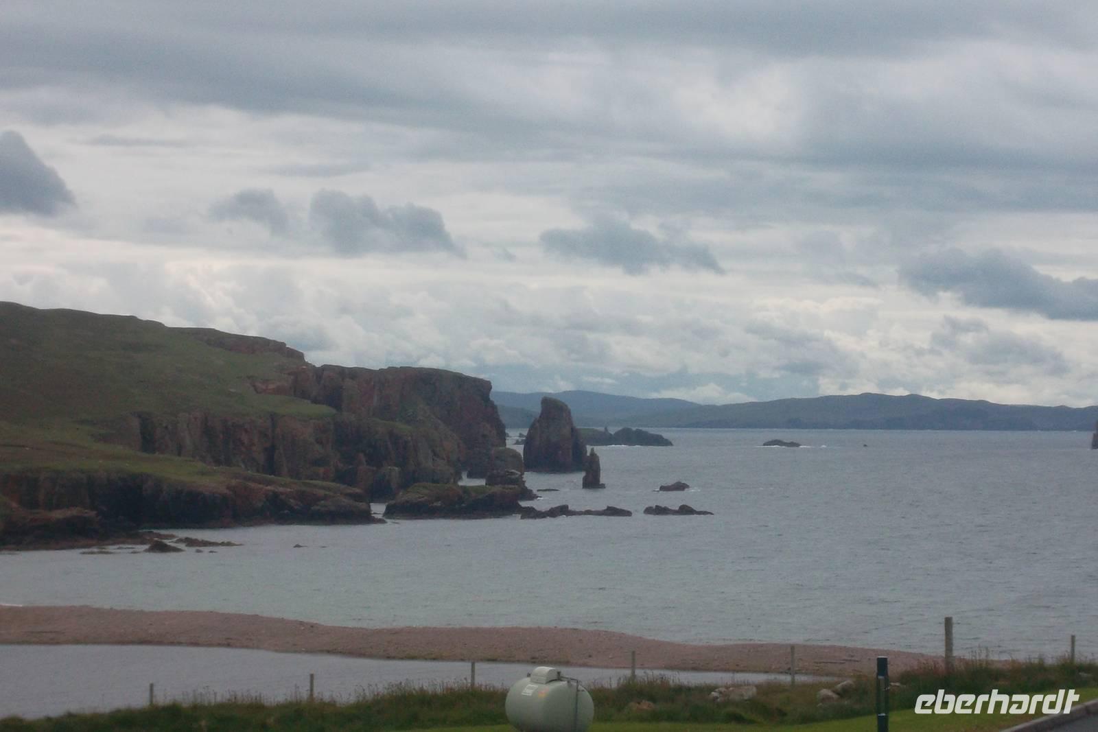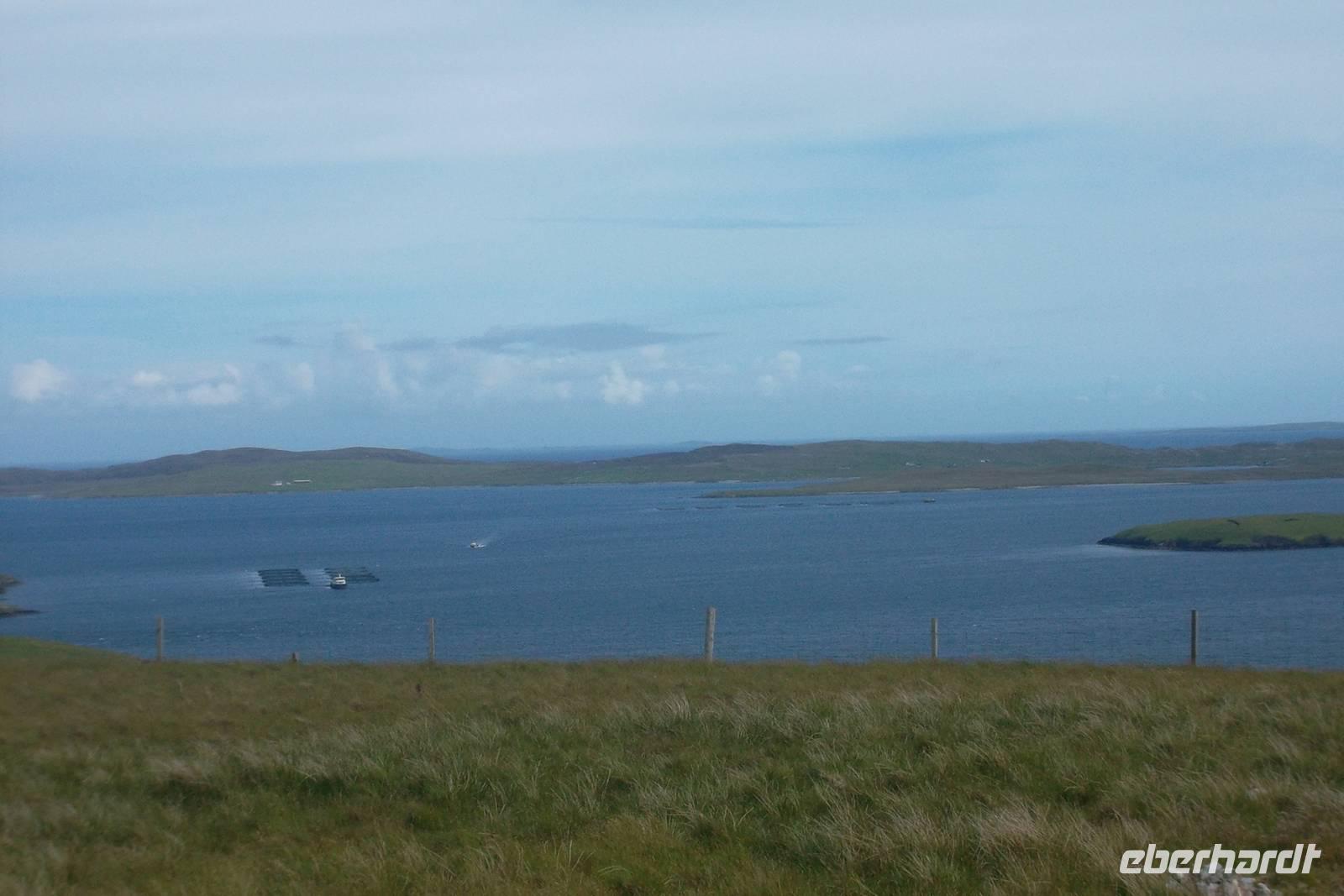 Noch einmal war der ganze Tag den Shetland-Inseln gewidmet. Heute fuhren wir zunächst nach Norden, durch immer einsamer werdende Landschaften. Erster Stopp war in Marvis Grind, einer interessanten Landenge, über die die Hauptstraße ins nördliche Mainland - Nordmavine ist der Name der Halbinsel - führt. Hier ist der Atlantik, repräsentiert durch eine Meeresbucht, nur einen Steinwurf weit von der zur Nordsee gehörenden Bucht entfernt - nirgendwo in Europa liegen diese beiden Meere so dicht nebeneinander. Von hier ging es weiter nördlich zur Halbinsel Eshaness, die den wildesten Teil der Shetlands darstellt. Vorbei an einsamen Gehöften, Torfmooren und riesigen Koppeln mit Schafen und mit Shetland-Ponies gelangten wir erst einmal zum Tangwick Haa Museum. .Liebevoll stellt man hier ein Sammelsurium von Alltagsdingen der Shetlands aus, zusammen mit Fotos der Bewohner, der herrlichen Natur und der unglaublichen Landschaften der Inselgruppe.